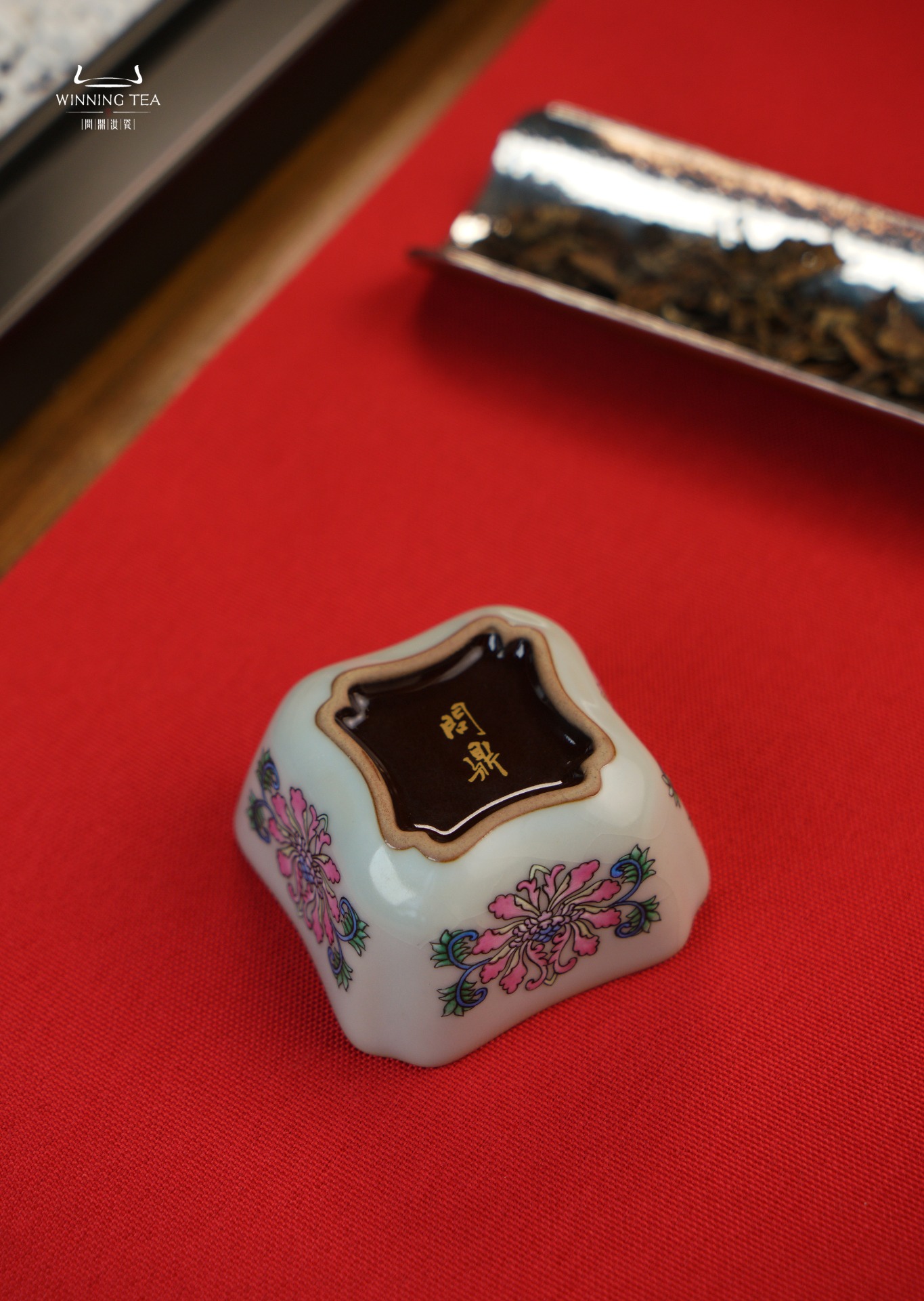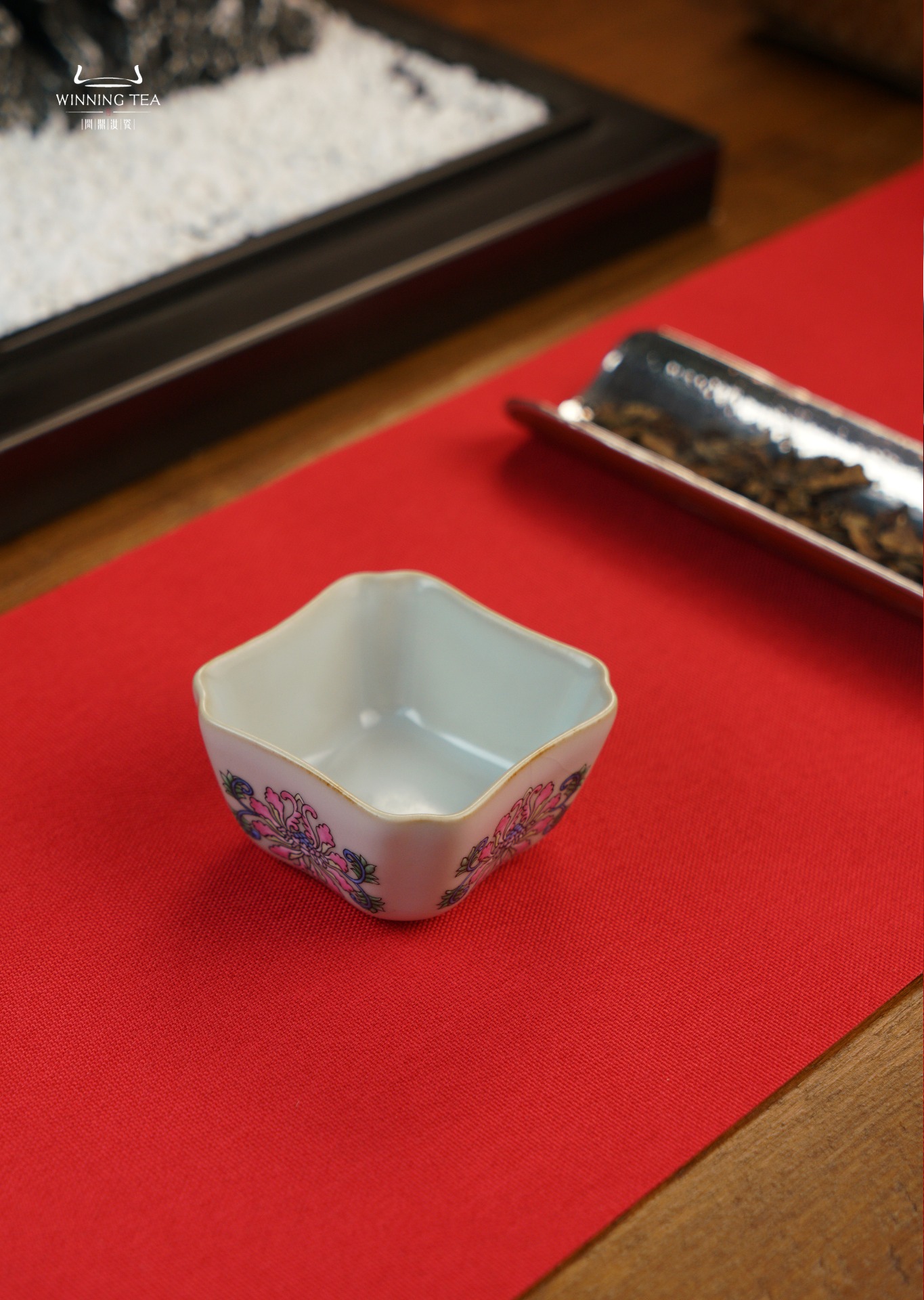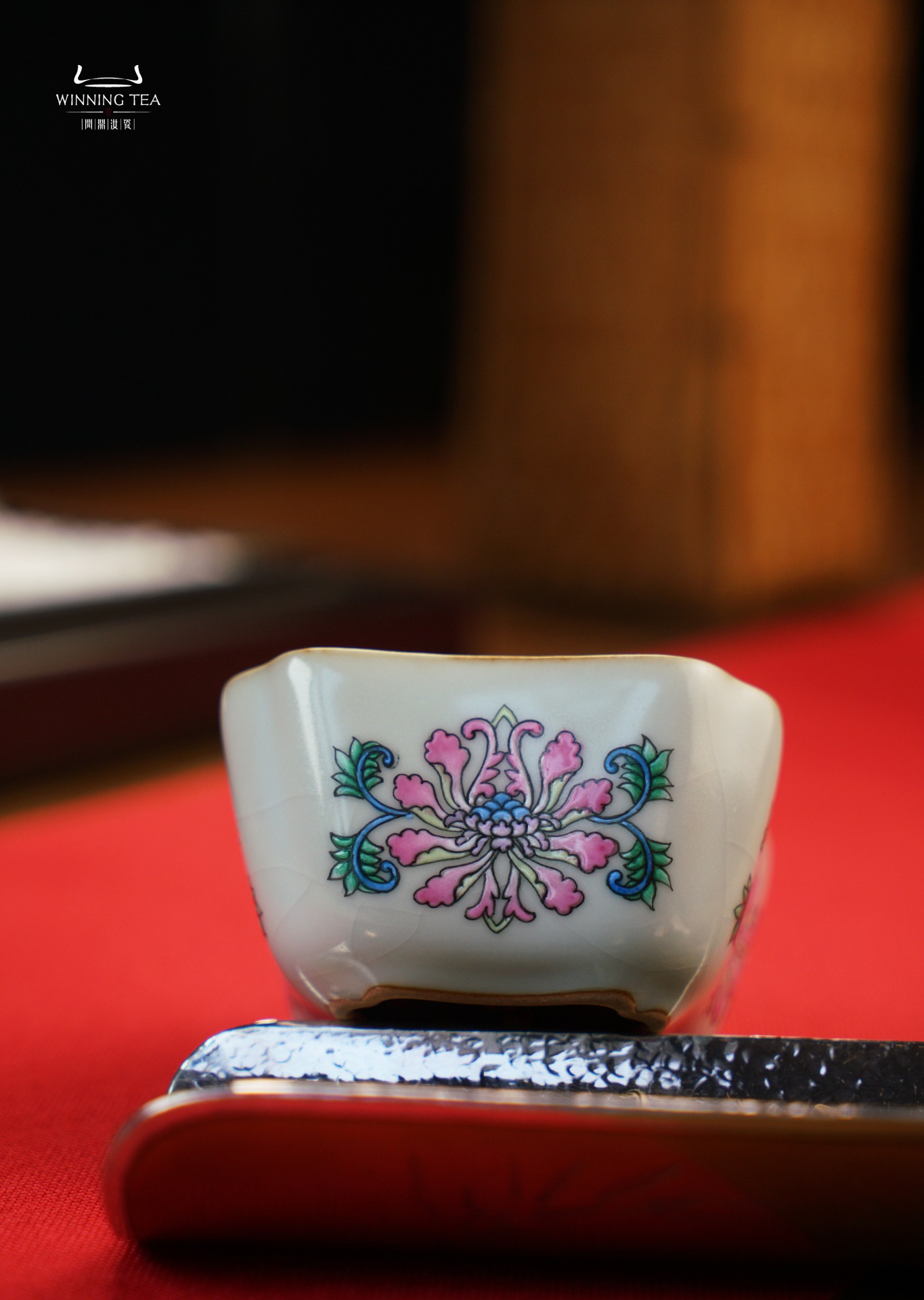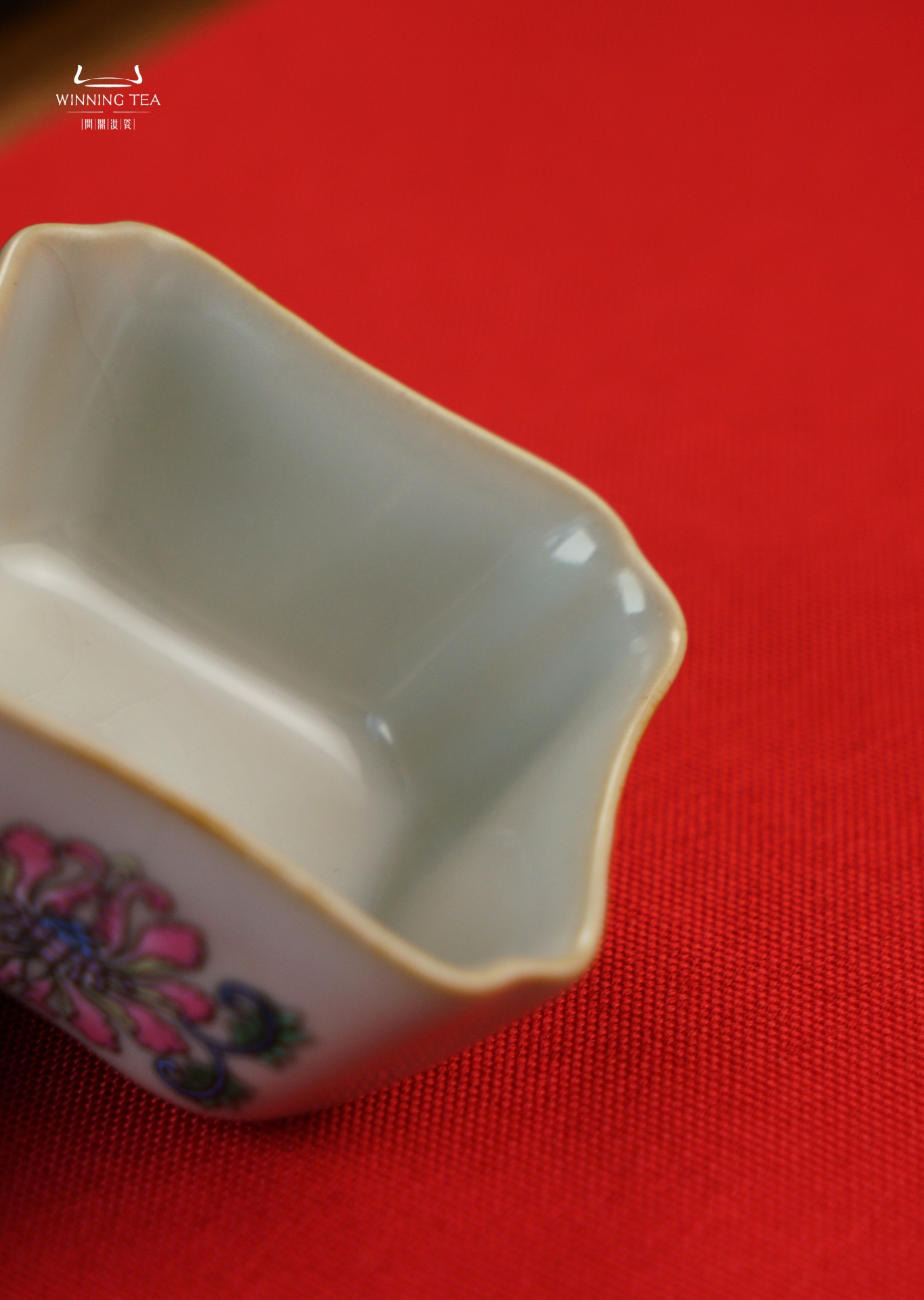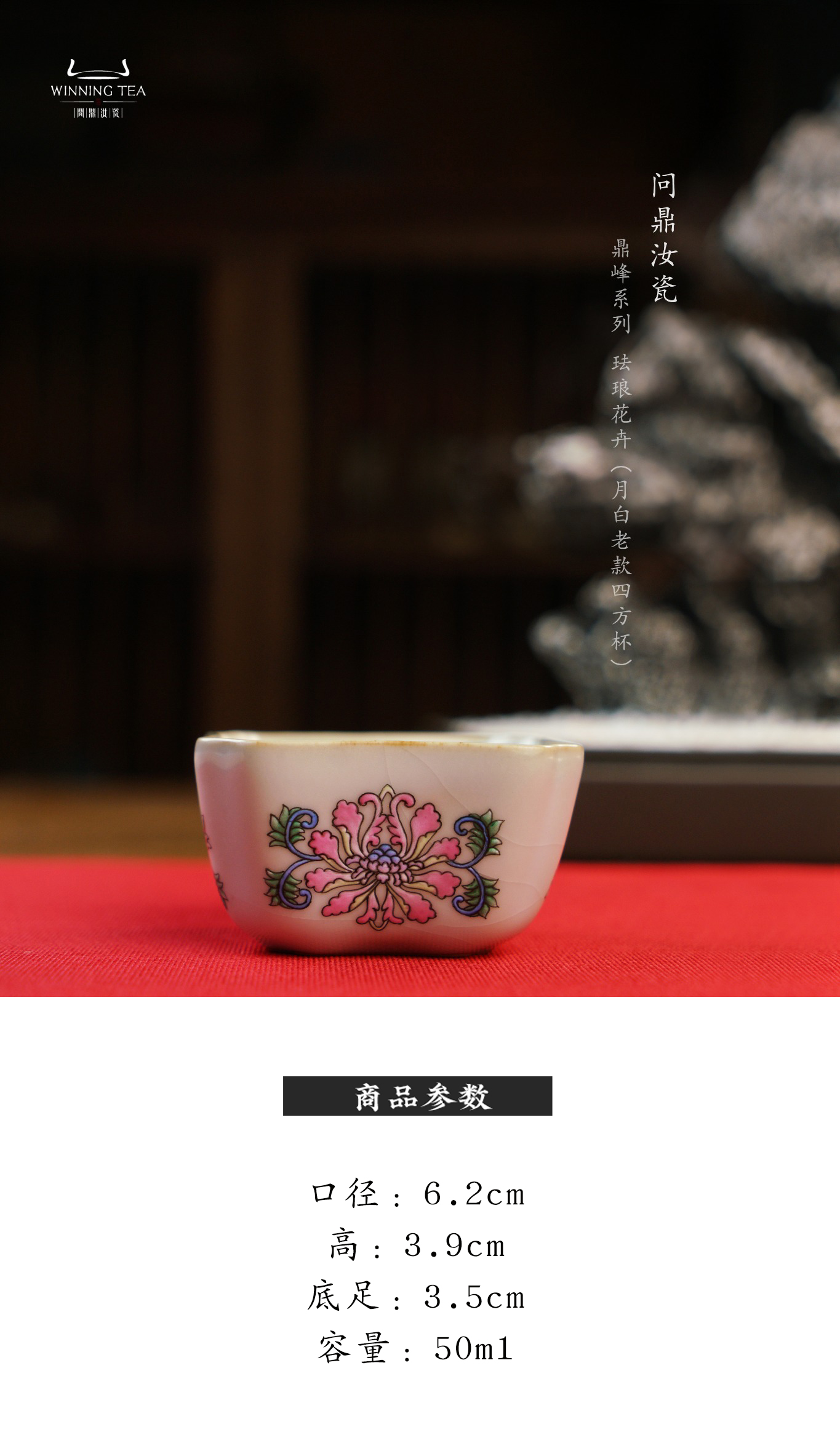 问鼎汝瓷鼎峰系列月白老款四方杯(绘画珐琅花卉)