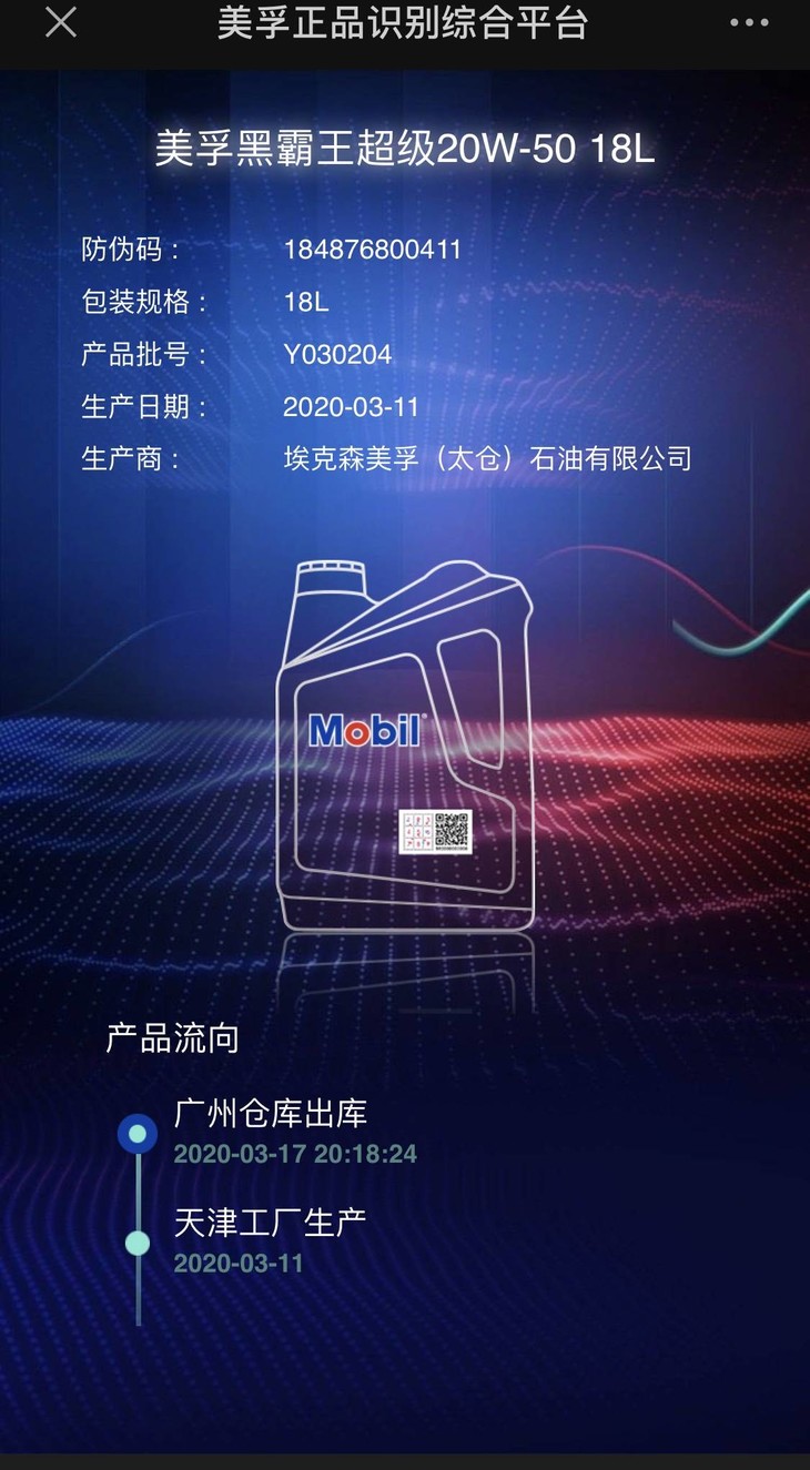 用手机微信打开扫一扫,扫描此正品二维码后即可进入以下界面,点击“产品追溯”即可查看正品油的渠道去处。以下为车庸道正品油样板。