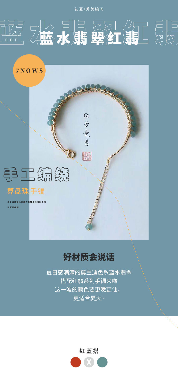 初夏秀美腕间·手工编绕蓝水翡翠红翡算盘珠手镯