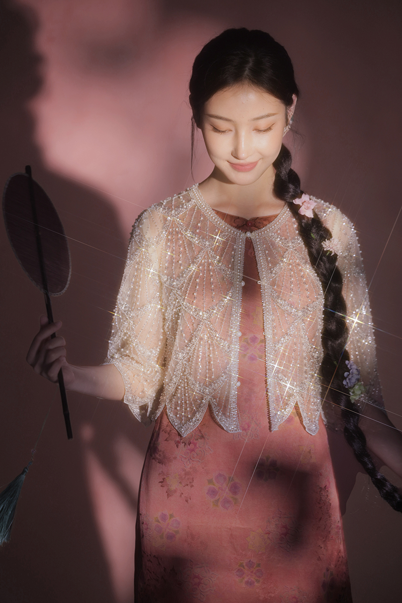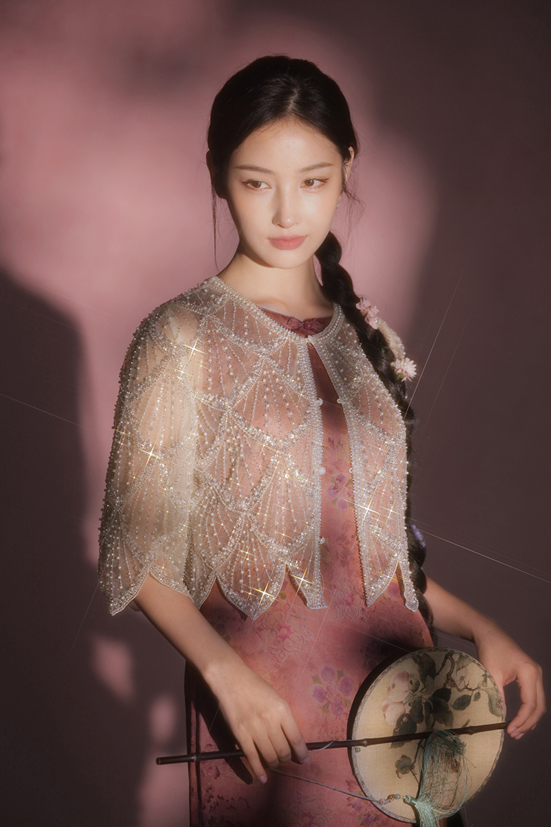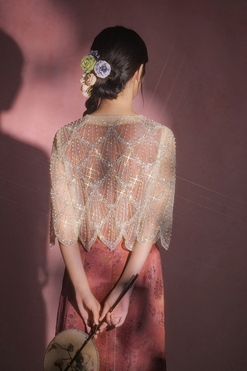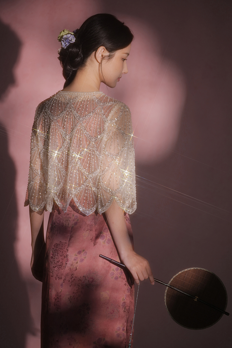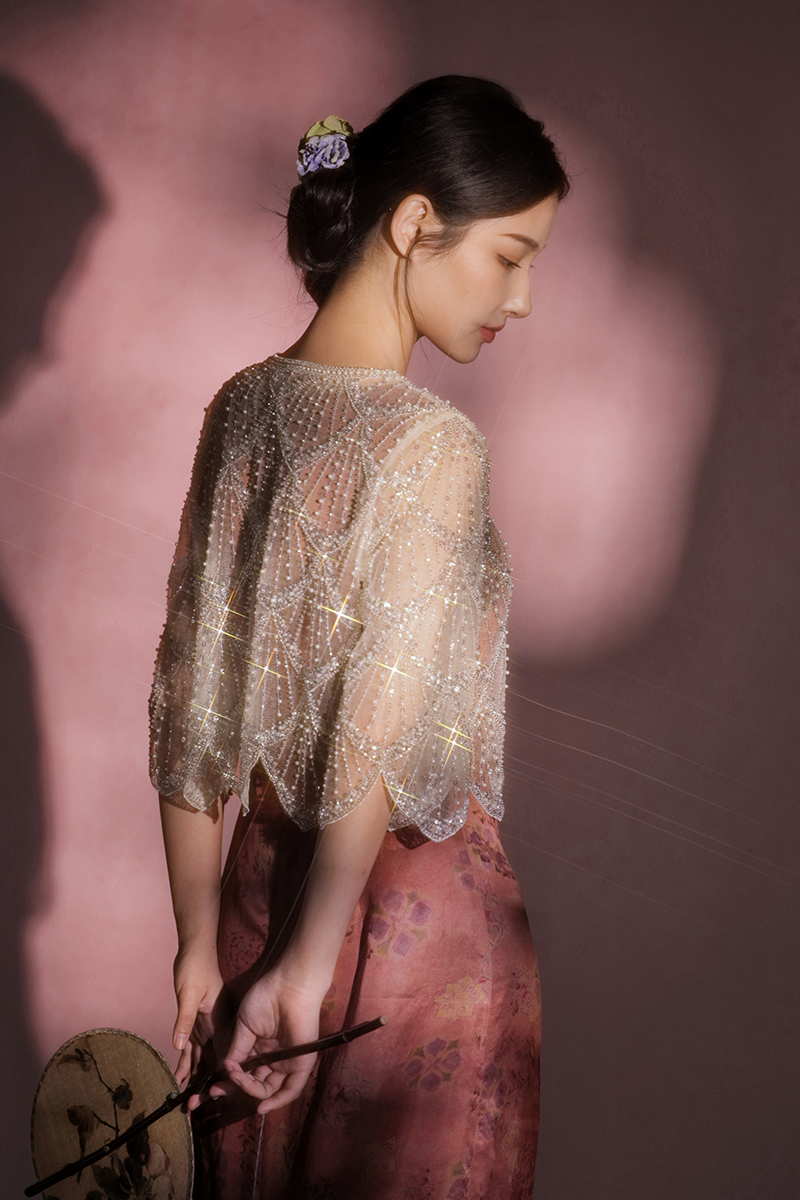 它适合披在肩头赴一场夏夜宴会,也适合裹着它,在午后的花园里喝一杯清茶。如月光织就的珠纱,披一身古典与贵气。
