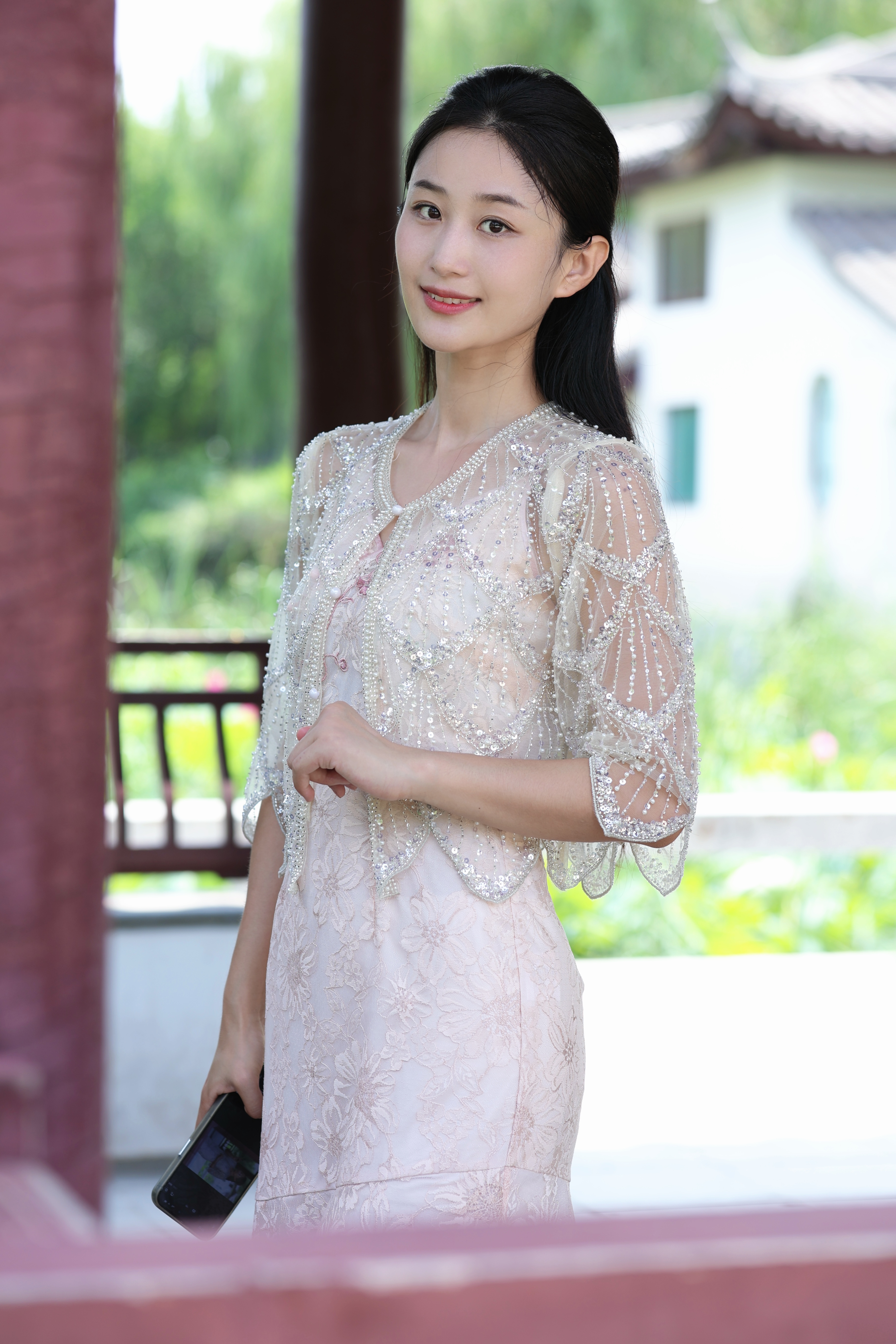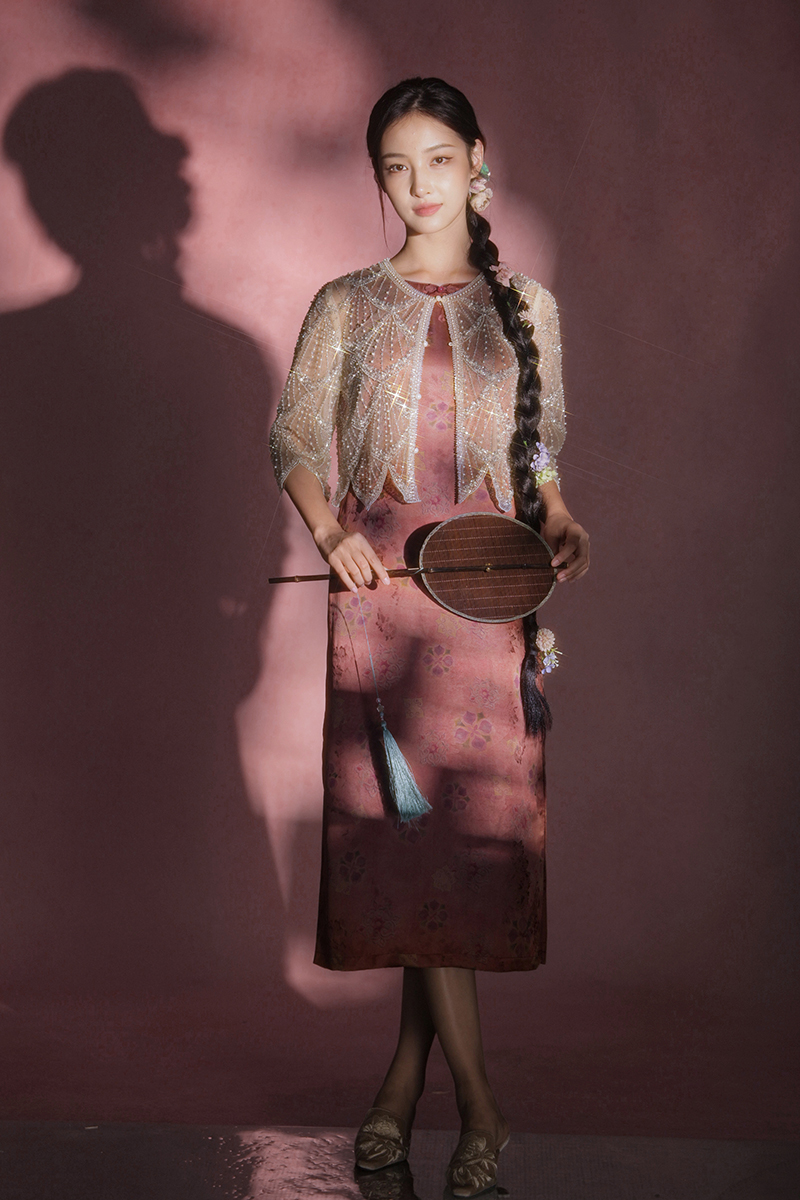 奶白珠纱朦胧婉约,朱砂色真丝浓郁典雅,一明一暗,一轻一重,可不就是古画中走出的美人。