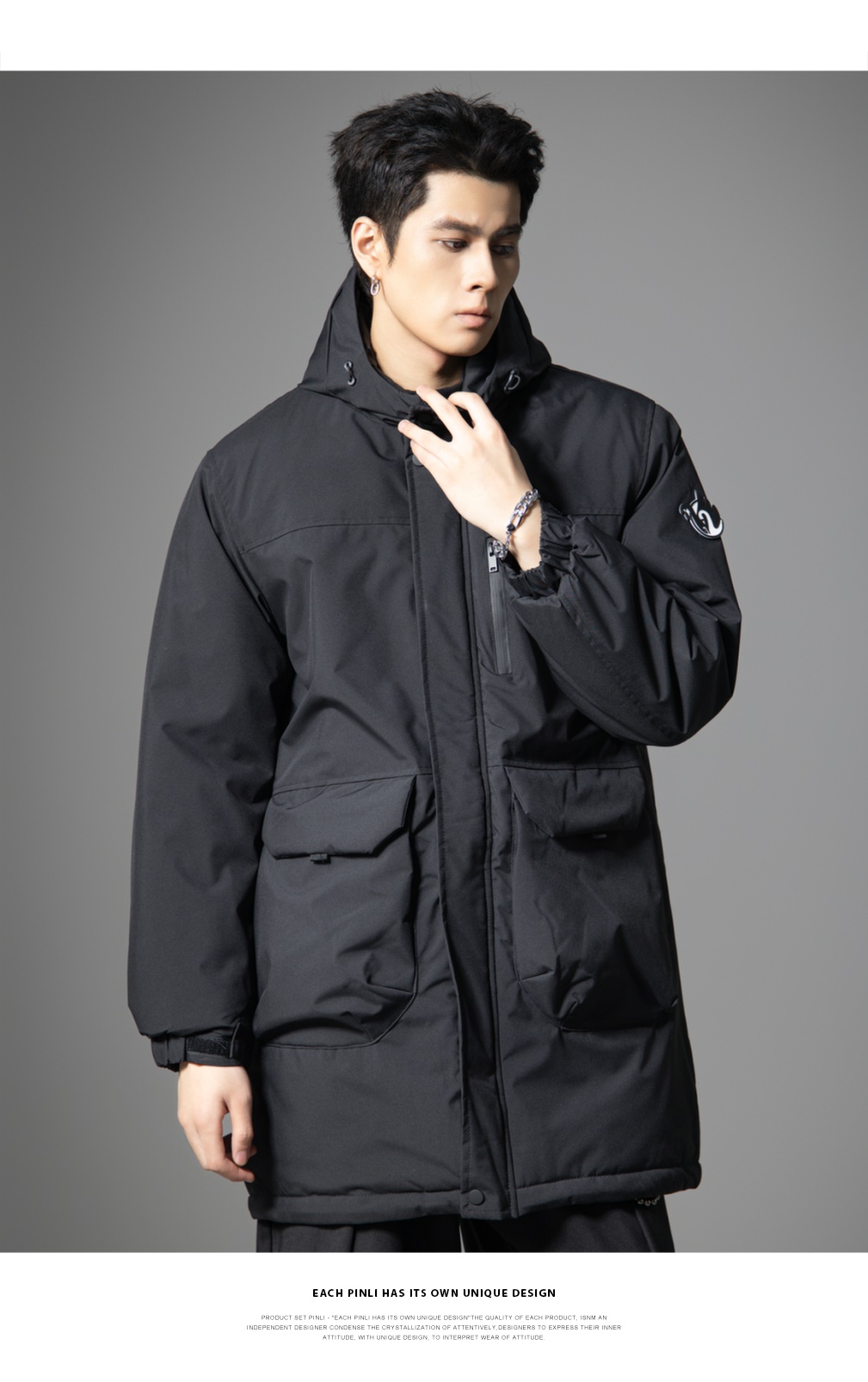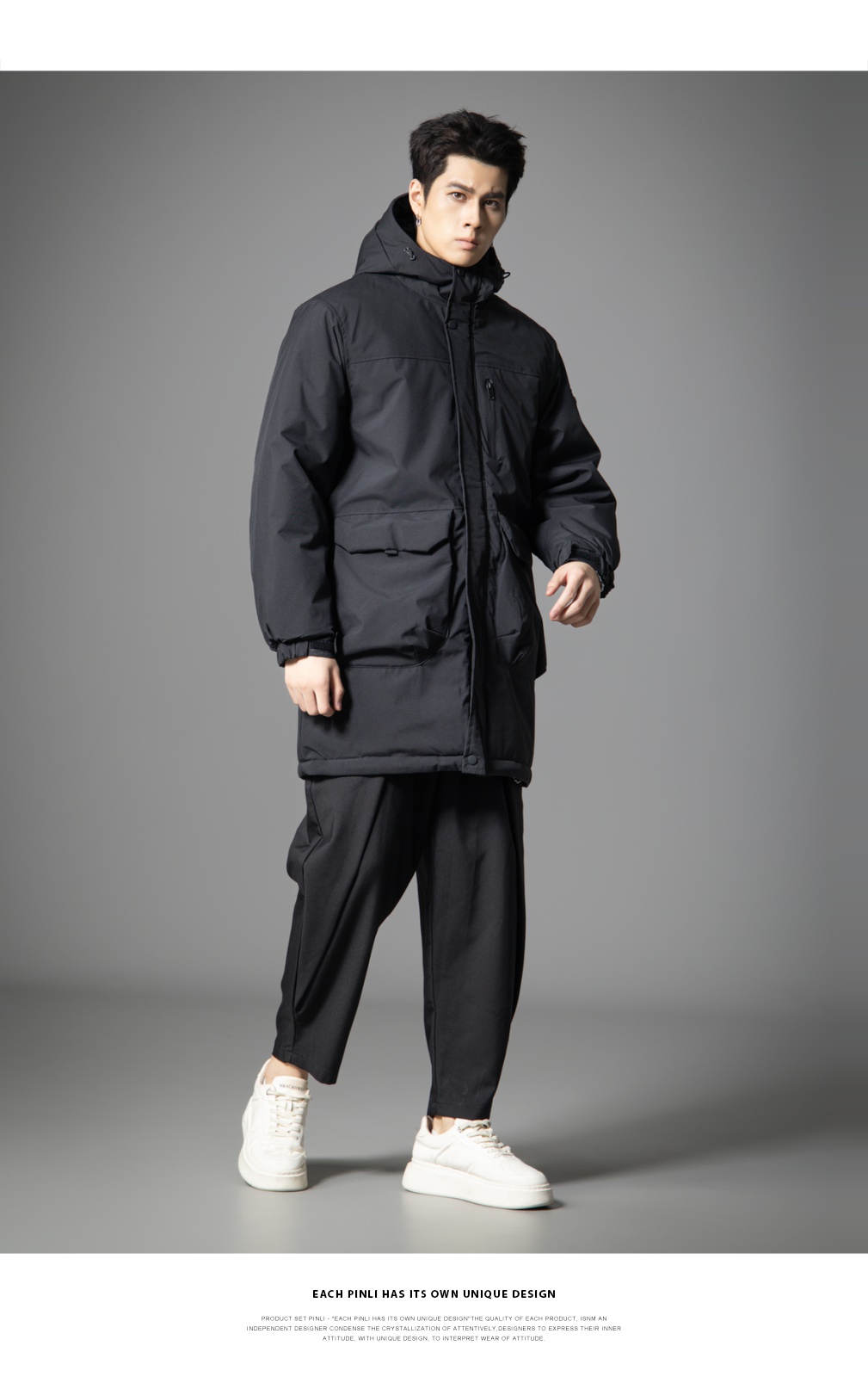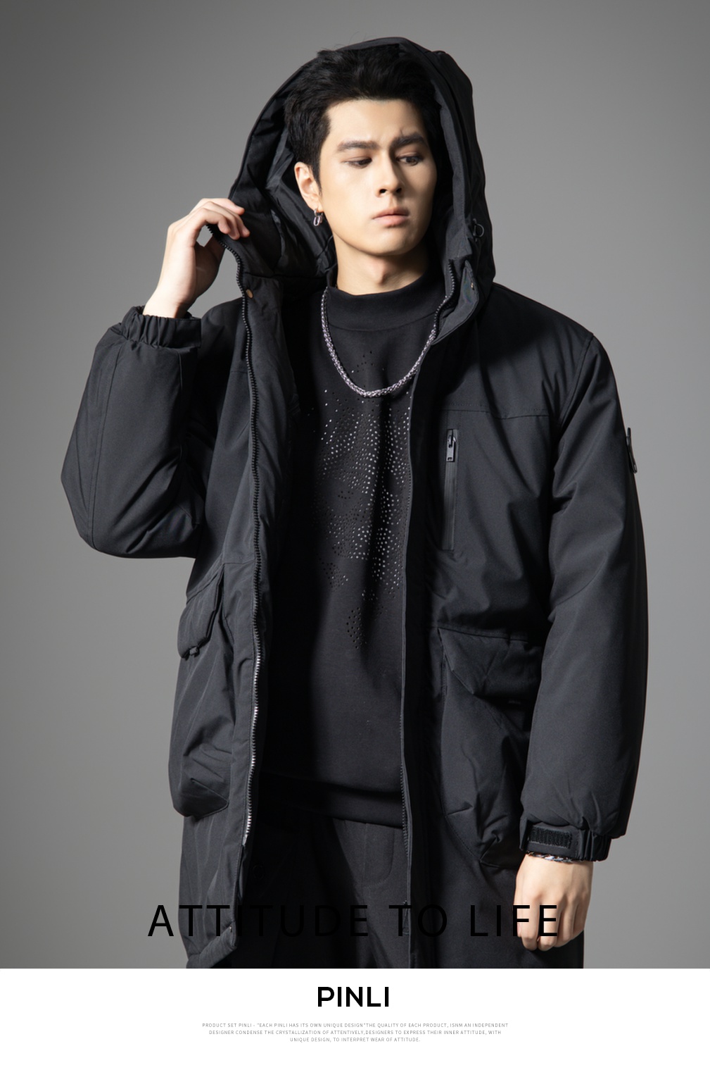 PINLI品立2025冬季新款工装大口袋长款棉衣男士宽松连帽棉服外套GD253105168