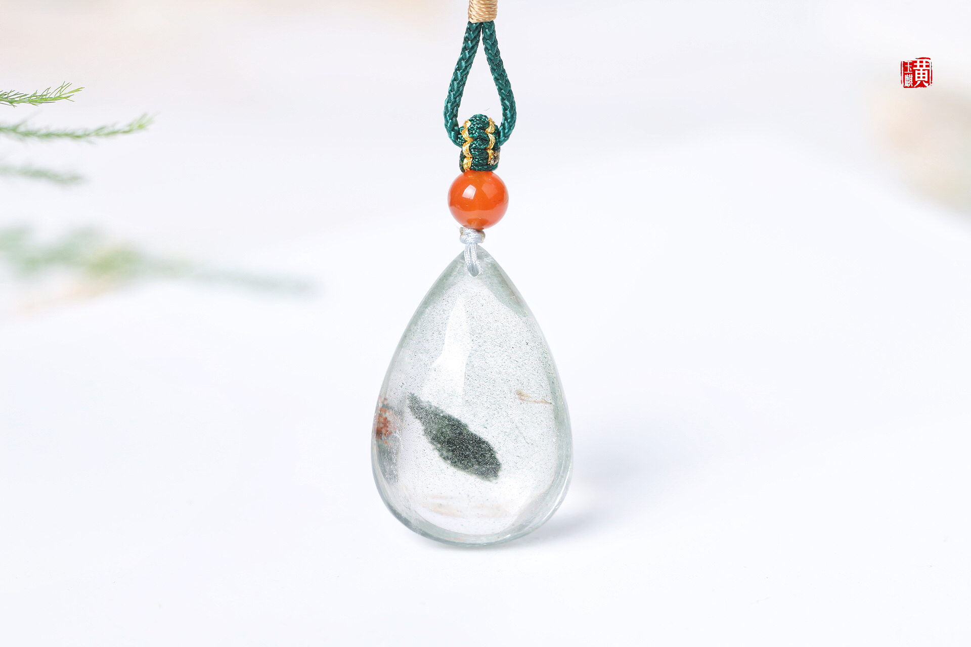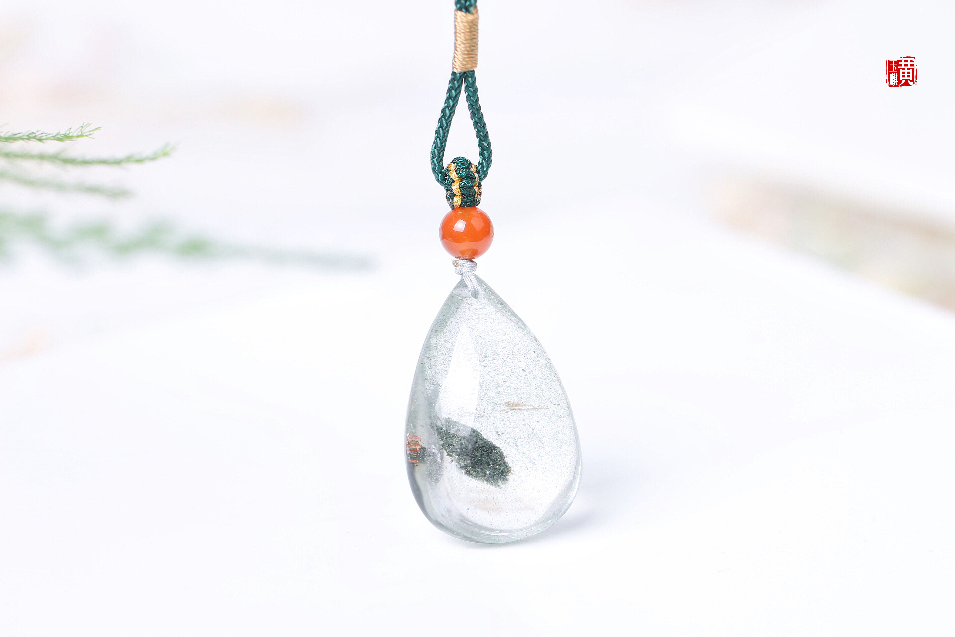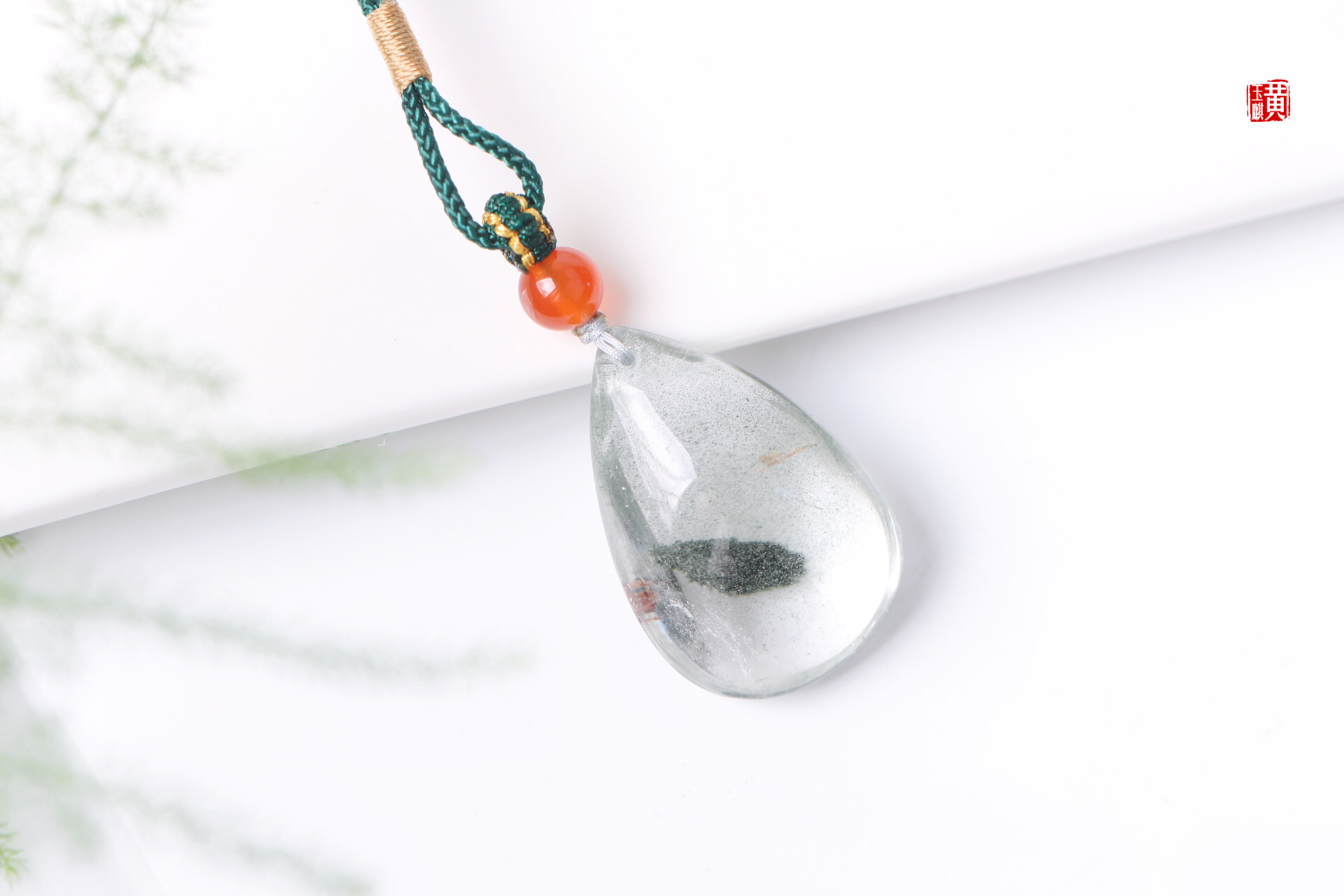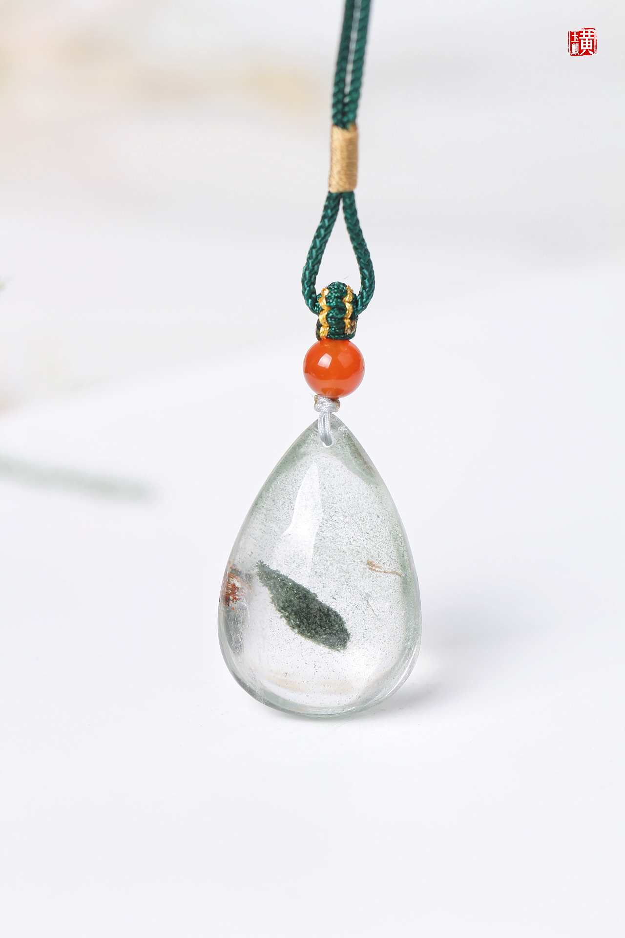 绿幽灵水晶吊坠,饱满的水滴形,晶莹通透,内含的绿幽灵像一片绿叶,很有特色,寓意财富汇聚、事业有成。
