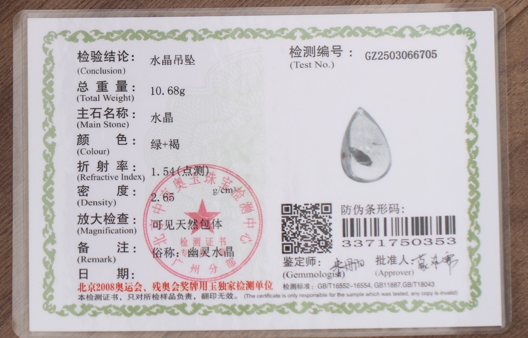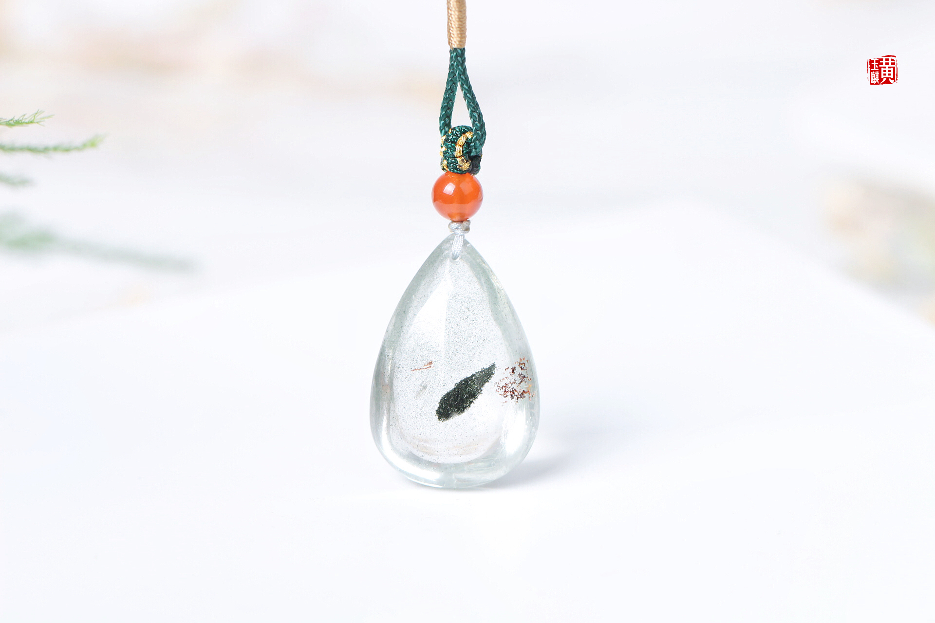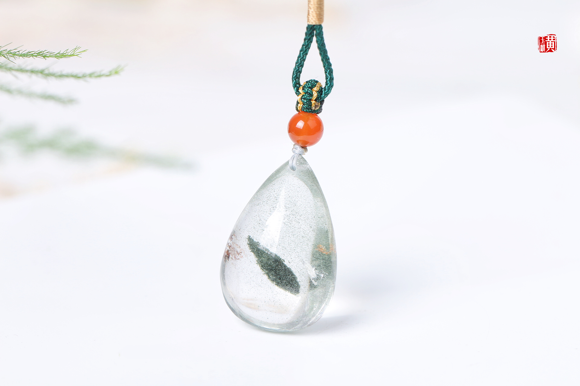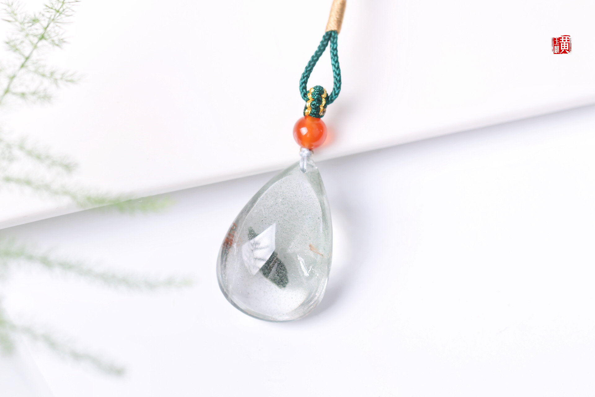 绿幽灵水晶吊坠,饱满的水滴形,晶莹通透,内含的绿幽灵像一片绿叶,很有特色,寓意财富汇聚、事业有成。