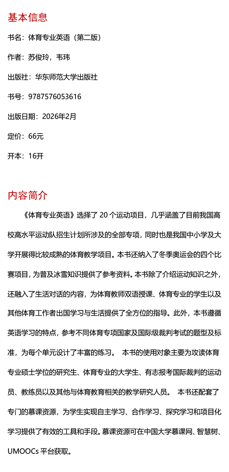 体育专业英语 第二版 体育专业硕士研究生教材 苏俊玲 韦玮