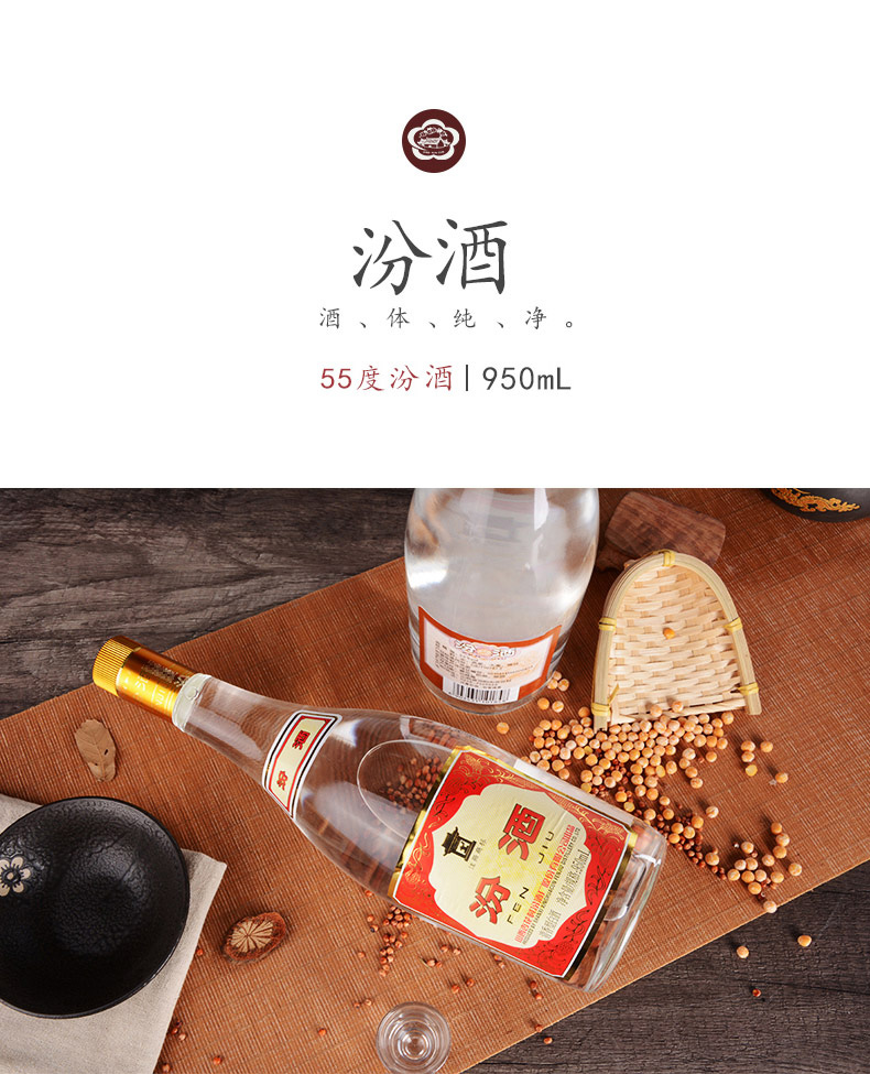 山西汾酒杏花村酒 玻汾酒55度 黄盖汾酒950ml清香型国产白酒