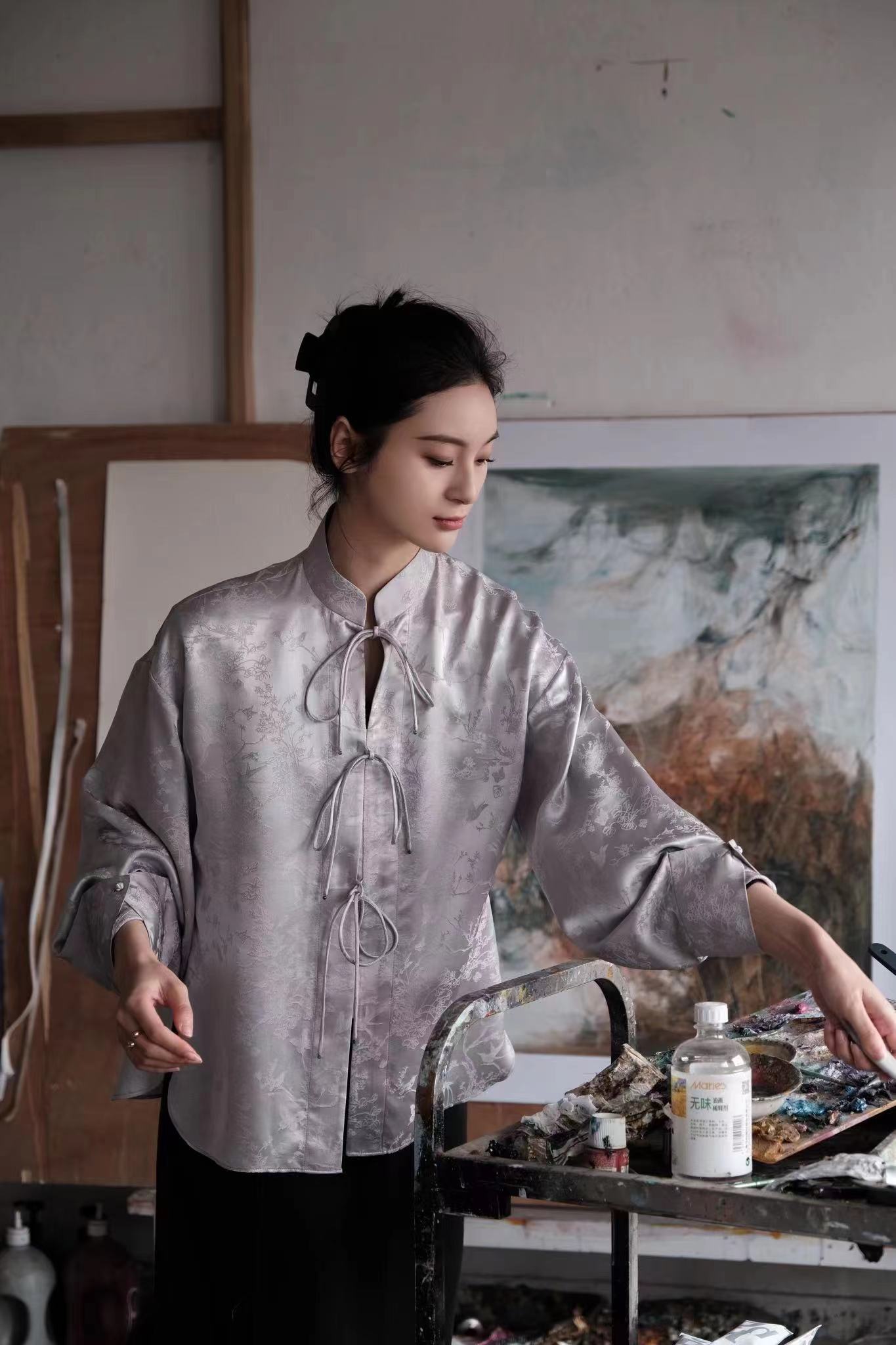 盛唐牡丹 | 粉色蝶恋花/紫色喜鹊缠枝真丝提花褶皱上衣