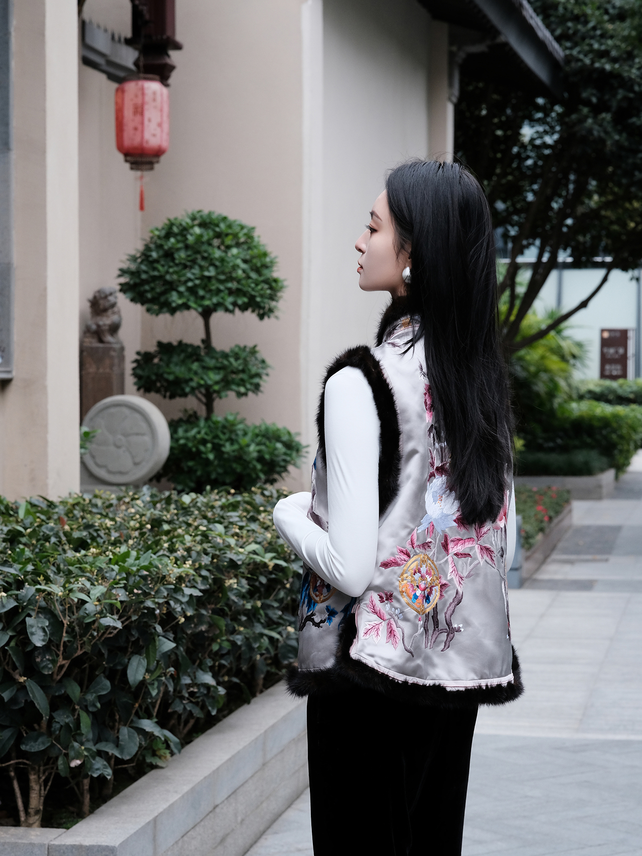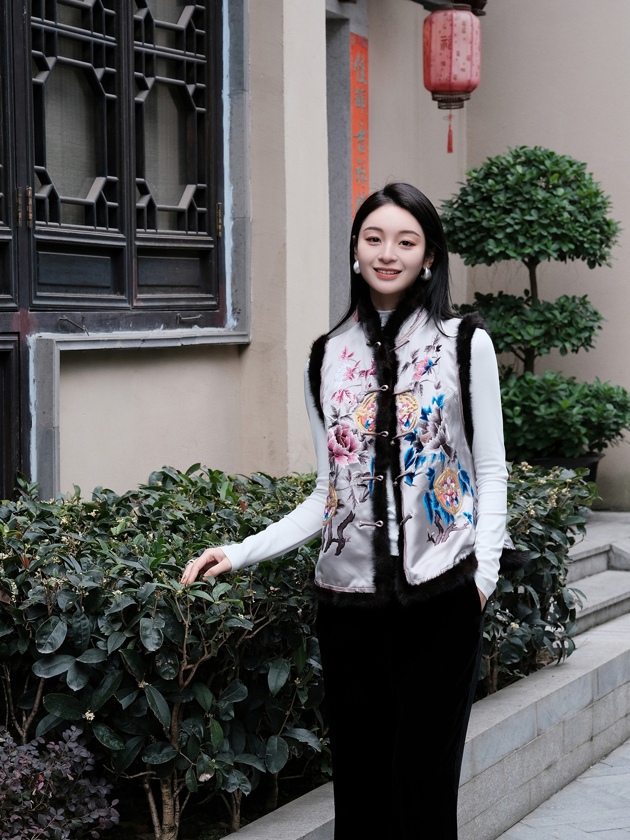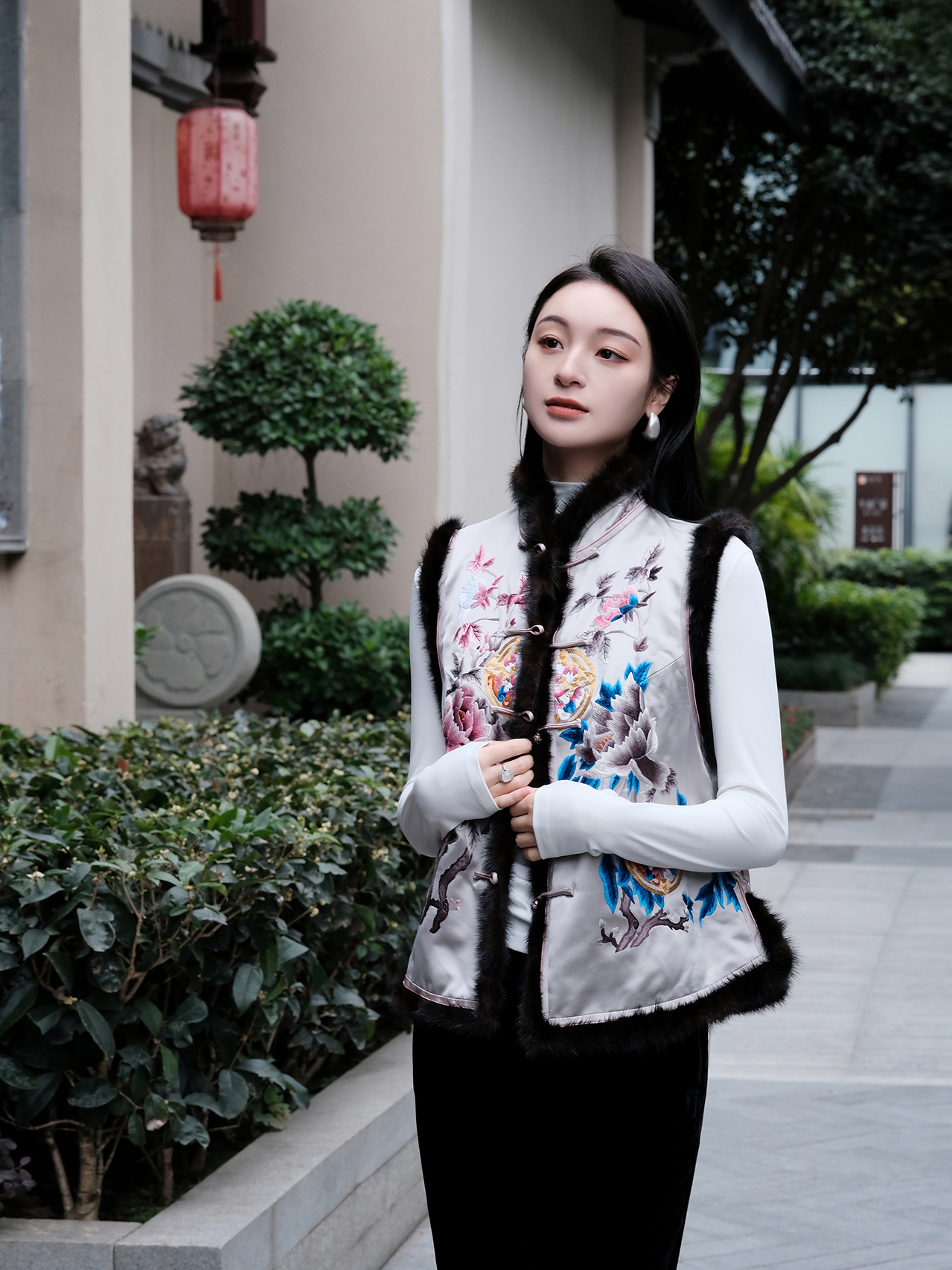 盛唐牡丹&王小潇联名|富贵长寿貂毛手绣棉背心-白色