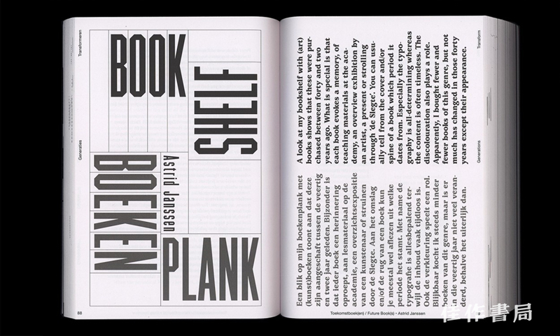 What is the future of the book? And, specifically, what is the future of books on art, design and architecture, and cultural-critical publications? We asked a large number of international interested individuals to respond to this question. Journalists, artists, architects, curators, translators, designers, philosophers, sociologists, teachers, book scholars, publishers, printing houses, distributors, booksellers, historians and art-historians, critics, policymakers, editors, students, and many others have enthusiastically shared their views with us, looking ahead five, twenty or seventy-two years (to the year 2100). At times utopian, wildly fantasizing, at other times with realistic scenarios, in both text and images, exciting for anyone who loves books and/or is involved in books and cultural content. Each section of this publication will be designed by various young designers, to celebrate its scope and diversity.