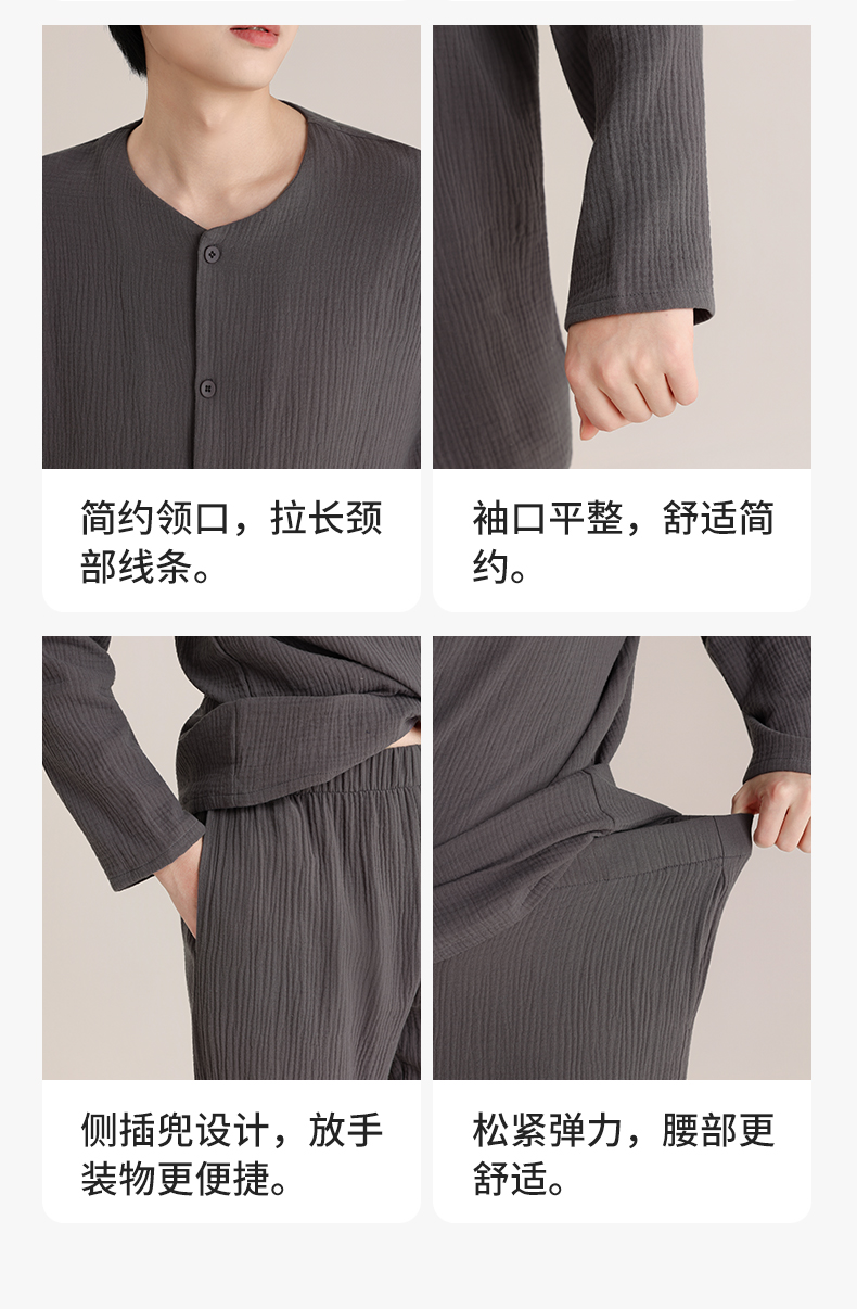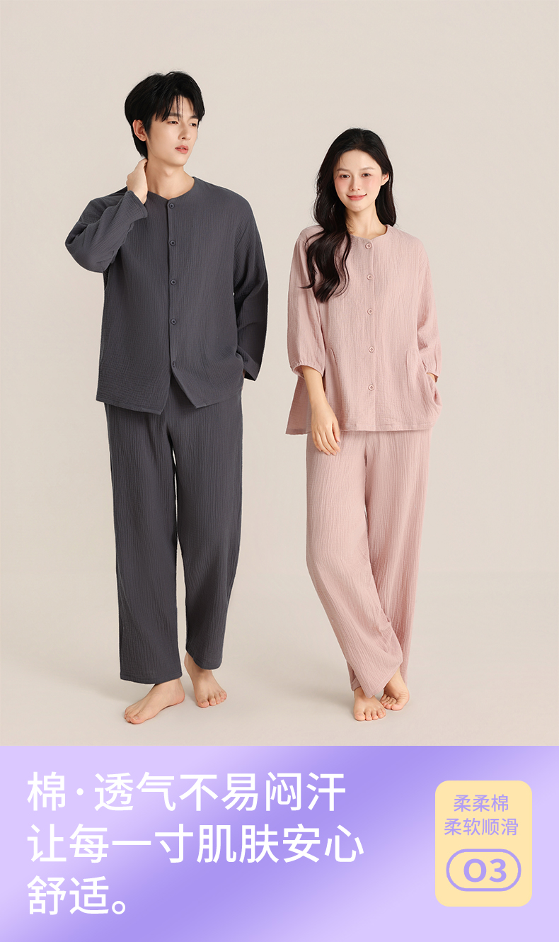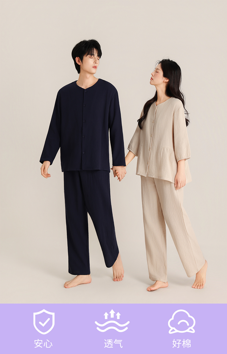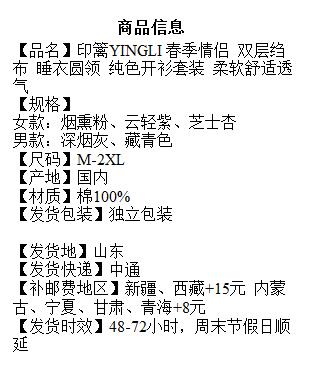 印篱YINGLI 春季情侣 双层绉布 睡衣圆领 纯色开衫套装 柔软舒适透气
