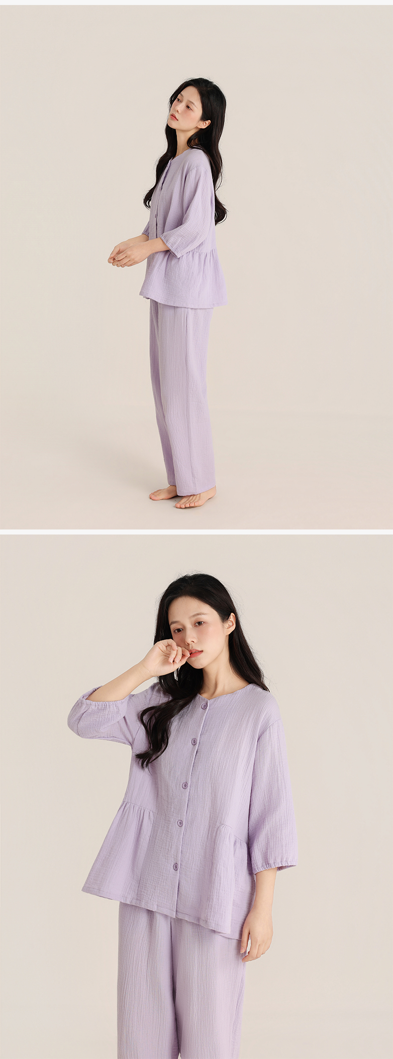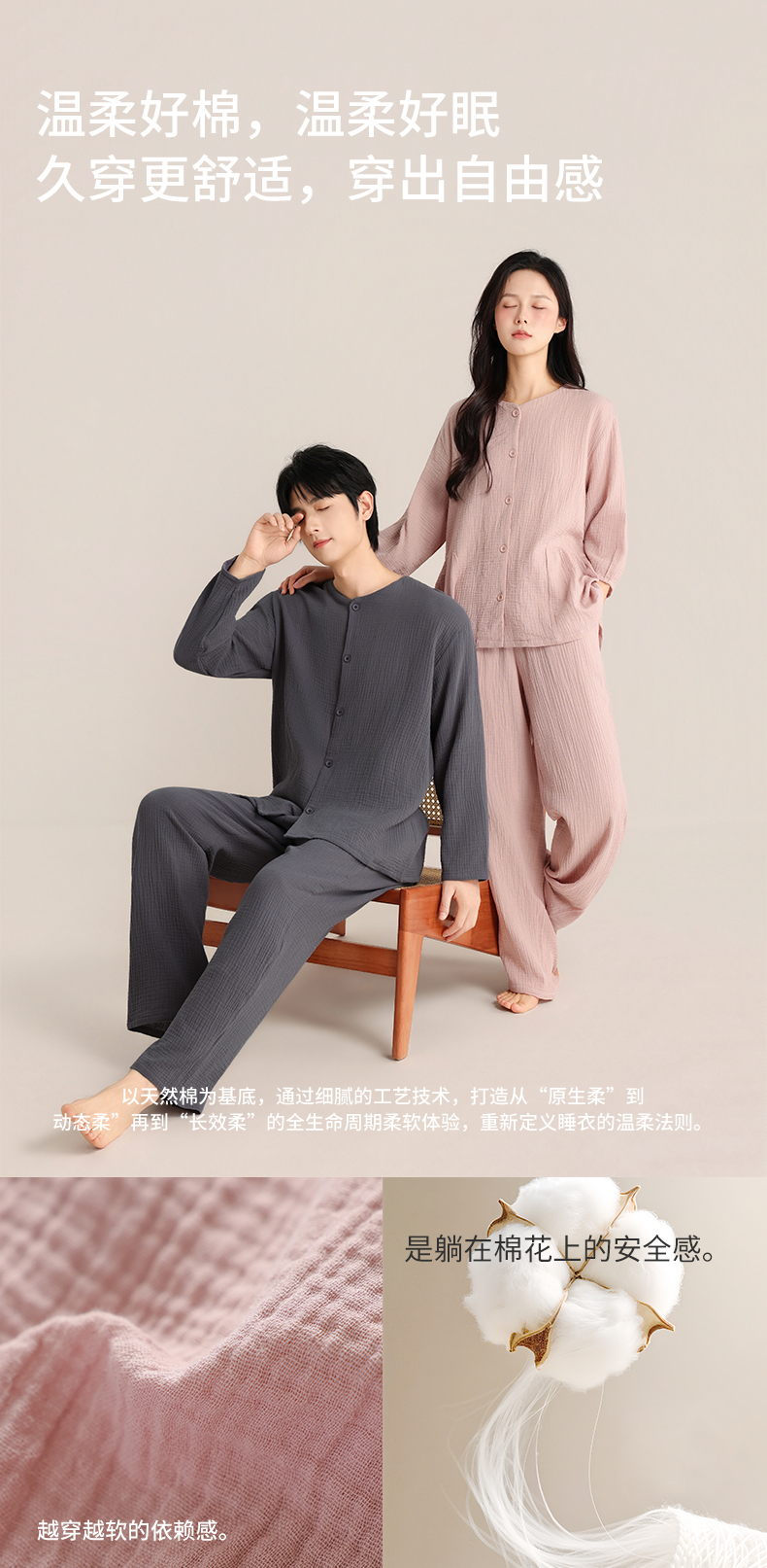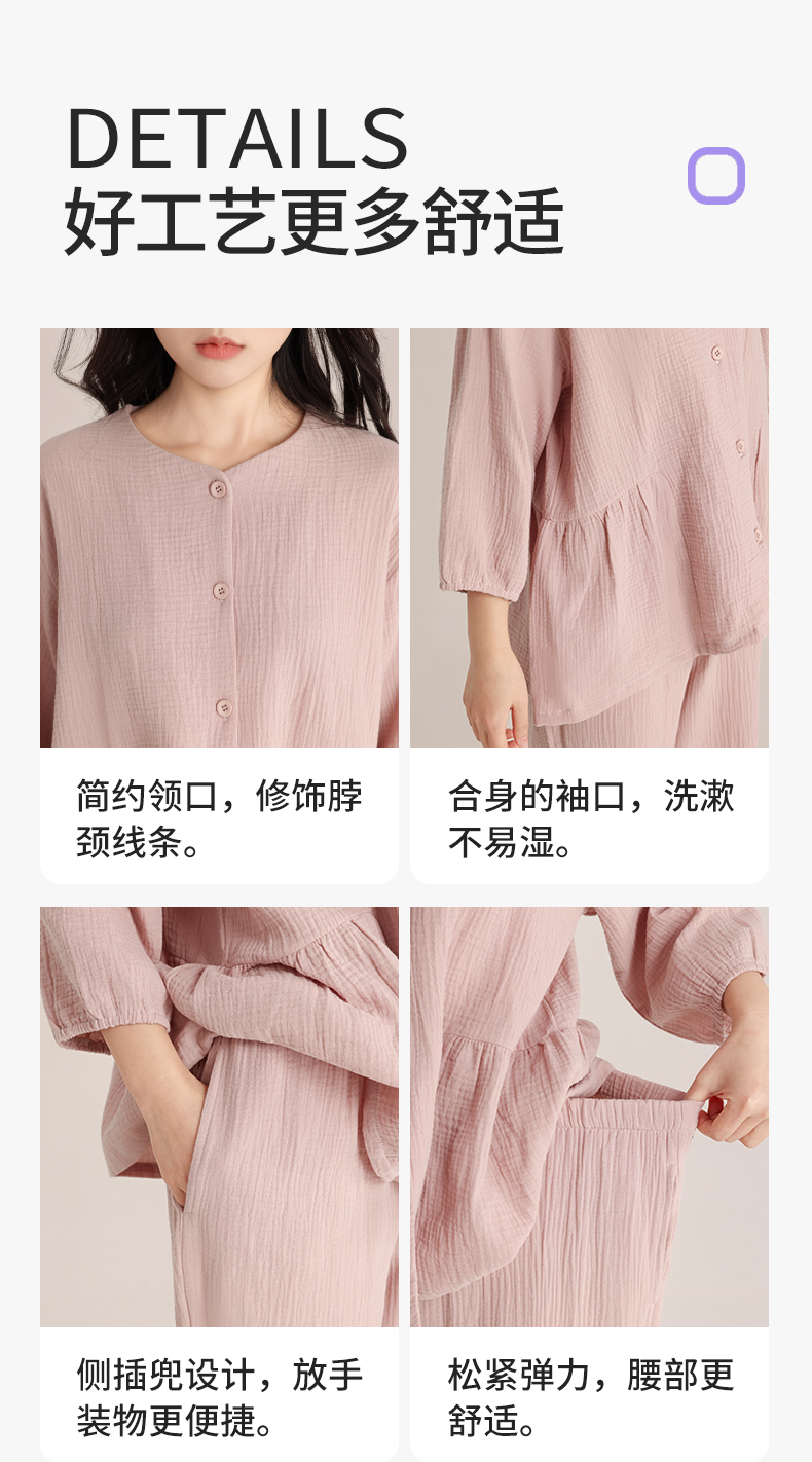 印篱YINGLI 春季情侣 双层绉布 睡衣圆领 纯色开衫套装 柔软舒适透气