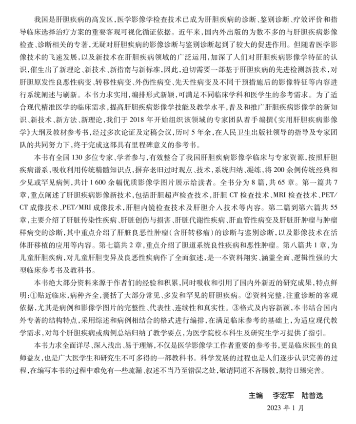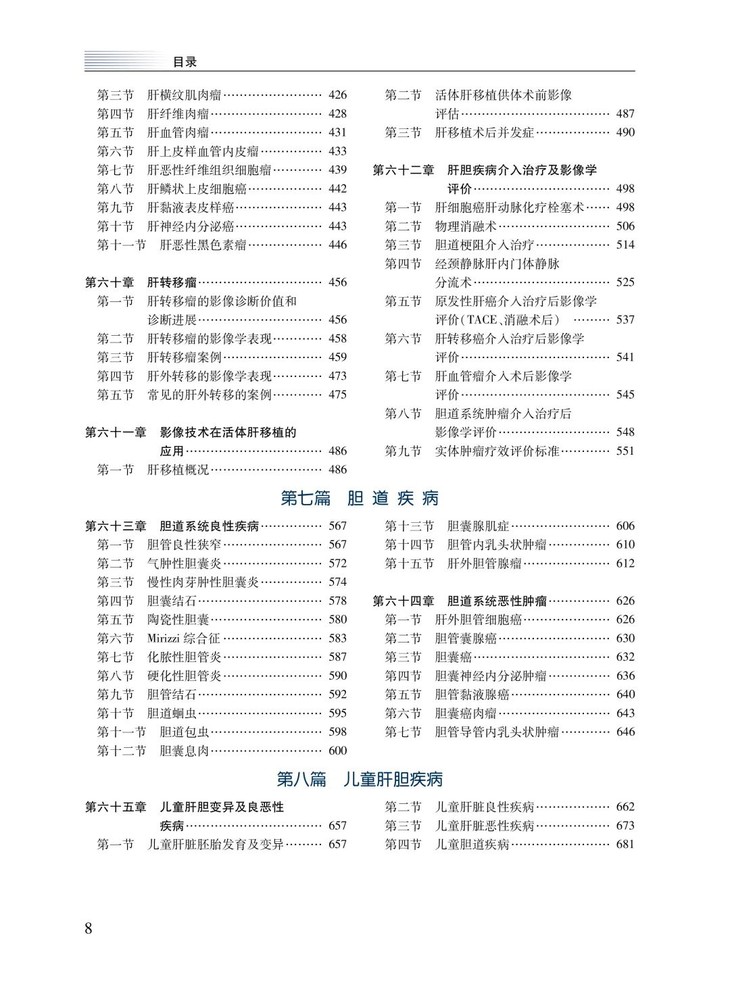 全书分为8篇,共65章。第一篇7章,重点阐述了肝胆疾病影像新技术,包括肝胆超声检查技术,肝胆CT、MRI、PET/CT、PET/MRI成像技术,肝胆内镜检查技术及肝胆介入技术等内容。第二篇到第六篇共55章,主要介绍了肝脏感染性疾病、病毒性肝炎及肝硬化的影像学诊断,艾滋病相关肝脏疾病、肝脏创伤与损害、肝代谢性、肝血管性及肝脏囊性病变的诊断,重点介绍了肝脏良恶性肿瘤(含肝转移瘤)的诊断与鉴别诊断,以及影像技术在活体肝移植的应用等内容。第七篇共2章,重点介绍了胆道系统良性、恶性疾病(肿瘤)。第八篇1章,对儿童肝胆疾病,包括儿童肝脏发育异常及变异、儿童肝脏良性、恶性疾病的诊断等,作了全面叙述。