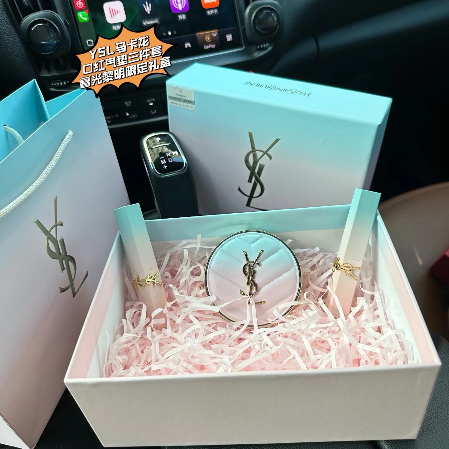 【马卡龙口红气垫三件套暮光黎明限定礼盒】双支马卡龙口红(77#烟装粉+1966#红棕色)+杨树林马卡龙皮革气垫(礼盒内马卡龙皮革气垫可选B10、B20气垫!默认随机配)开盖扑面而来的浪漫仪式感!不抢真的会后悔!杨树林马卡龙皮革气垫那真的不用不知道,一用就是妈生好皮肤!细腻水光感太疯狂了!上脸的妆感太心动了!粉质细腻又羔级!神仙单品!真的绝美绝富贵!女人不用口红就相当于花儿没了阳光,失去了色彩!不落俗套,有颜又有内涵!又飒又A的1966#暖棕红色口红是真的丝滑滋润!复古红唇妆,丝绒质地有光泽,薄涂厚涂都超爱!这一只剁手都要抢!命中天选的烟灰粉终于找到了,它就是77#烟装粉!羔级感满满的木质调烟灰粉!薄涂一层巨日常又慵懒,嫩呼呼的杏粉色好温柔,厚涂就增添了一丝清冷灰调,冷烟灰和暖雾粉融合真的好city!