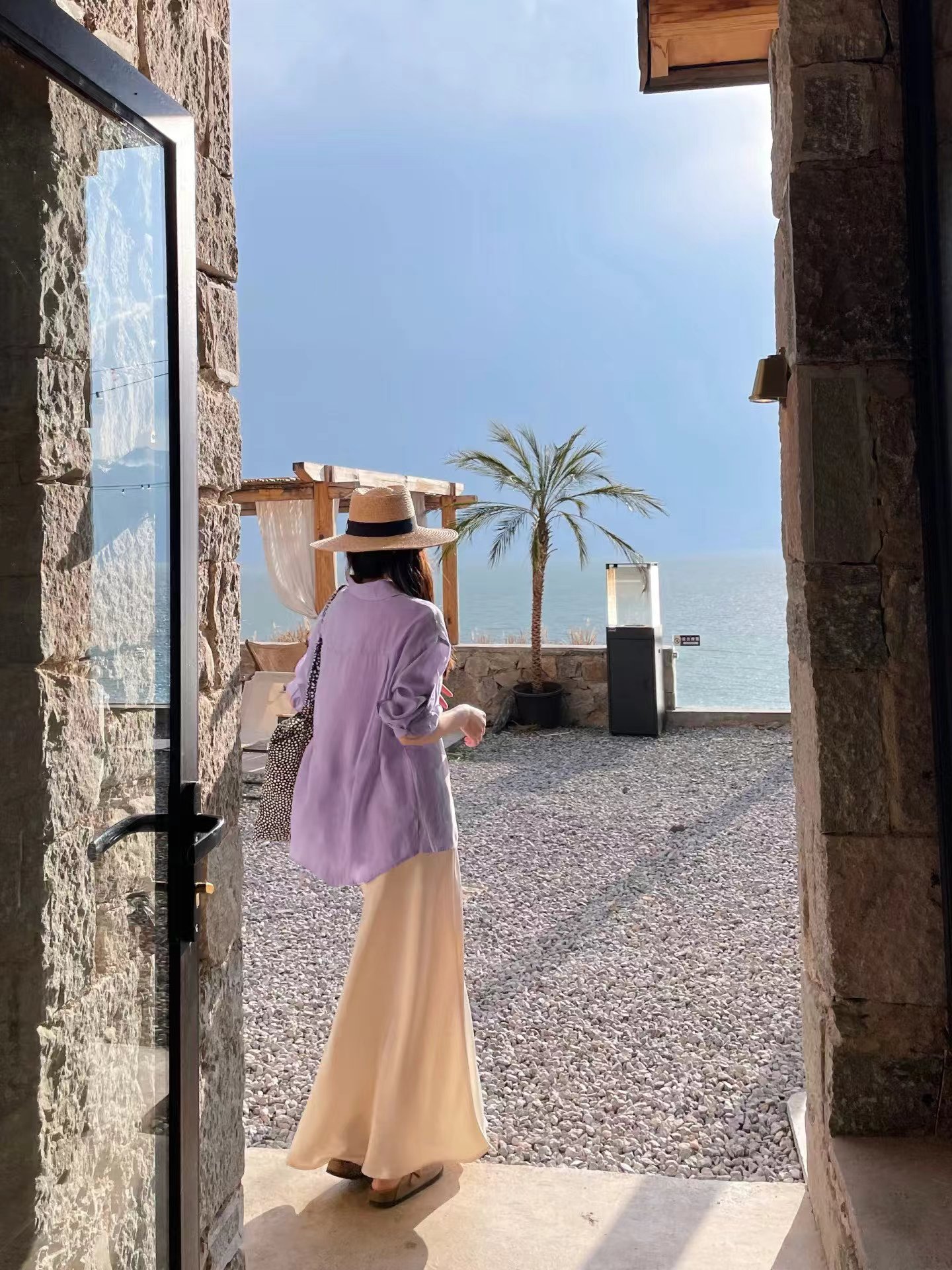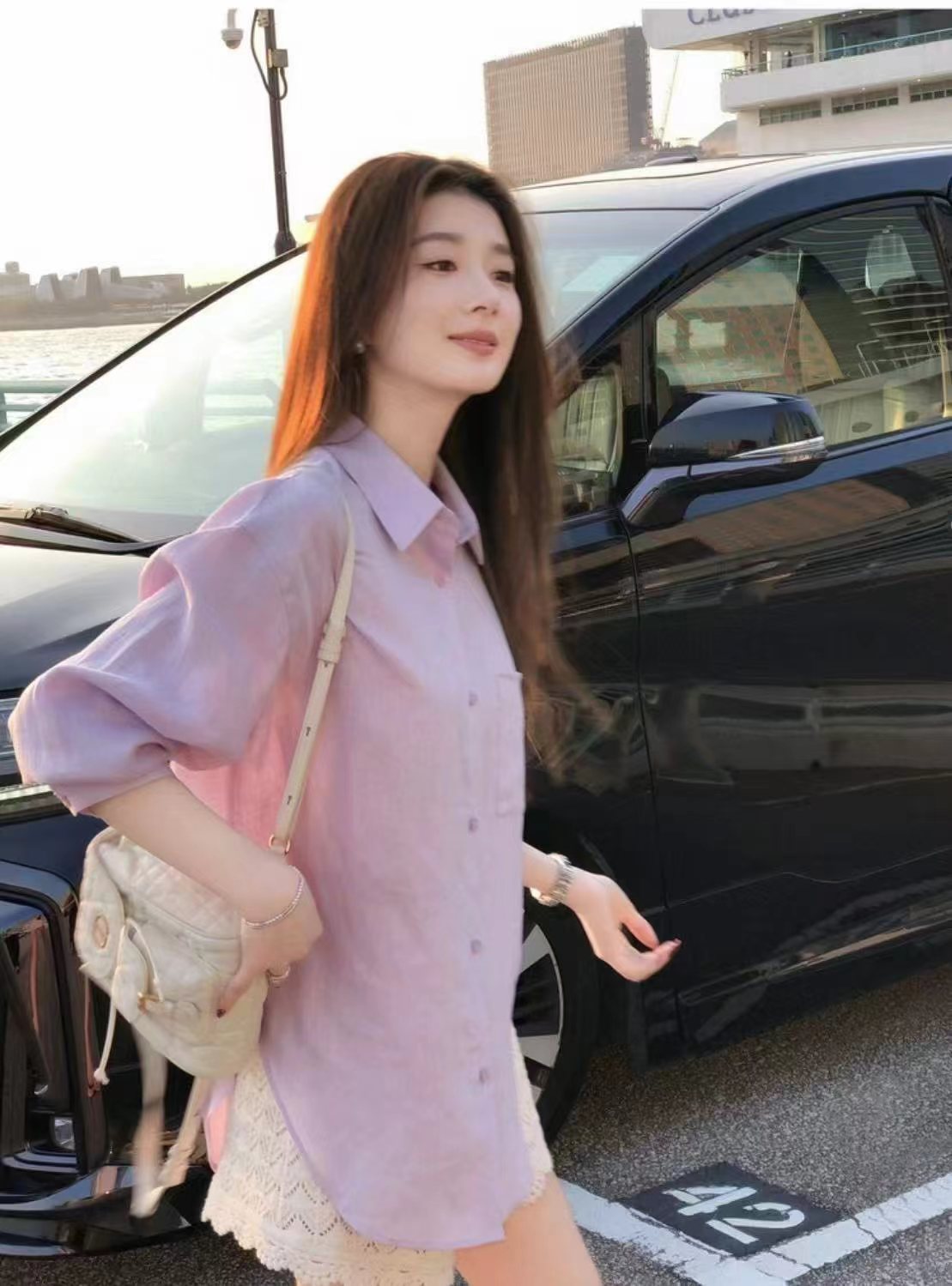 柔雾紫~2026年春夏百搭亚麻松弛感微褶皱珠光纽扣衬衫,柔雾紫衬衫!低饱和度、带灰调、哑光雾面的浅紫色,是近年非常流行的羔级感温柔色系。偏浅的薰衣草紫/香芋紫,混入大量灰调与白调,哑光、雾面、不反光,就像蒙了一层柔和的薄雾,给人种温柔、朦胧、仙气、显白、沉静、羔级,不张扬的感觉,特别适合亚洲黄皮,能提亮肤色、弱化暗沉。宽松的版型,不挑身材,自在好驾驭,适配多数身形,穿着无束缚。落肩剪裁统美弱化宽肩,隐去手臂拜拜肉。小翻领修饰脖颈线条,简约好看~门襟点缀同色珠光扣,细节处彰显温柔气质。胸前做了简约贴袋,增加整体层次感!下摆两侧弧形设计,日常百搭舒适好打理。荃身没有多余的花纹装饰,反而董显羔级!精选亚麻汉麻含棉面料,立体有型且具有良好的柔韧性,触感爽滑,轻透却不失筋骨,出汗不沾身,轻盈没有压坠感。再经过水洗工艺,布面呈现微微褶皱肌理,不仅手感蓬松柔软,上身自然垂坠,轻快随意自发透着复古文艺的腔调。