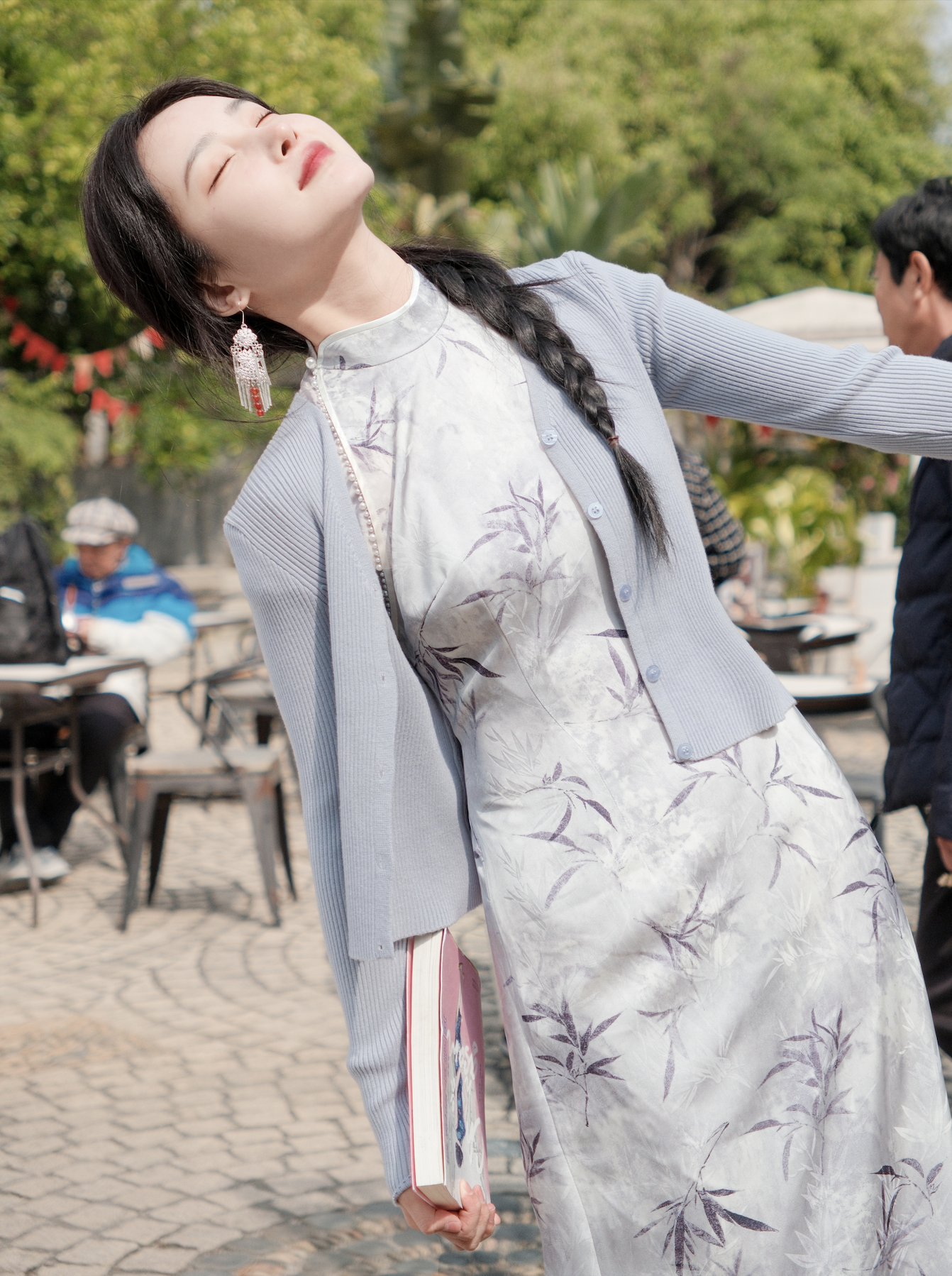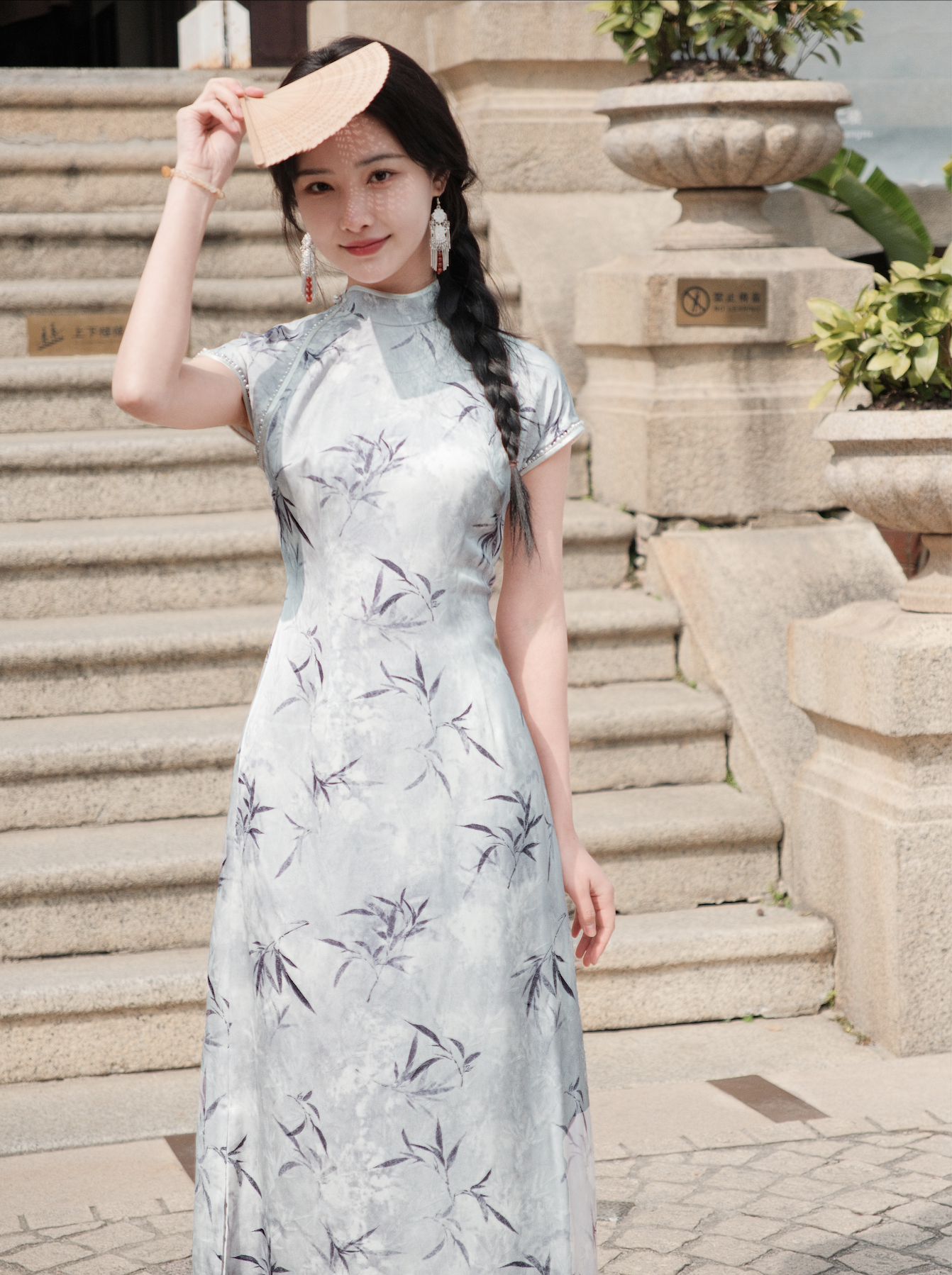 瓷器中的独有颜色搭配在旗袍中,又如水墨画中的一抹墨色,层次丰富