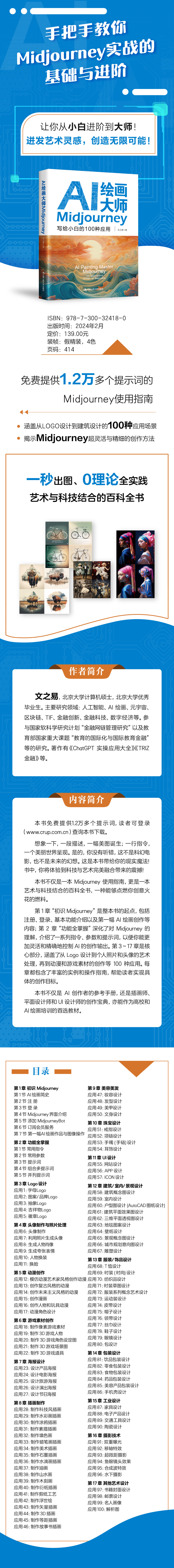 本书不仅是一本Midjourney使用指南,更是一本艺术与科技结合的百科全书,一种能够点燃你创意火花的燃料。第1章“初识Midjourney”是整本书的起点,包括注册、登录、基本功能介绍以及第一幅AI绘画创作等内容;第2章“功能全掌握”深化了对Midjourney的理解,介绍了一系列指令、参数和提示词,以便你能更加灵活和精确地控制AI的创作输出。第3~17章是核心部分,涵盖了从Logo设计到个人照片和头像的艺术处理,再到动漫和游戏素材的创作等100种应用。每章都包含了丰富的实例和操作指南,帮助读者实现具体的创作目标。