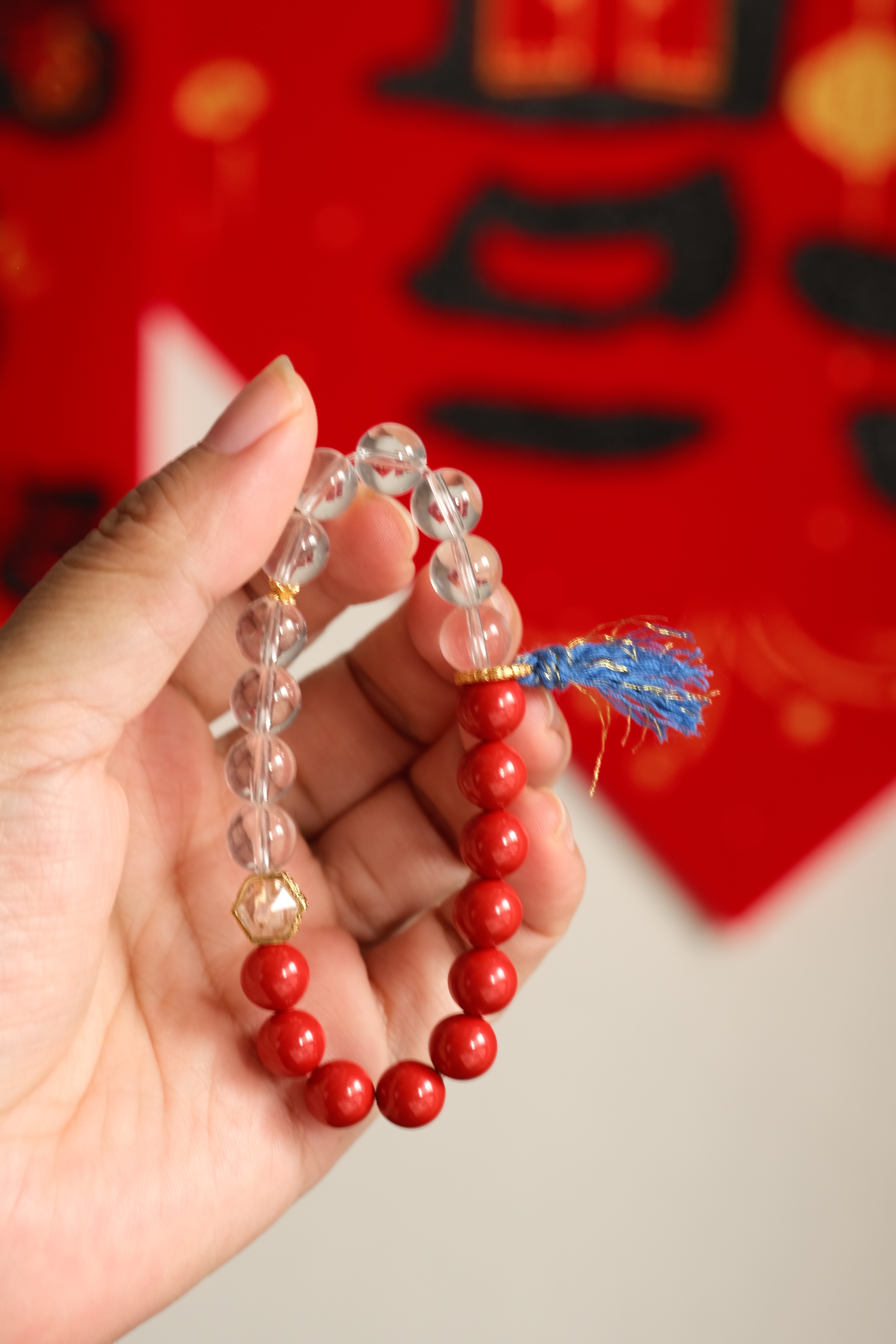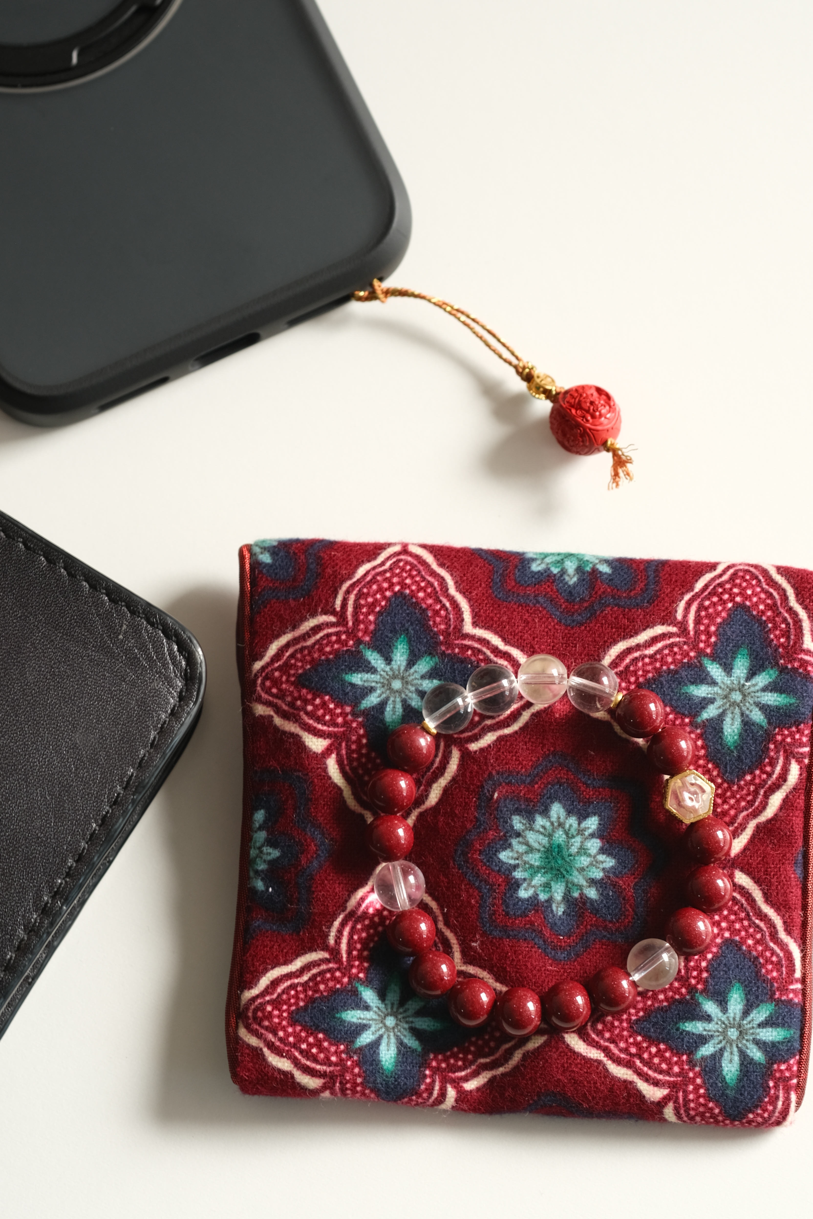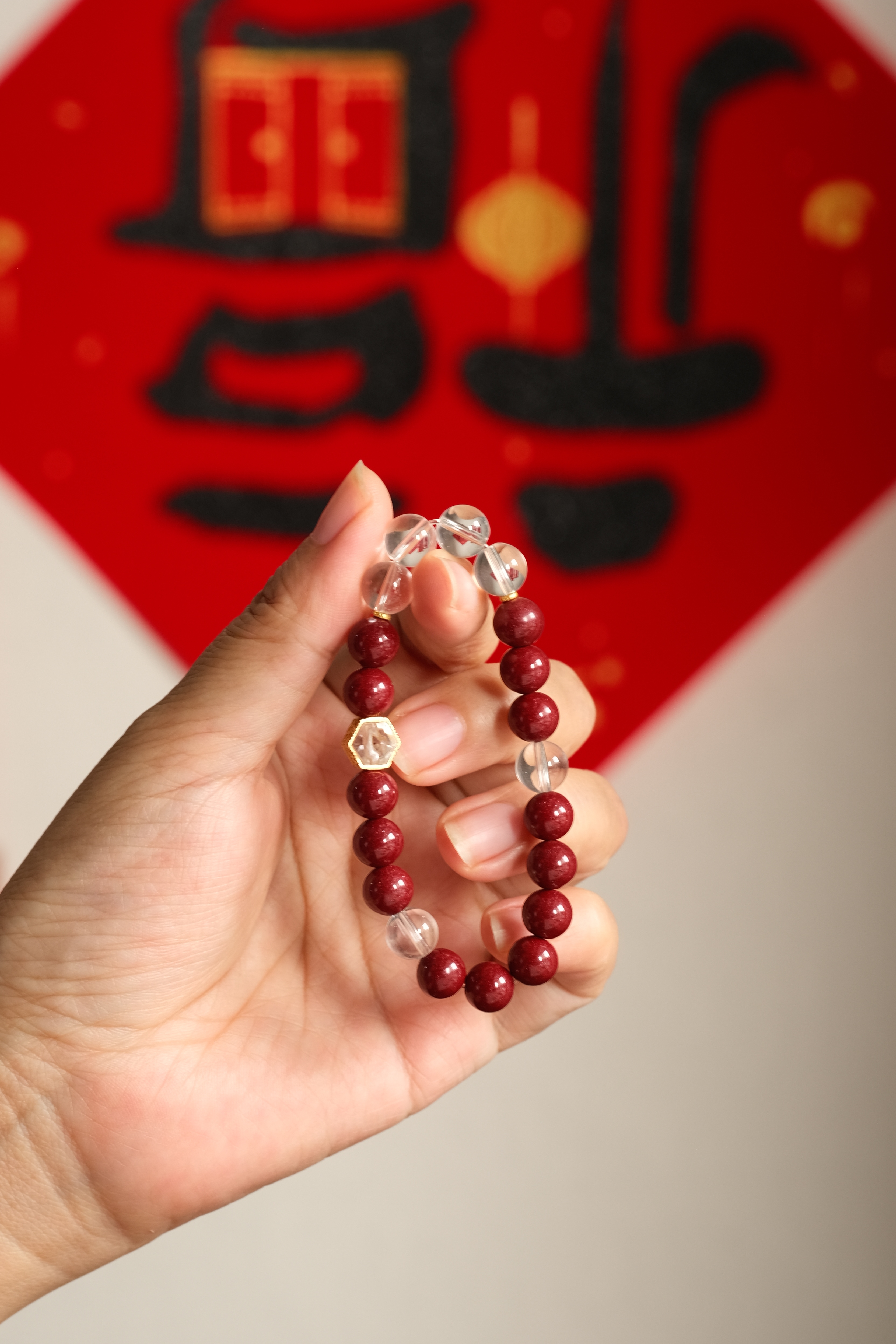 产品亮点:红砂纯正热烈,分别搭配水晶或温润的粉青碧玉,平衡五行而灵动。