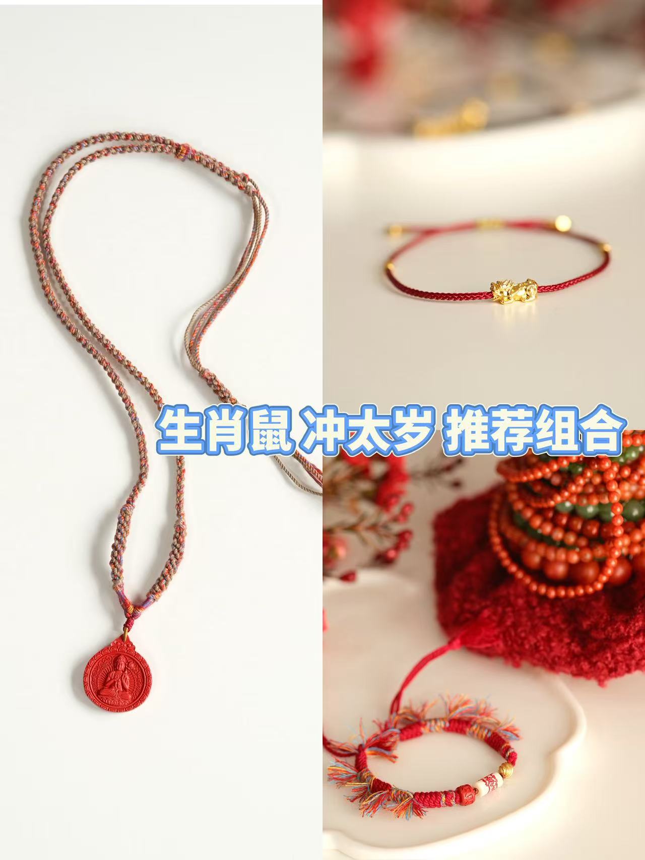 推荐组合:【本命守护神牌(根基守护)】+【18K金貔貅红绳(防破聚财)】+【猛犸象牙太sui符手绳(专化冲击)】
