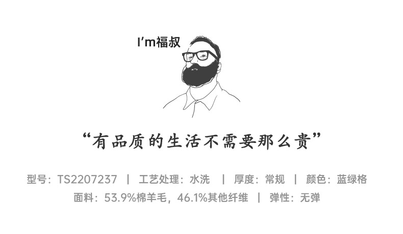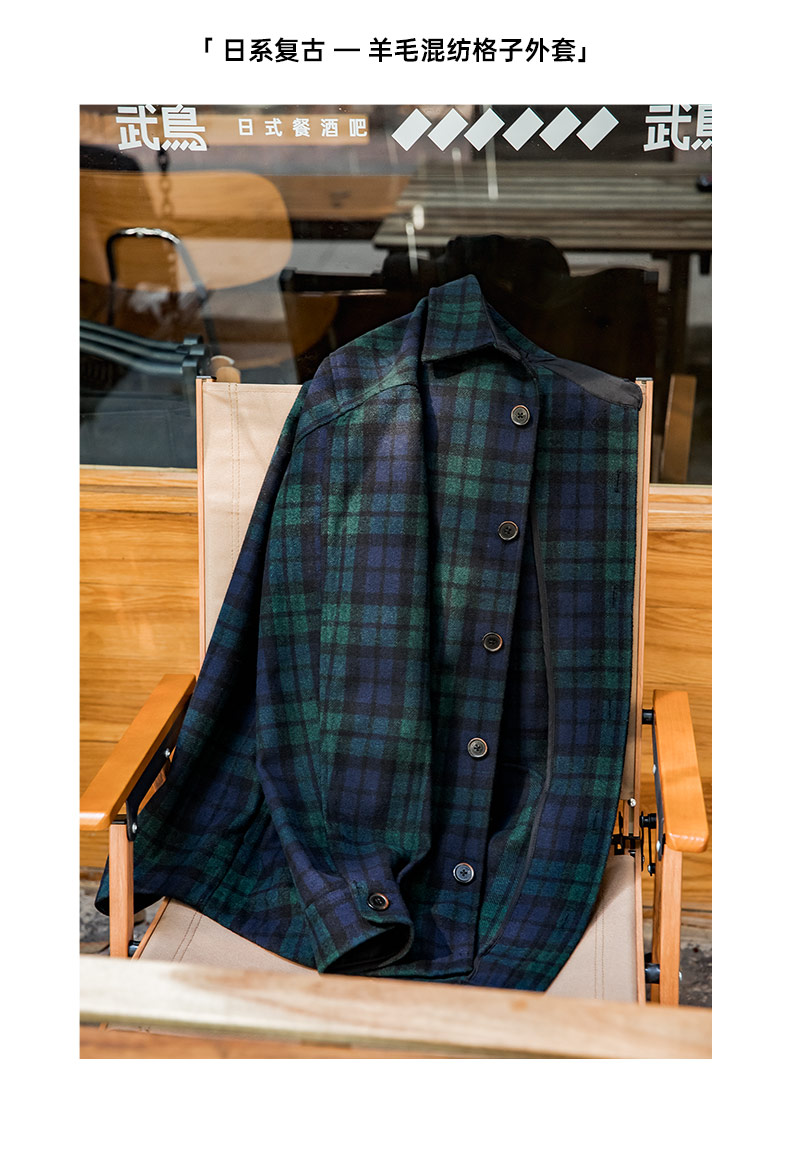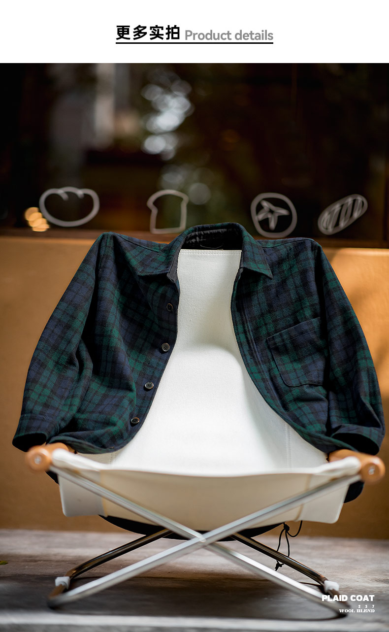 工装精选 美式复古蓝绿格子毛呢夹克宽松厚实格纹衬衫外套男秋季