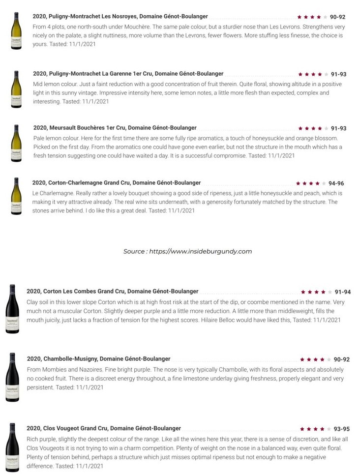 ① 勃艮第权威贾斯珀·莫里斯(Jasper Morris MW)在其著作《探索勃艮第》(Inside Burgundy)中详尽地介绍了酒庄,并给其 2020 年份的红、白葡萄酒打了很高的评分,要知道莫里斯的打分一向手紧,能够取得这样的成绩,是对酒庄品质莫大的肯定。