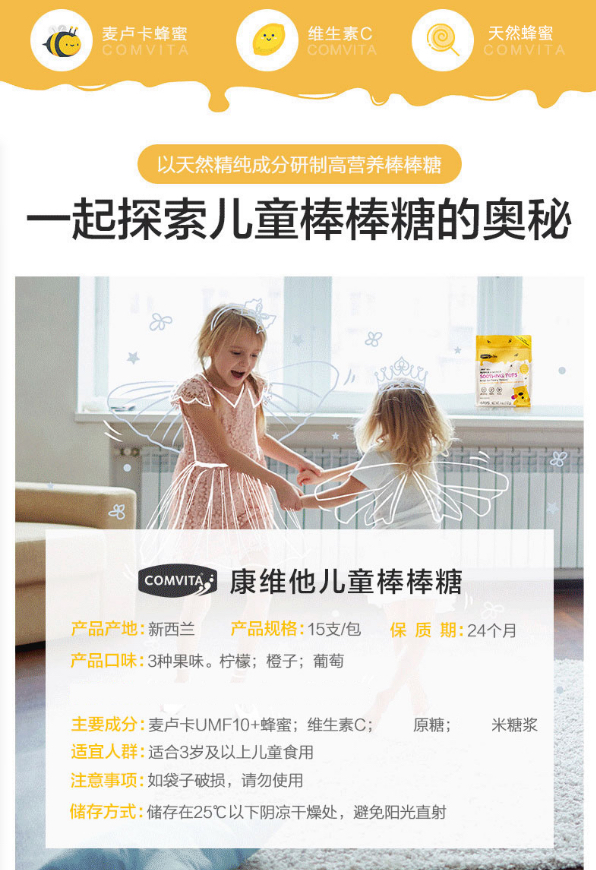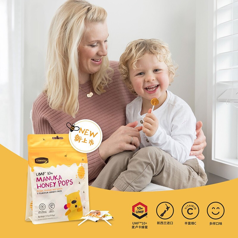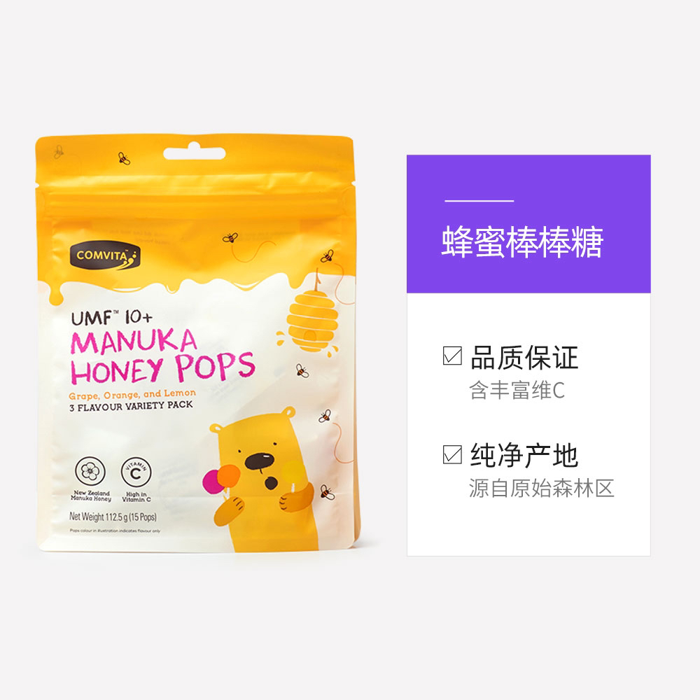 Comvita康维他儿童舒缓增强免疫力麦卢卡蜂蜜棒棒糖(3种口味)有葡萄、橙子和柠檬三种口味,可舒缓儿童咽喉痛和咳嗽。蕴含的活性麦卢卡蜂蜜UMF10+与维生素C完美结合,生成了含有支持免疫、抗氧化和抗菌功效产品。