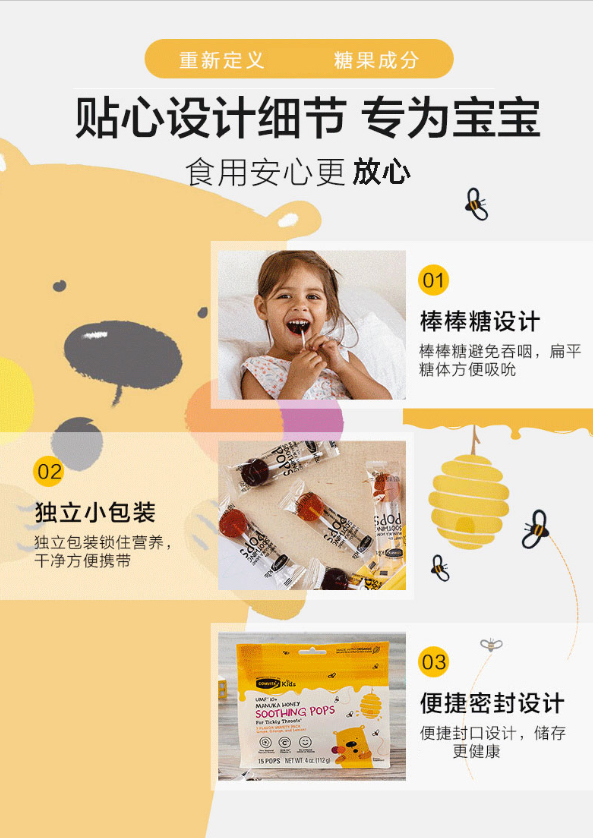 ○ 葡萄、橙子和柠檬三种口味,蕴含活性麦卢卡蜂蜜UMF10和维生素C,增强免疫力。