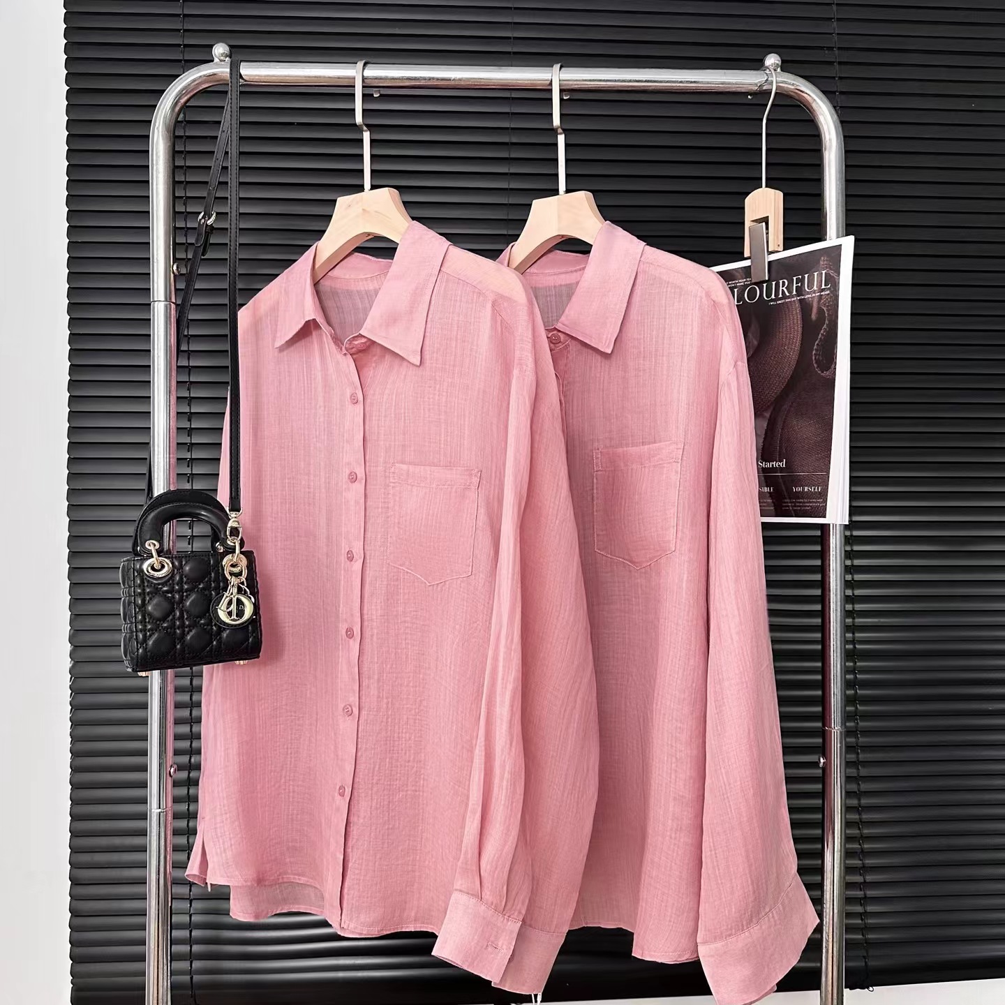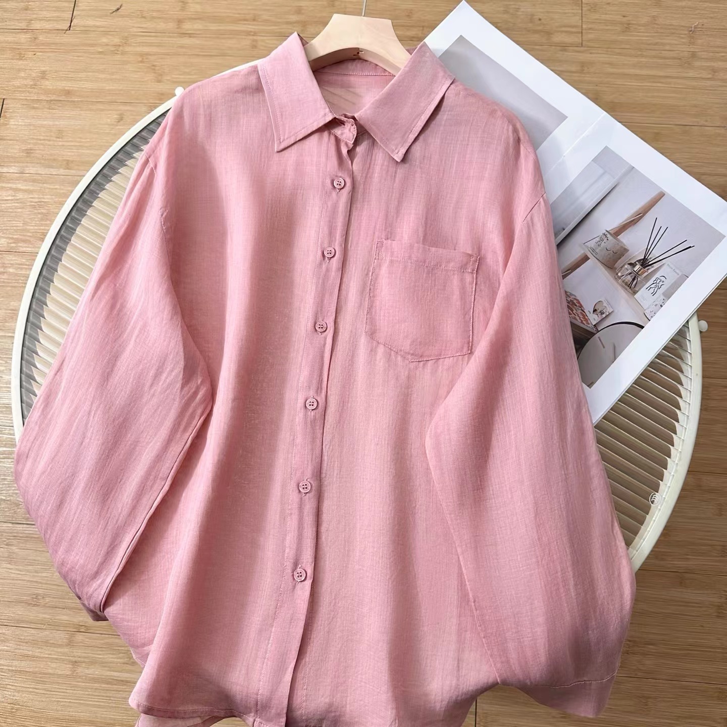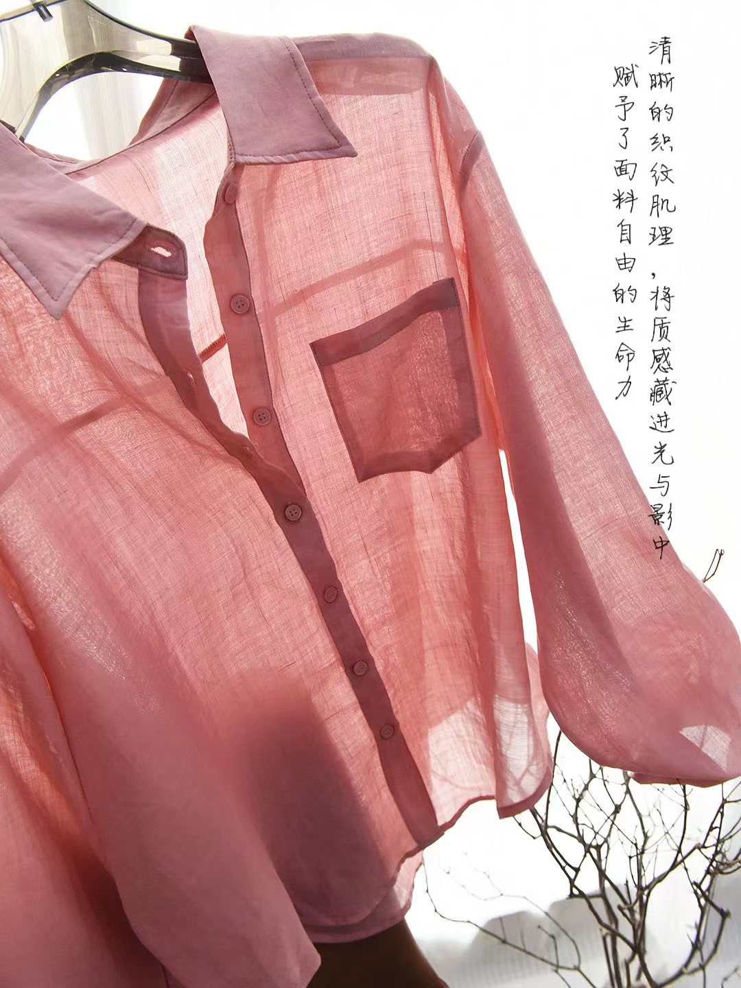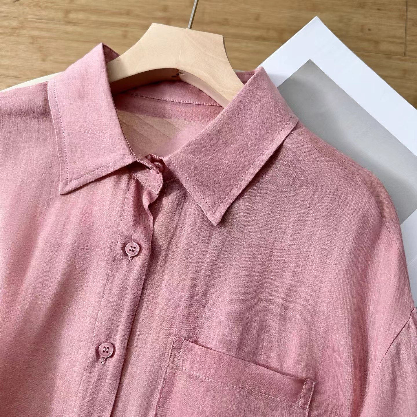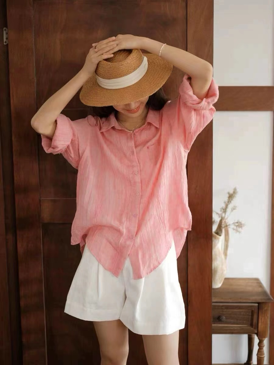 玫瑰粉~高奢系列夏季新款苎麻女士温柔C位粉苎麻轻薄防晒衬衫,夏日松弛感密码!这件苎麻衬衫美到开挂~谁懂啊!一整个被这件玫瑰粉苎麻衬衫拿捏住了!自带呼吸感的面料+慵懒松弛的版型,穿上直接变身夏日氛围美人,日常出街、citywalk 都能穿,闭眼搭都好看~宽松落肩+微廓形,对各种身材都超友好!肩宽星人不怕显壮,溜肩姐妹也能穿出直角肩既视感。前短后长的下摆设计,微微盖过臀部,遮胯又藏肉,梨形身材狂喜~ 不管是单穿还是当防晒衫,都能轻松藏起小肉肉,显瘦效果一绝~苎麻面料是灵魂!自带天然肌理感,透气又清凉,夏天穿像背了个小空调,汗津津的黏腻感退!退!退! 机能感典小翻领+同色系扣子,简约又羔级,领口微微敞开时,还能露出jing致锁骨,小心机拉满!袖口可卷边设计,随意卷一卷,慵懒氛围直接拉满,细节控狂喜,随便一抬手都是电影女主的松弛感!单穿是清新甜妹,配白色短裤扎进腰带,秒变清爽夏日女友;想慵懒一点?搭卡其色阔腿裤+草编帽,citywalk 随手拍都是时尚大片;通勤时配西装裤,解开几颗扣子,干练中带点柔,职场丽人也能美美的,一件顶 N 件,衣柜 C 位预定!这个颜色谁穿谁沦陷,速速锁死,让夏天的每一次出场都美到开挂~