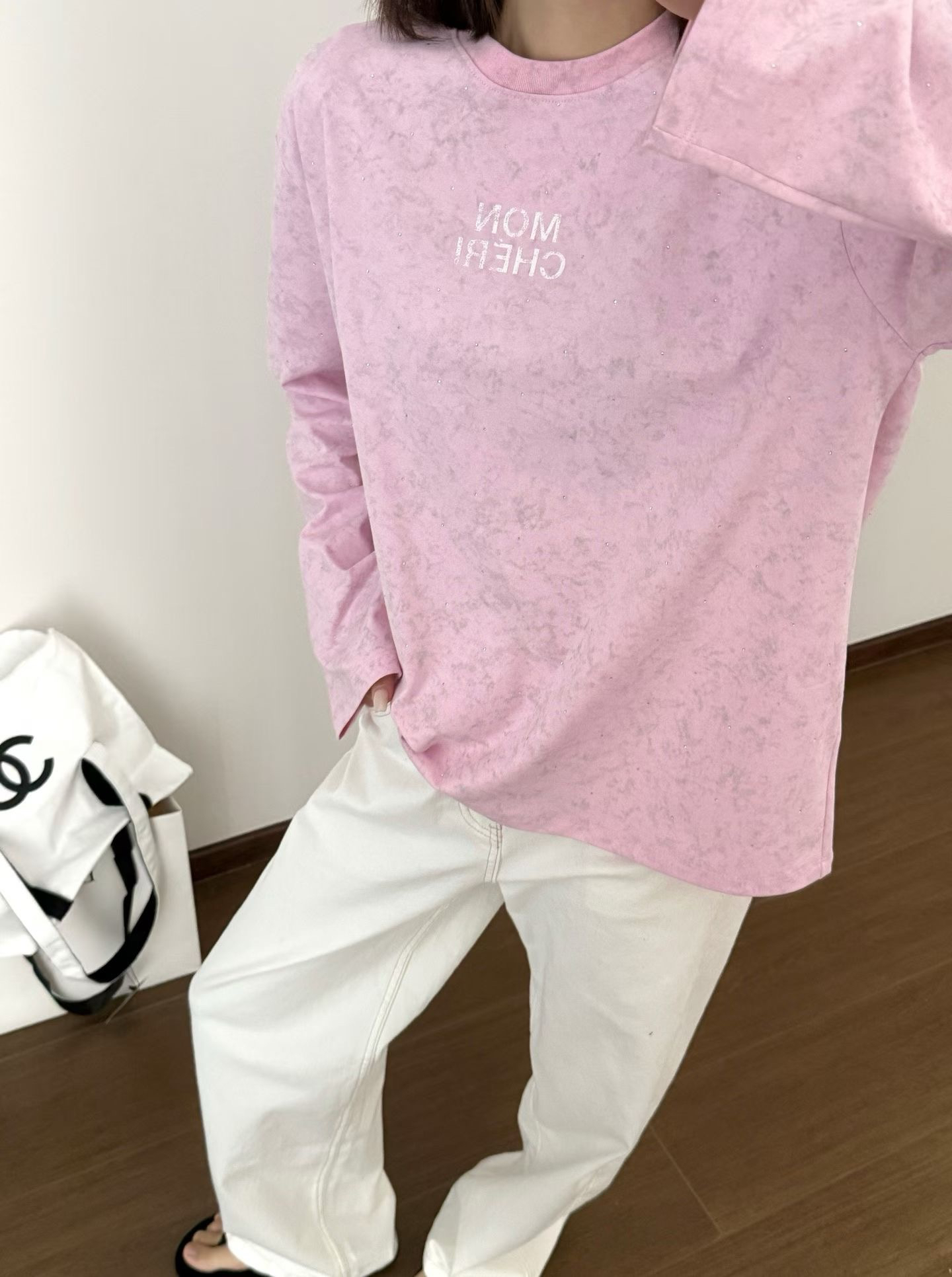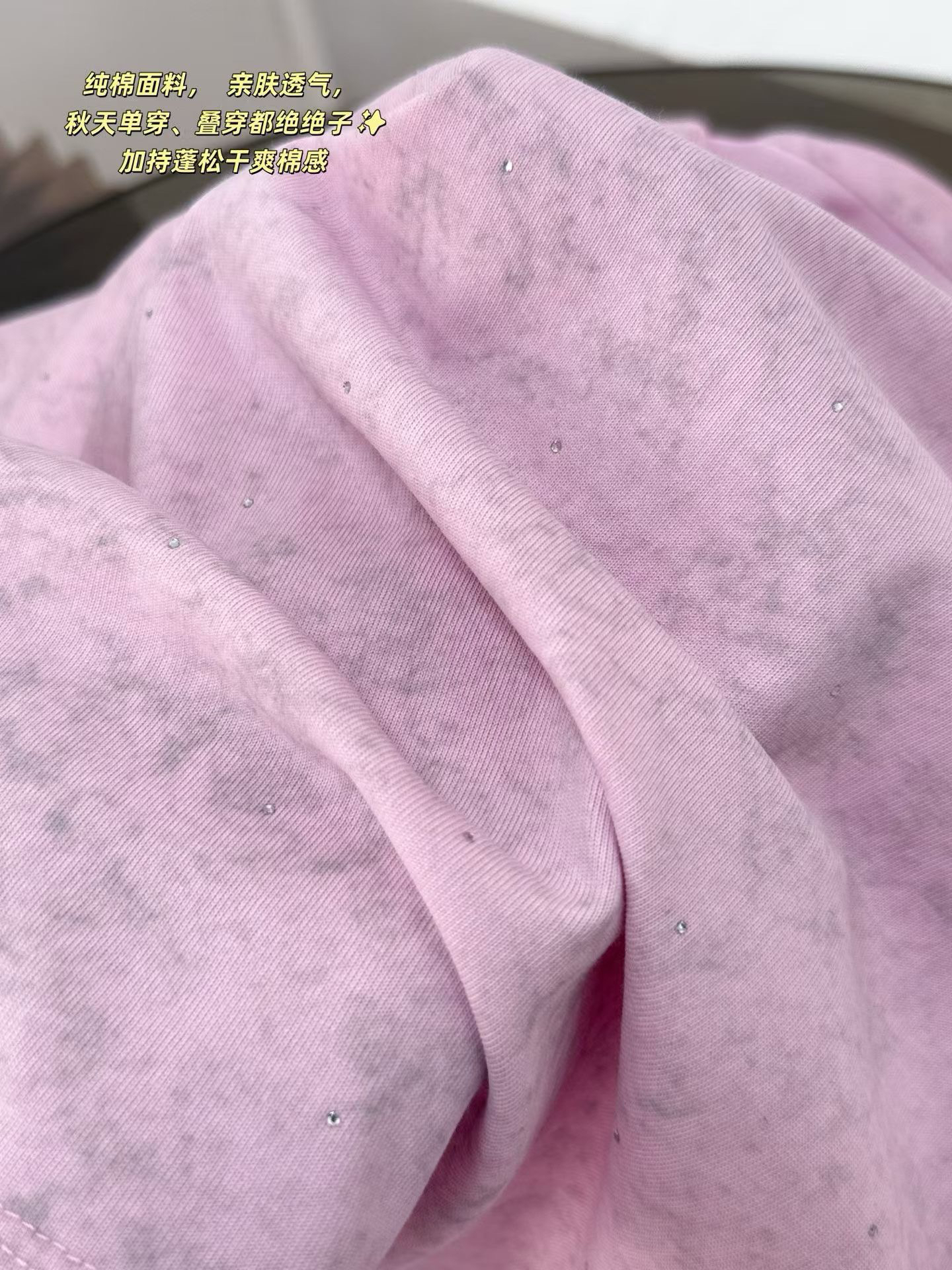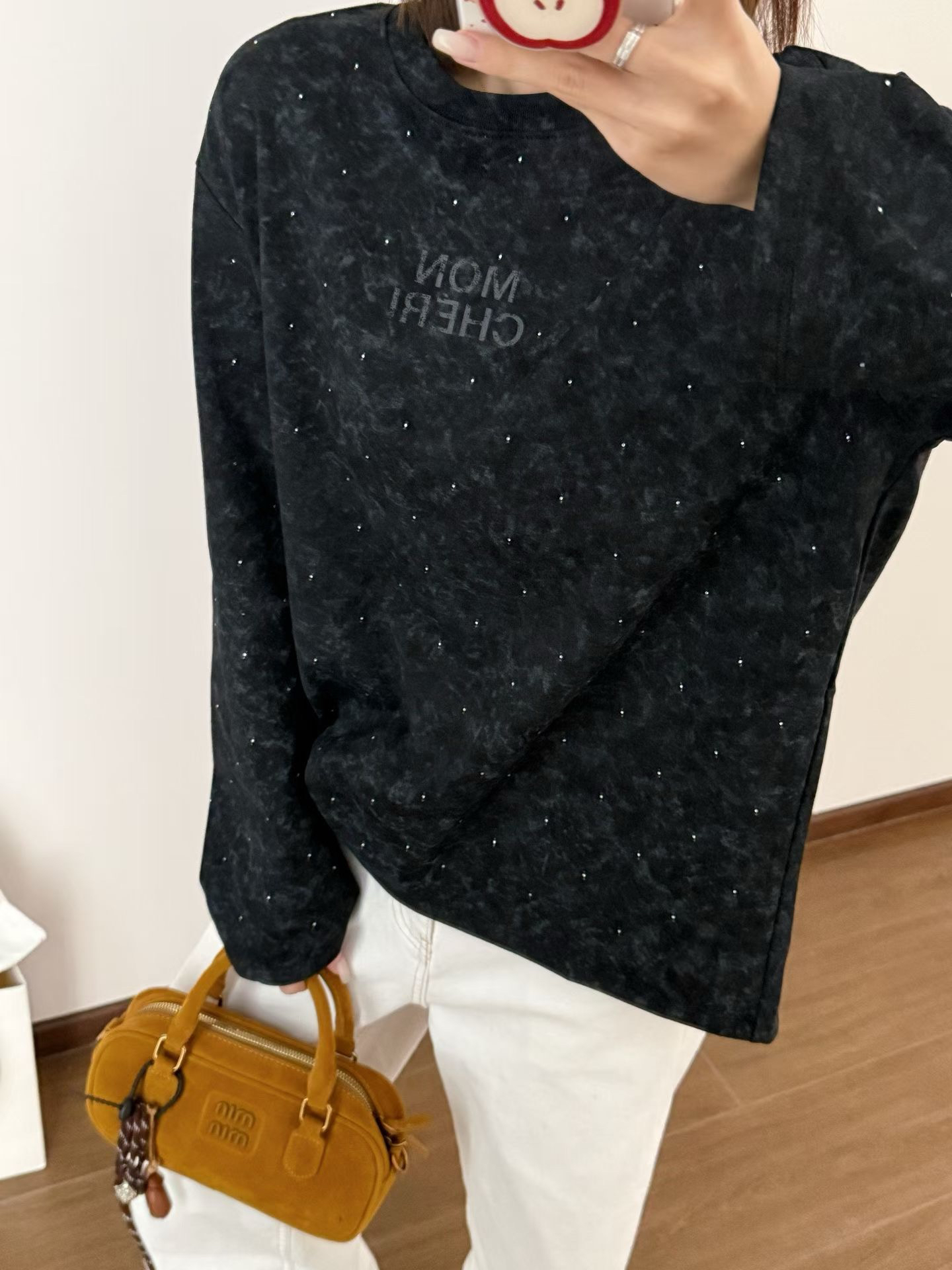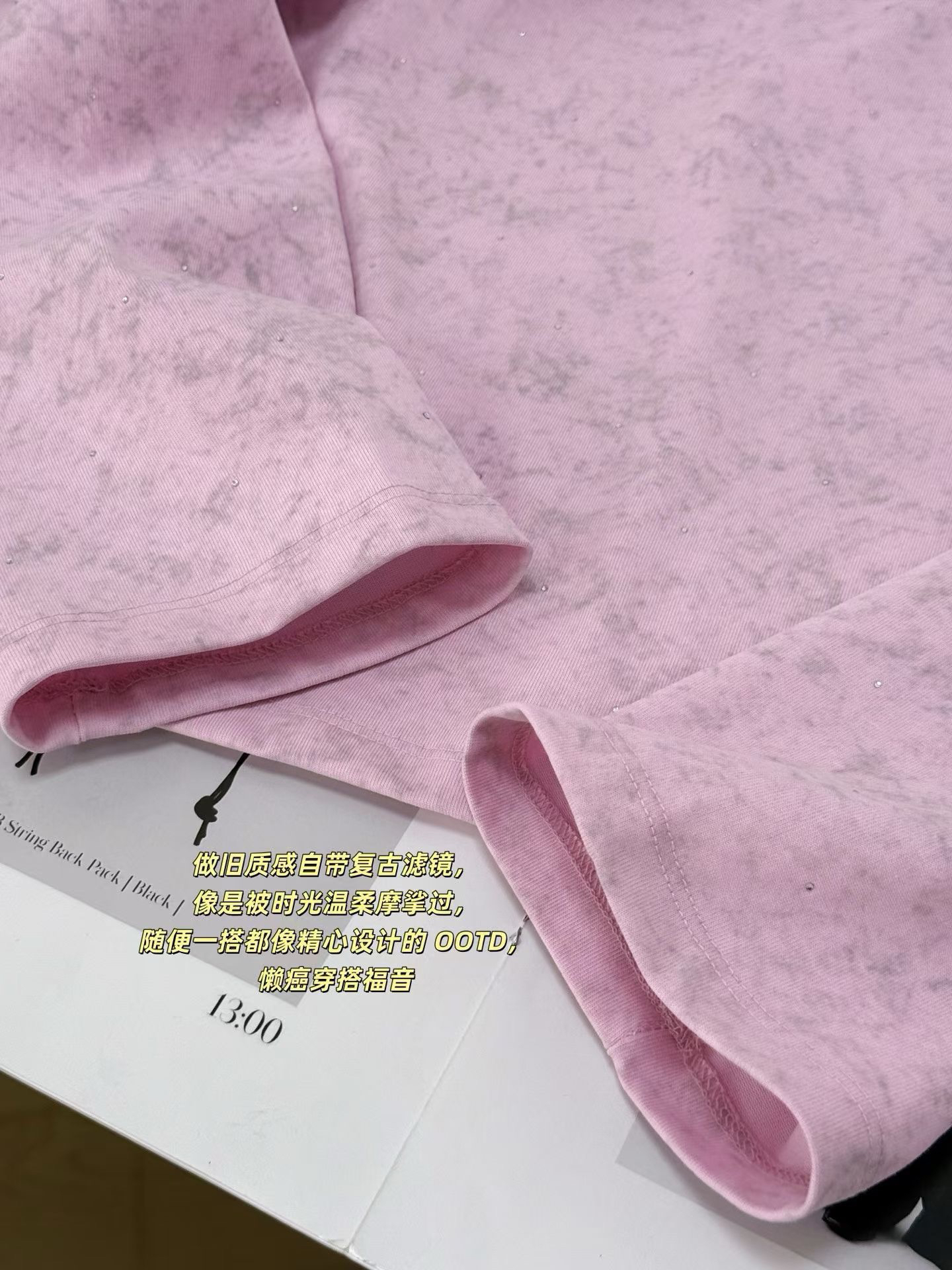 当植绒字母晕开做旧肌理,烫钻在斑驳感里藏住细碎光芒,这件卫衣便成了复古美学的载体