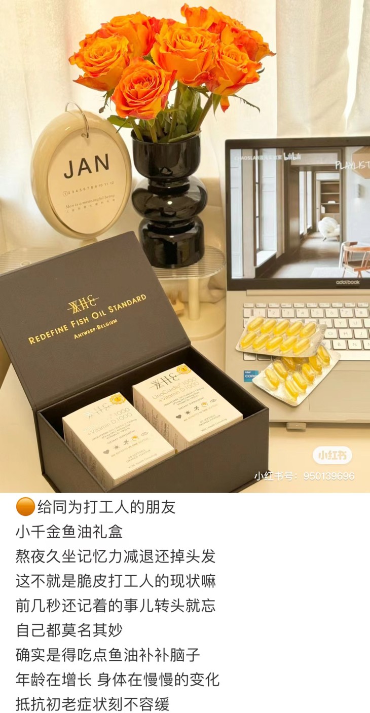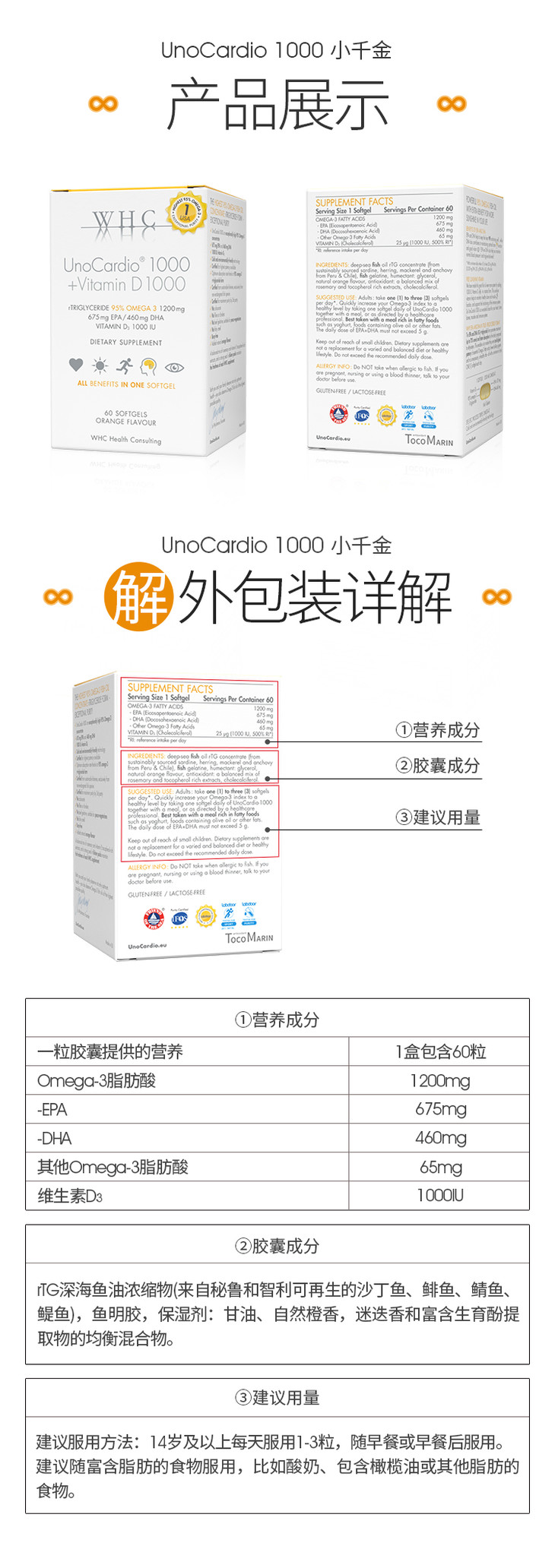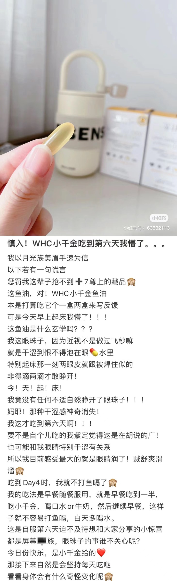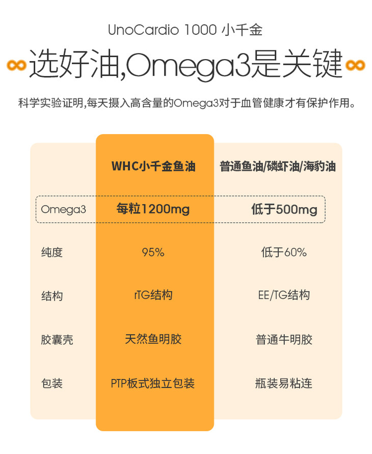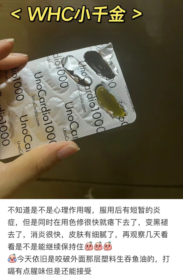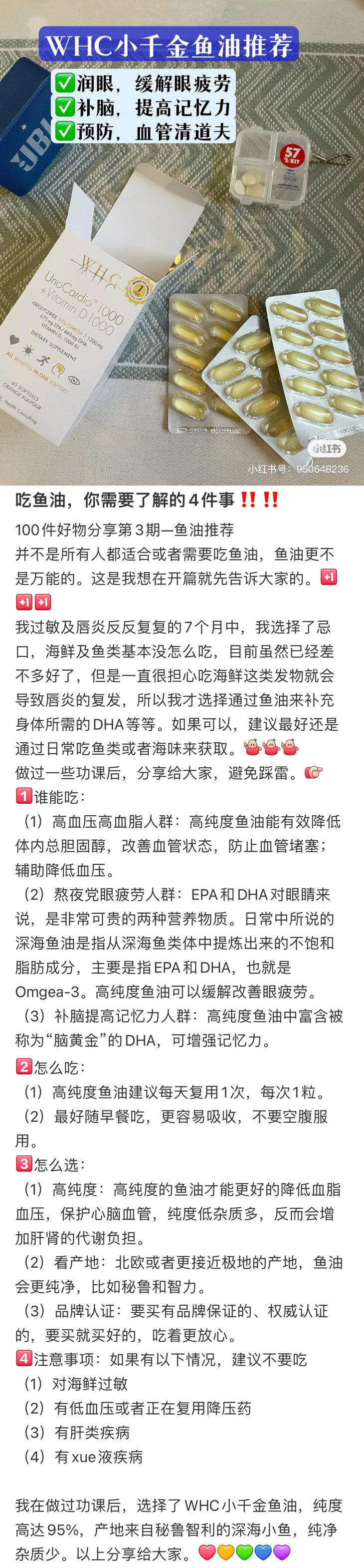 小千金鱼油纯度高达95%,每粒1200mg的omega-3的高高高含量,选用智利和秘鲁渔场的深海小鱼,胶囊壳也是天然鱼明胶,它的EPA和DHA是医学界公认的黄金比例3:2,从成分配比、原料、细节各个方面都很优秀。而且相比市面上普通鱼油,小千金用的是rTG结构,纯度geng高,也geng易吸收。同时,小千金还含有1000IU维生素D,对于免疫力的影响、钙吸收、情绪平缓都蛮有帮助的。 WHC的鱼油没有鱼腥味,而是淡淡的橙味,会更好接受,并且采用医药级PTP独立包装,可以有效防止粘连,随身携带也更方便。