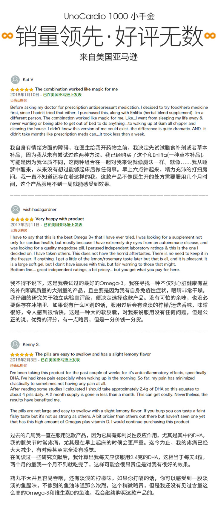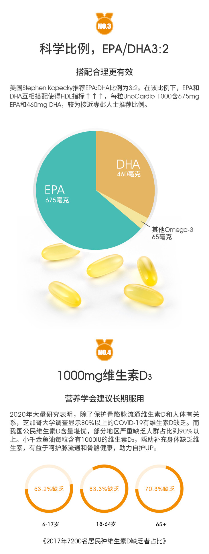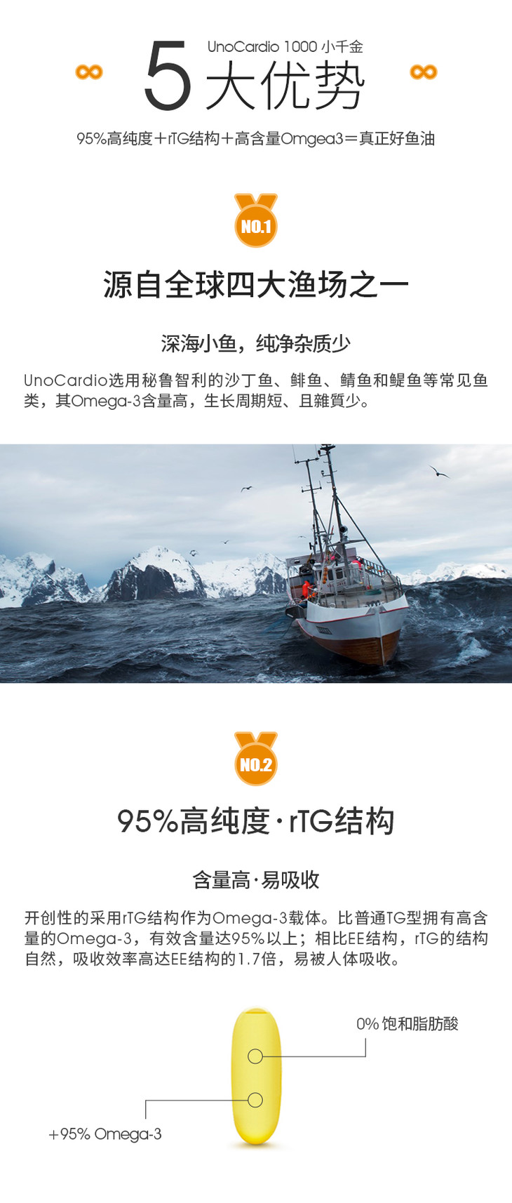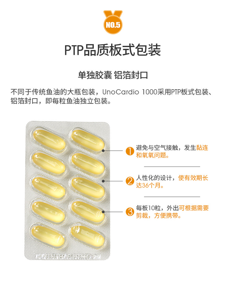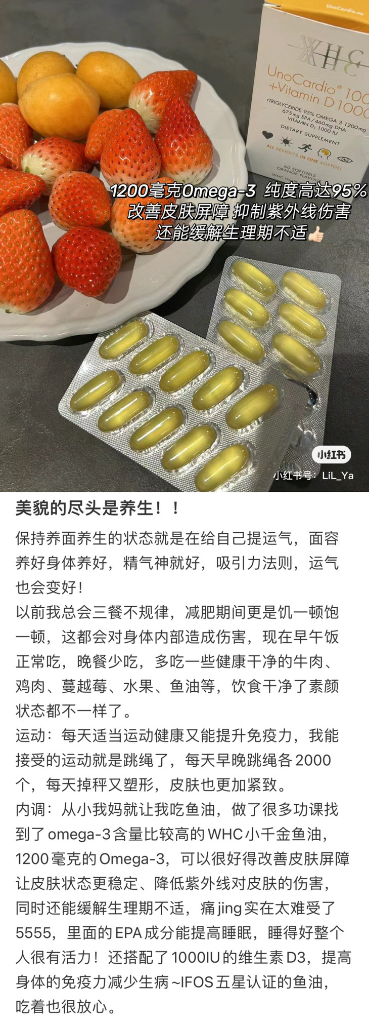 小千金鱼油纯度高达95%,每粒1200mg的omega-3的高高高含量,选用智利和秘鲁渔场的深海小鱼,胶囊壳也是天然鱼明胶,它的EPA和DHA是医学界公认的黄金比例3:2,从成分配比、原料、细节各个方面都很优秀。而且相比市面上普通鱼油,小千金用的是rTG结构,纯度geng高,也geng易吸收。同时,小千金还含有1000IU维生素D,对于免疫力的影响、钙吸收、情绪平缓都蛮有帮助的。 WHC的鱼油没有鱼腥味,而是淡淡的橙味,会更好接受,并且采用医药级PTP独立包装,可以有效防止粘连,随身携带也更方便。