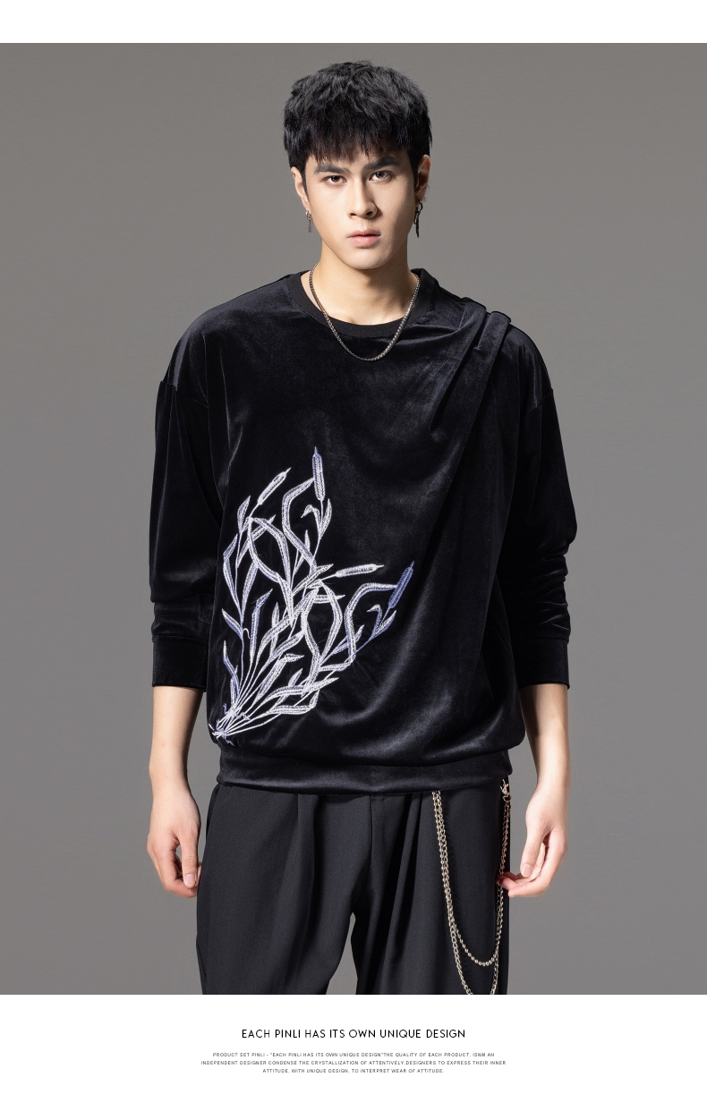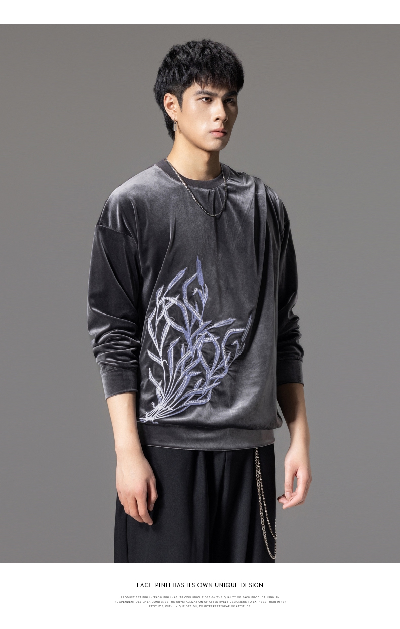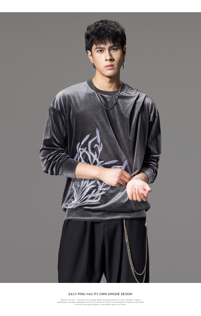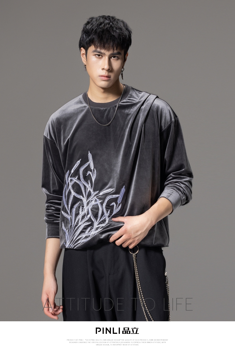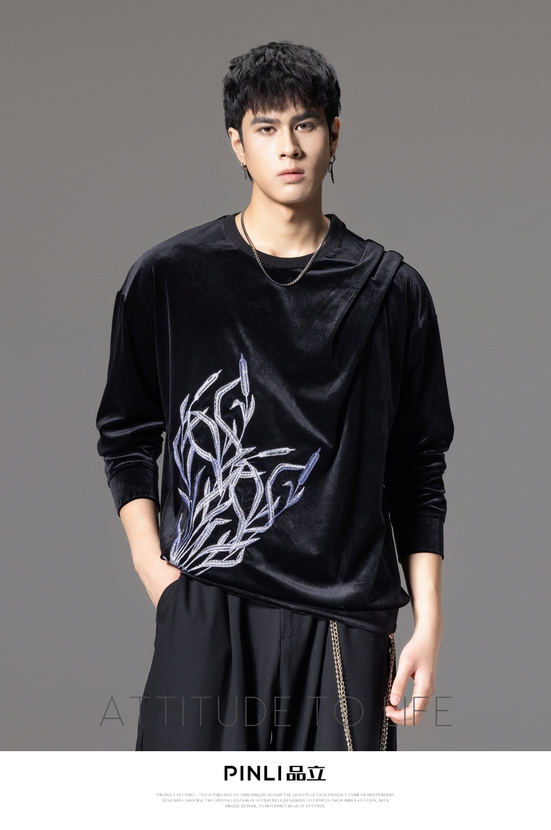 PINLI品立秋季新款中国风刺绣圆领卫衣男士国潮丝绒长袖上衣B243109014
