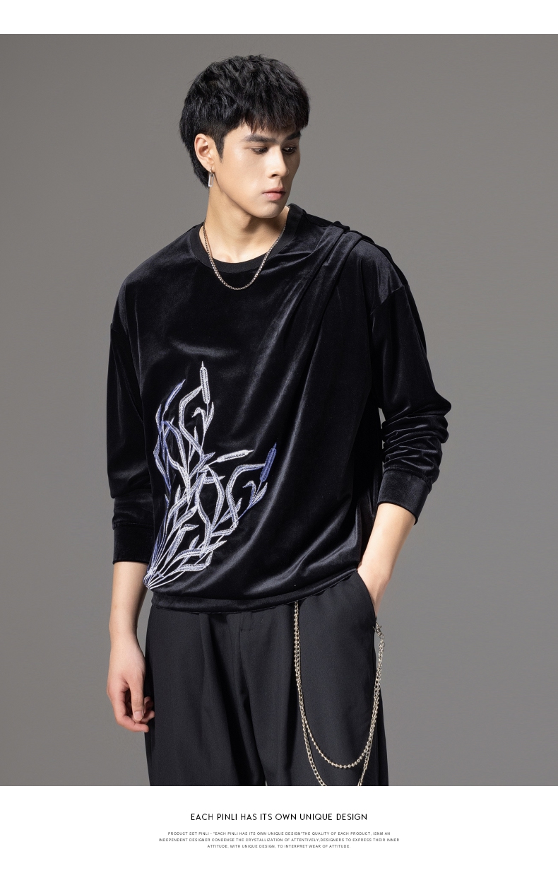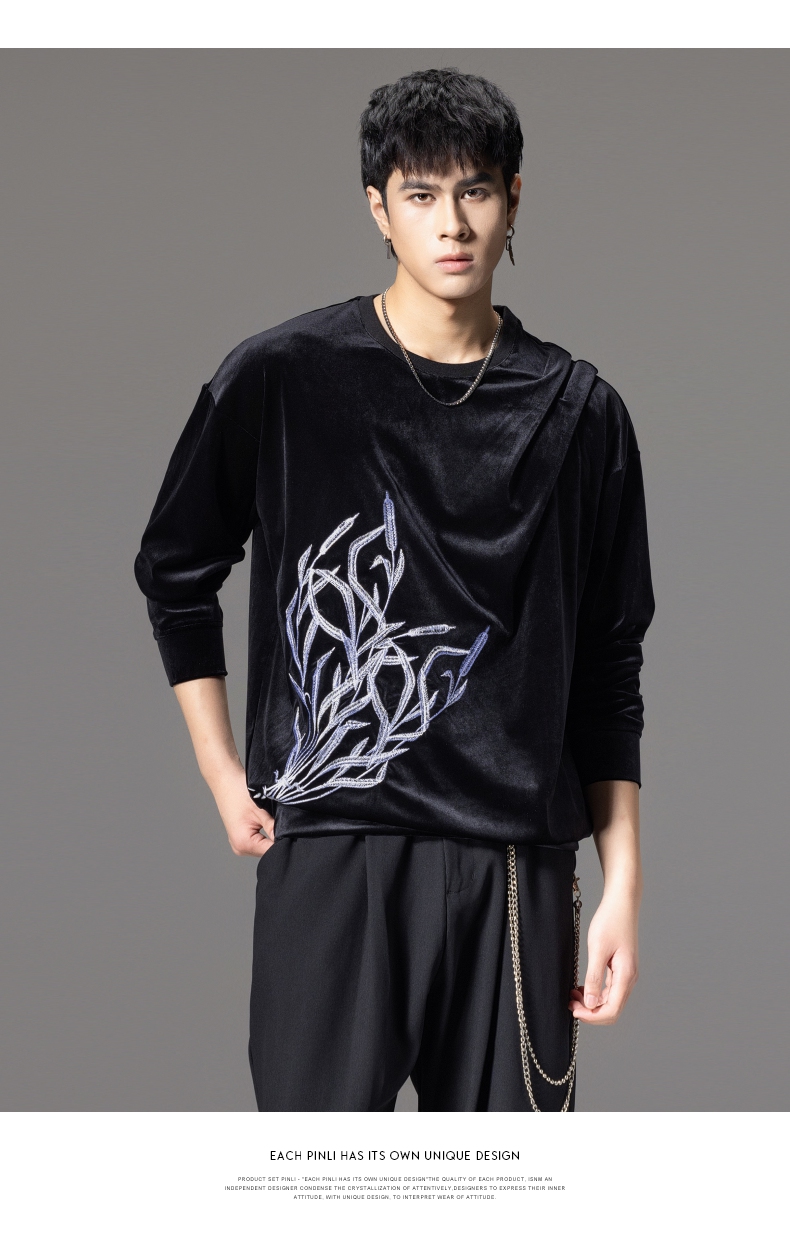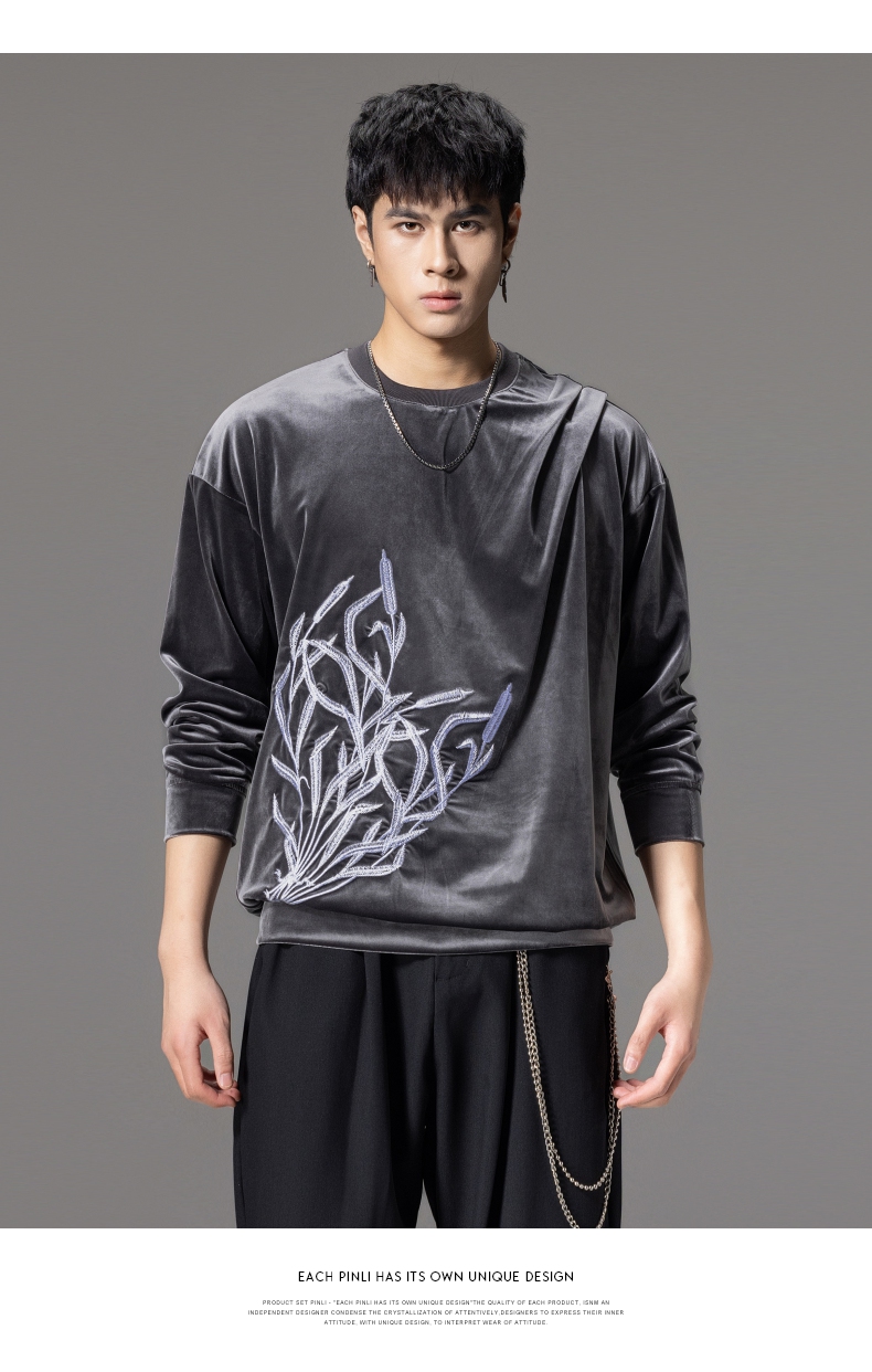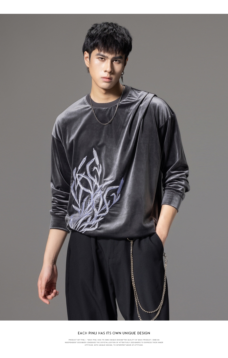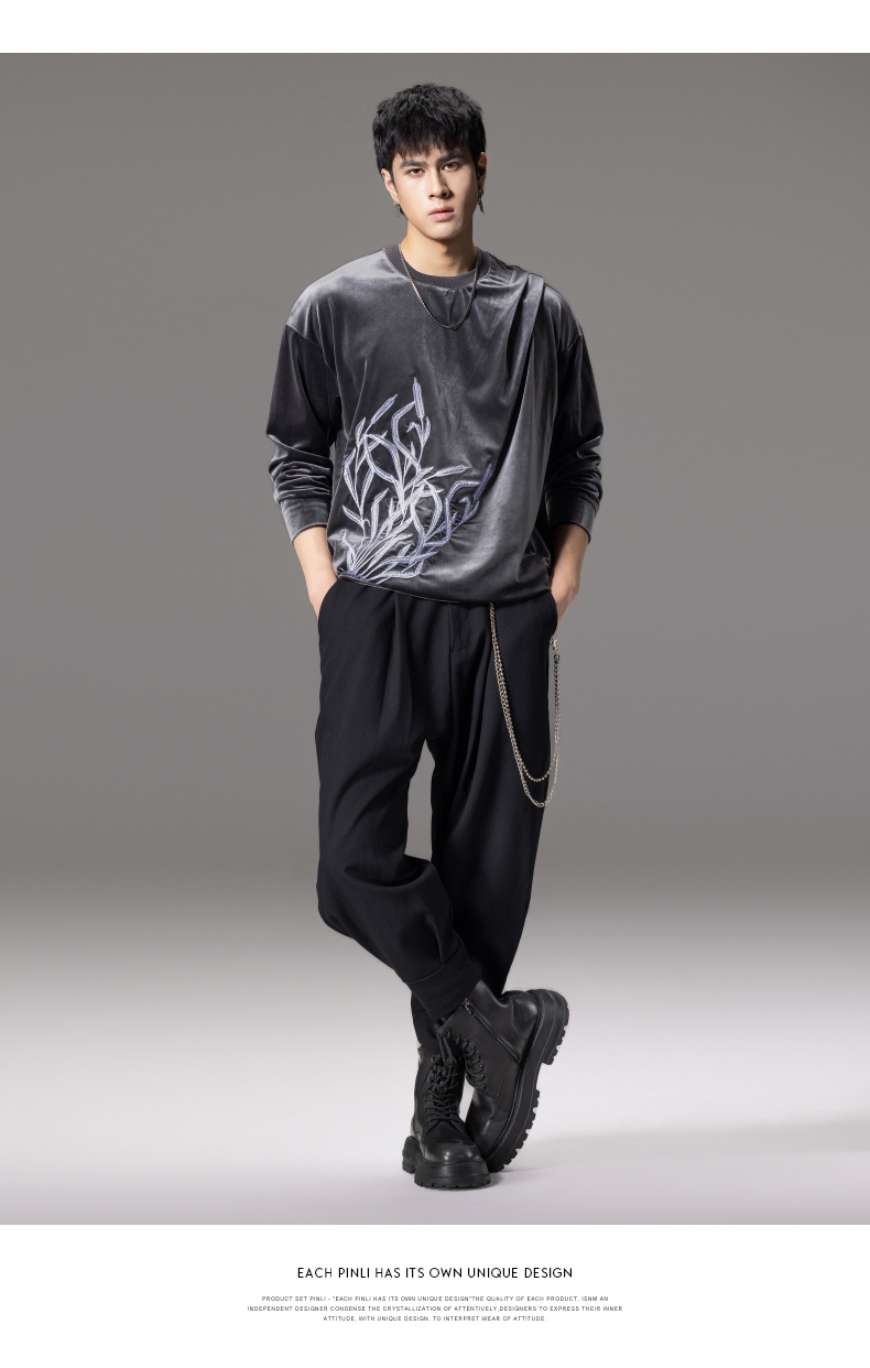 PINLI品立秋季新款中国风刺绣圆领卫衣男士国潮丝绒长袖上衣B243109014