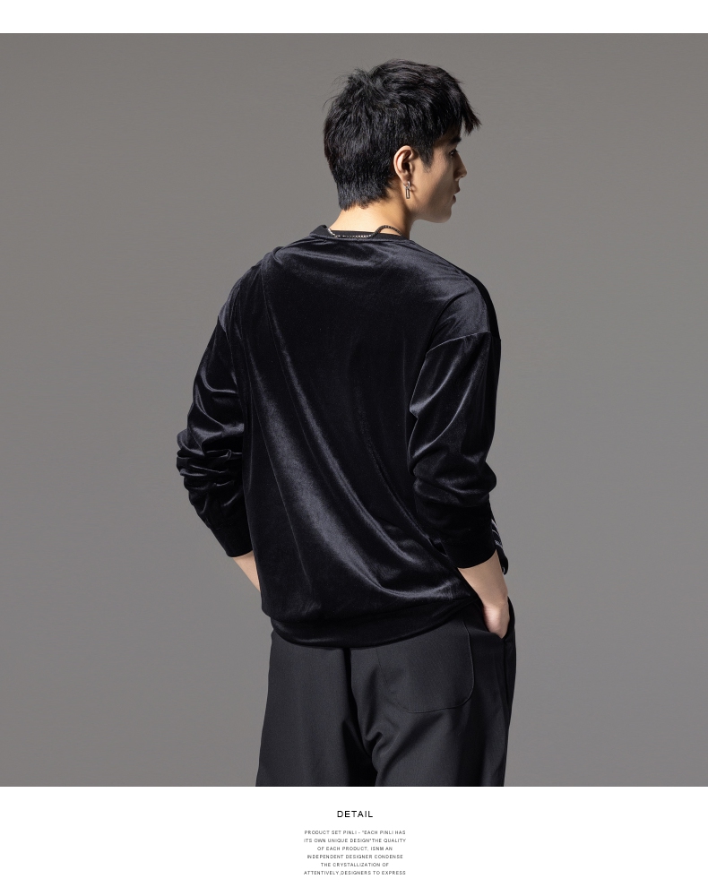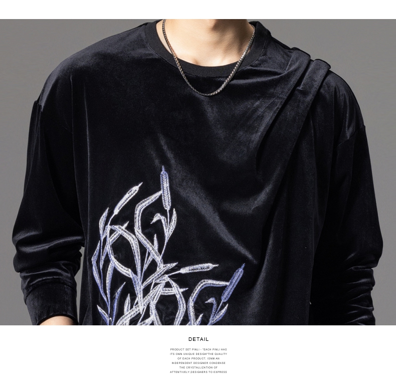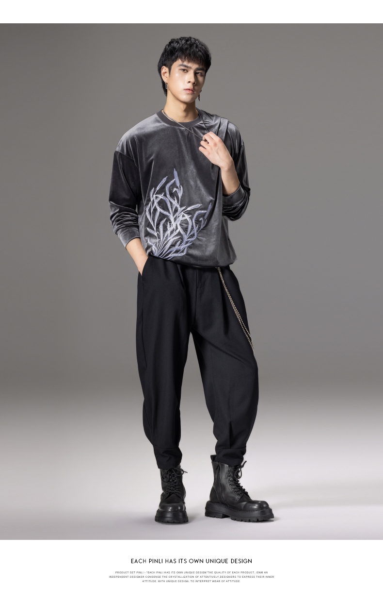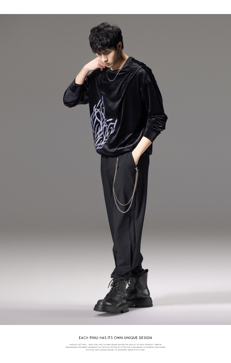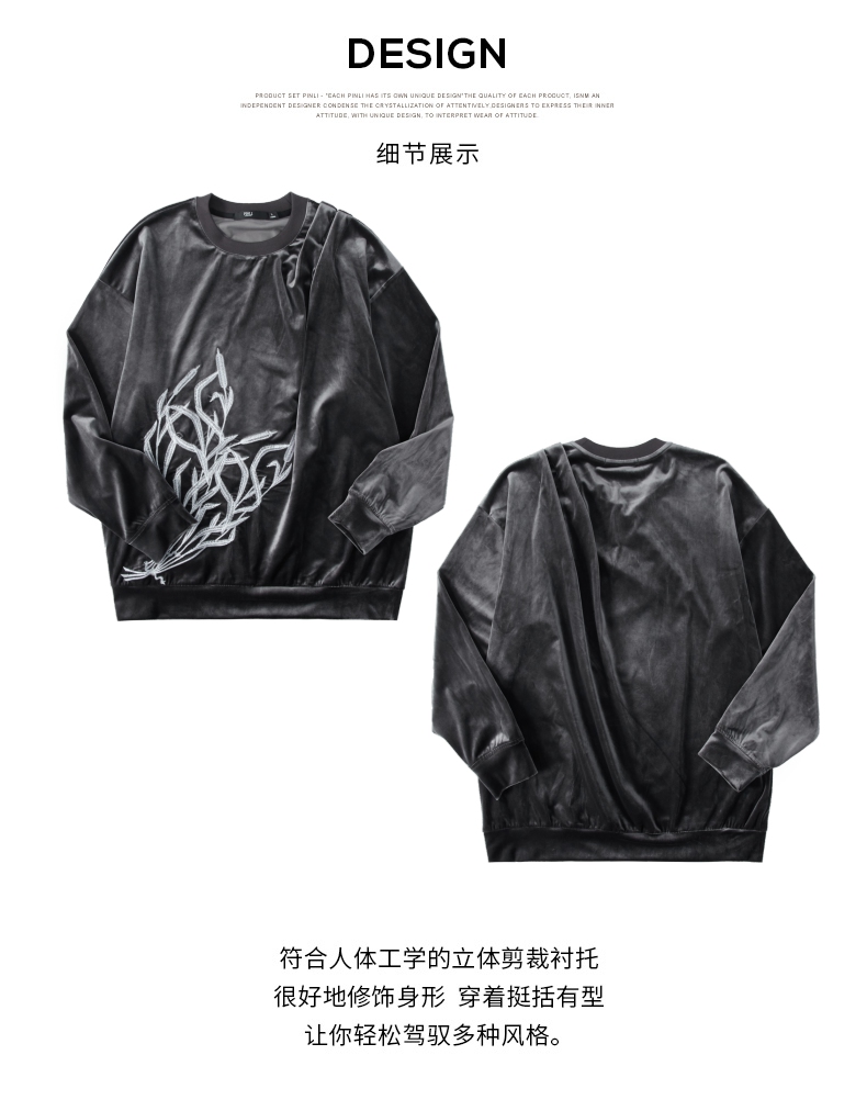 PINLI品立秋季新款中国风刺绣圆领卫衣男士国潮丝绒长袖上衣B243109014