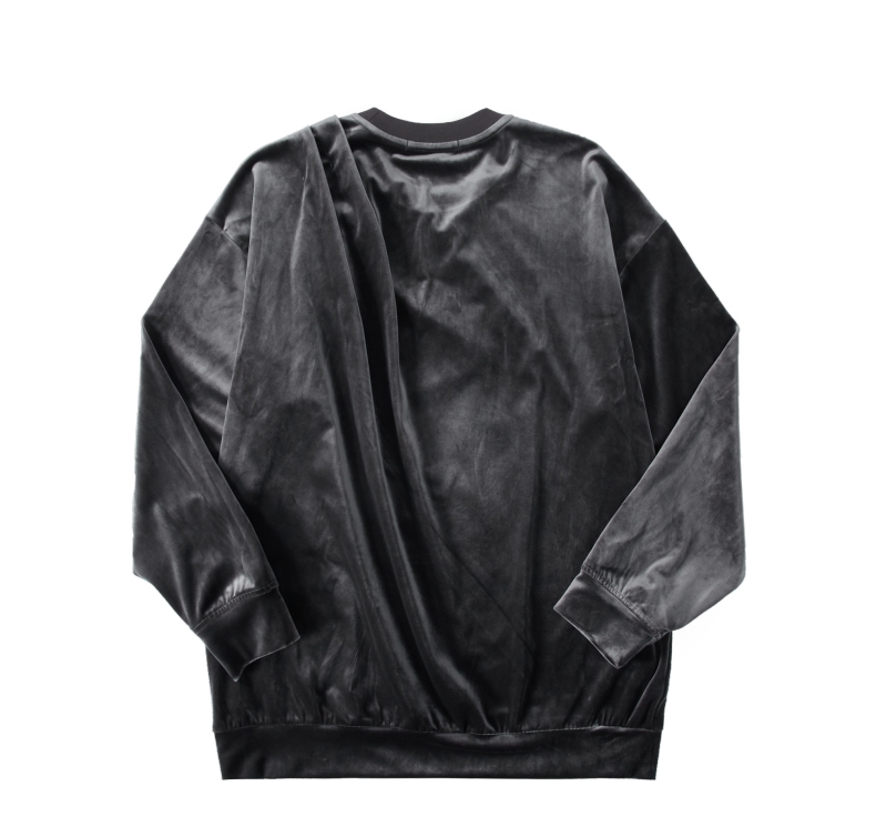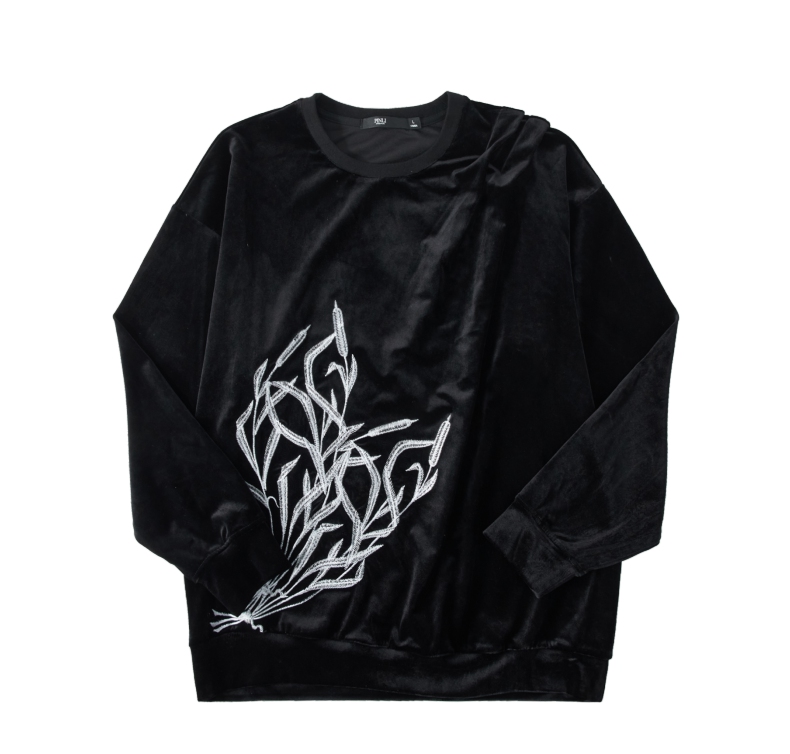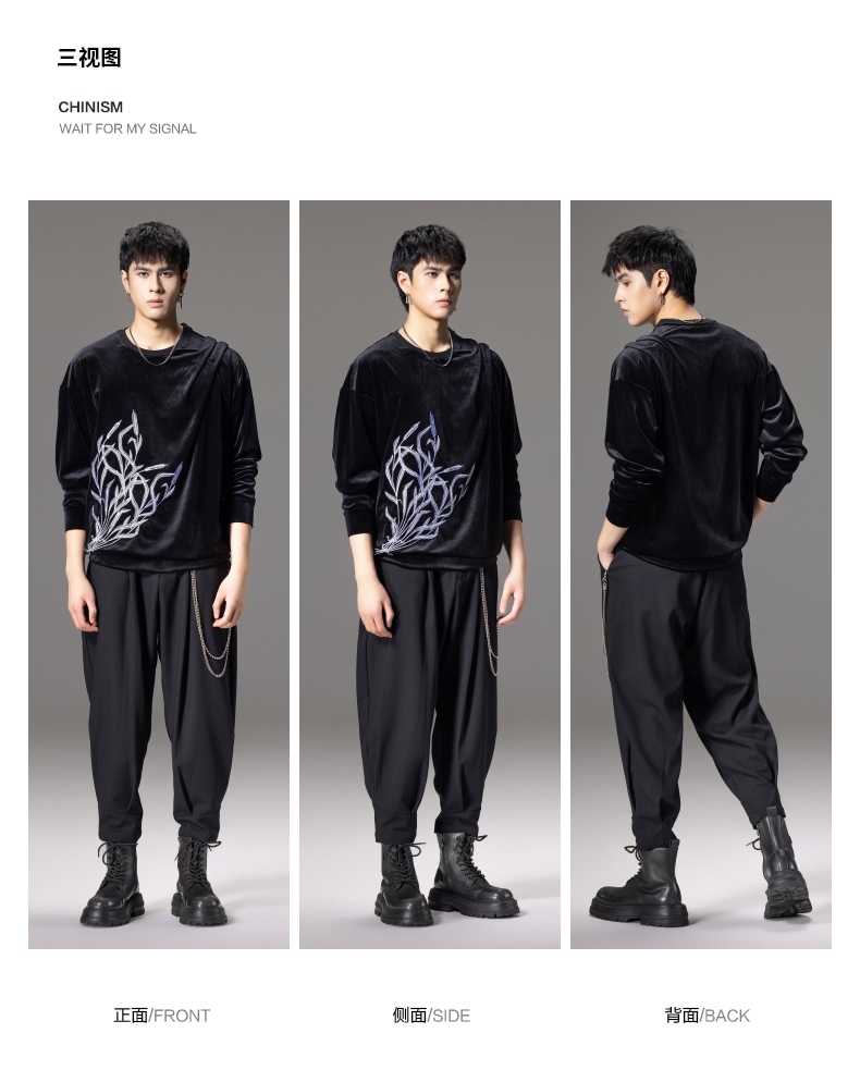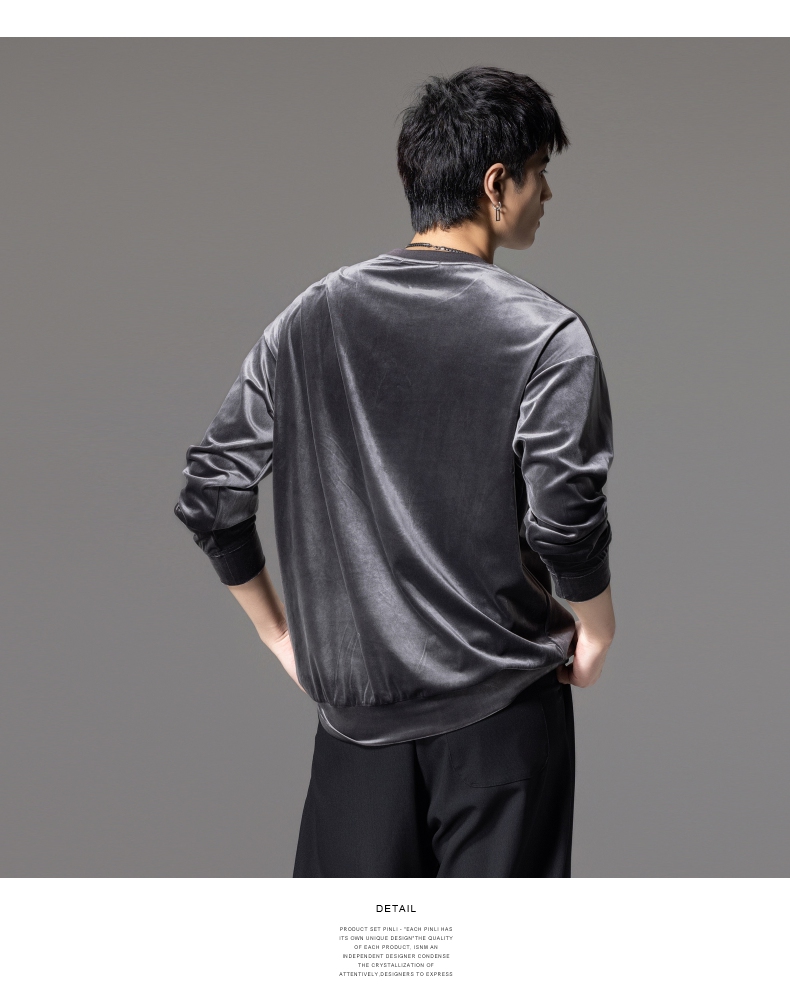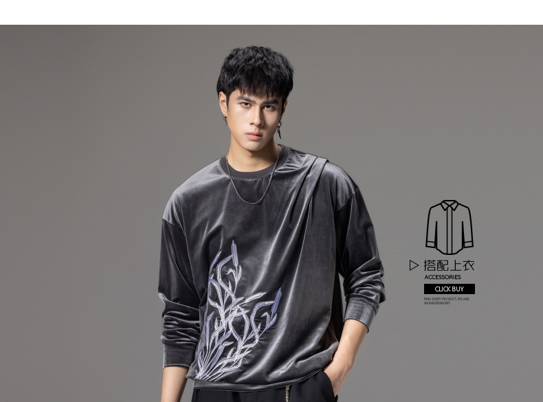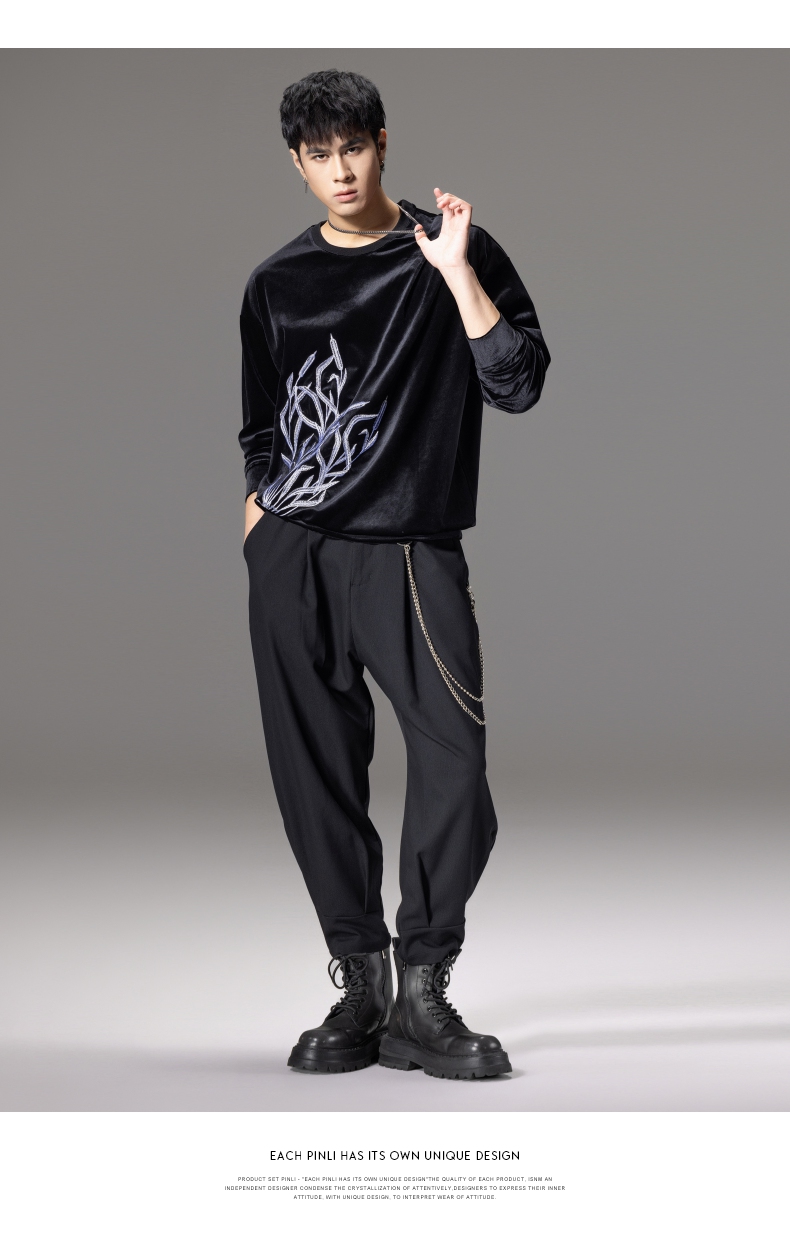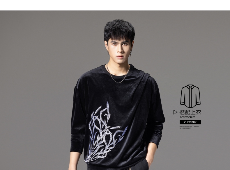 PINLI品立秋季新款中国风刺绣圆领卫衣男士国潮丝绒长袖上衣B243109014