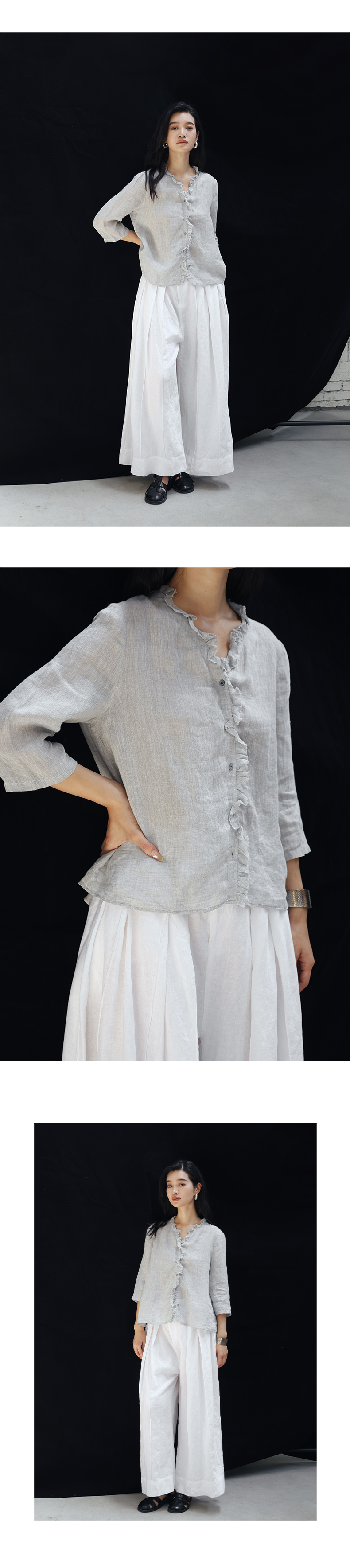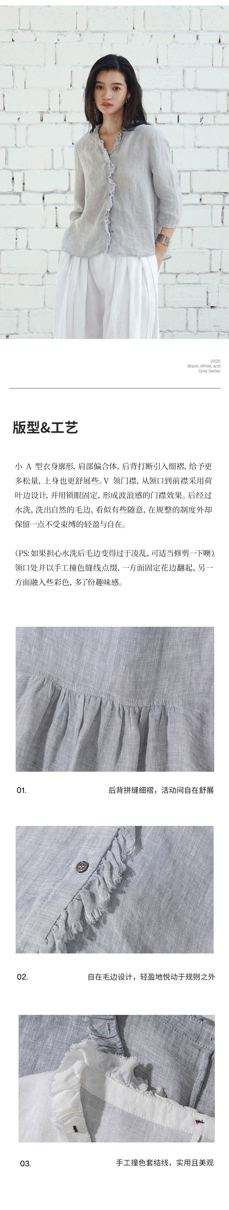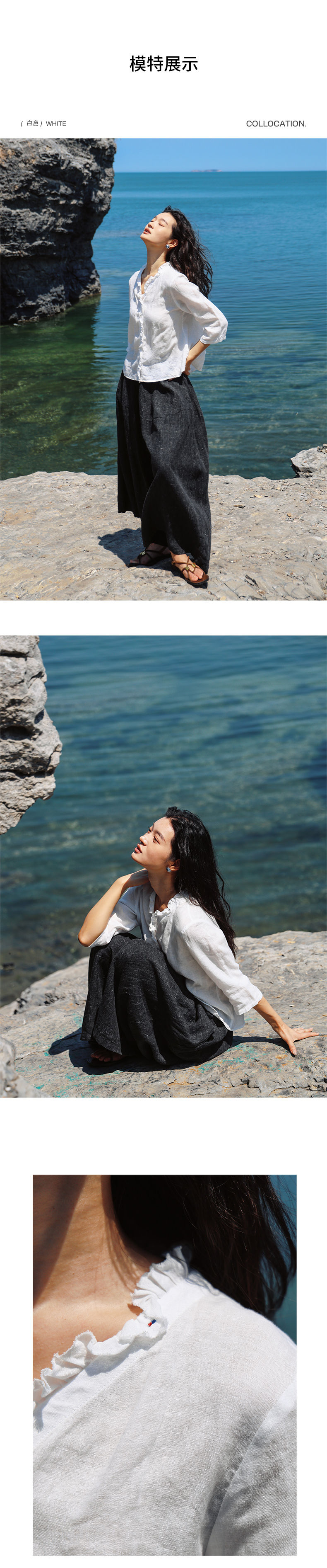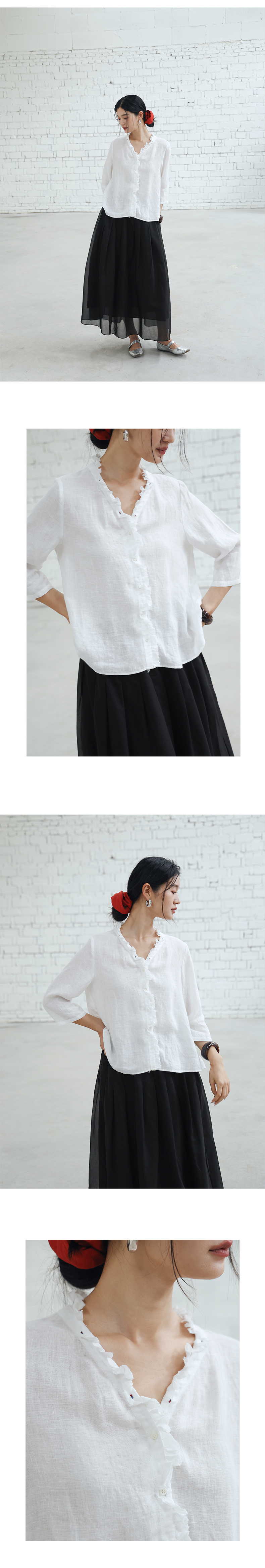 绽放437朵/【黑白灰系列·浪花衬衣】新款亚麻九分袖女荷叶边衬衫