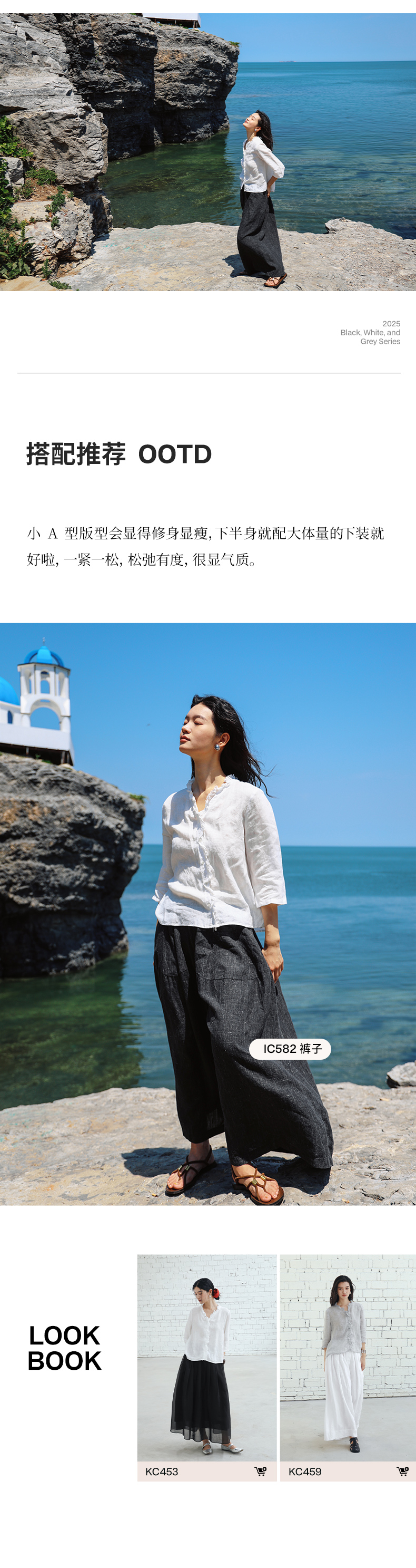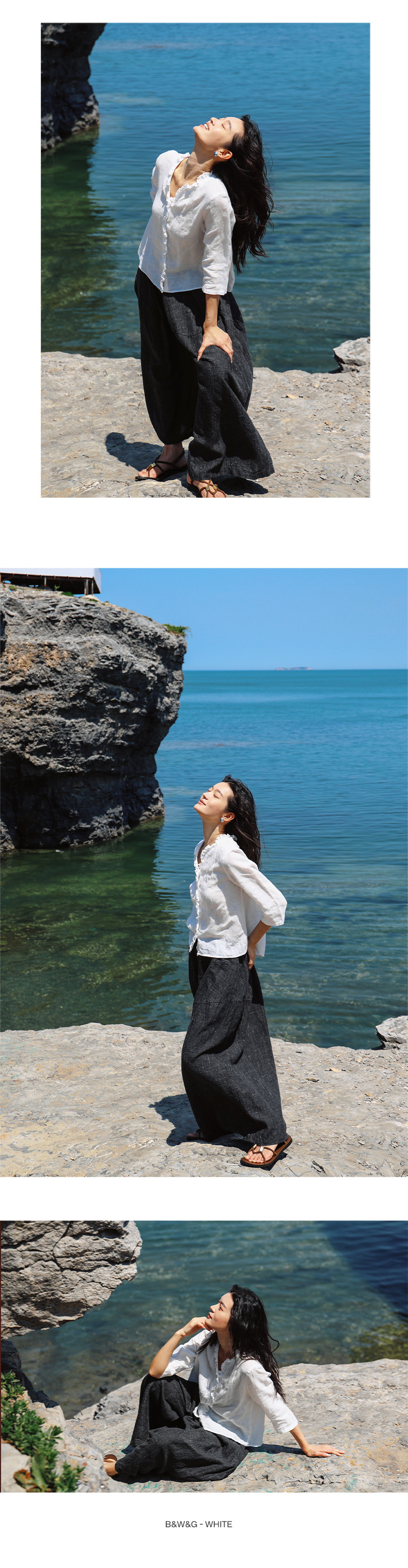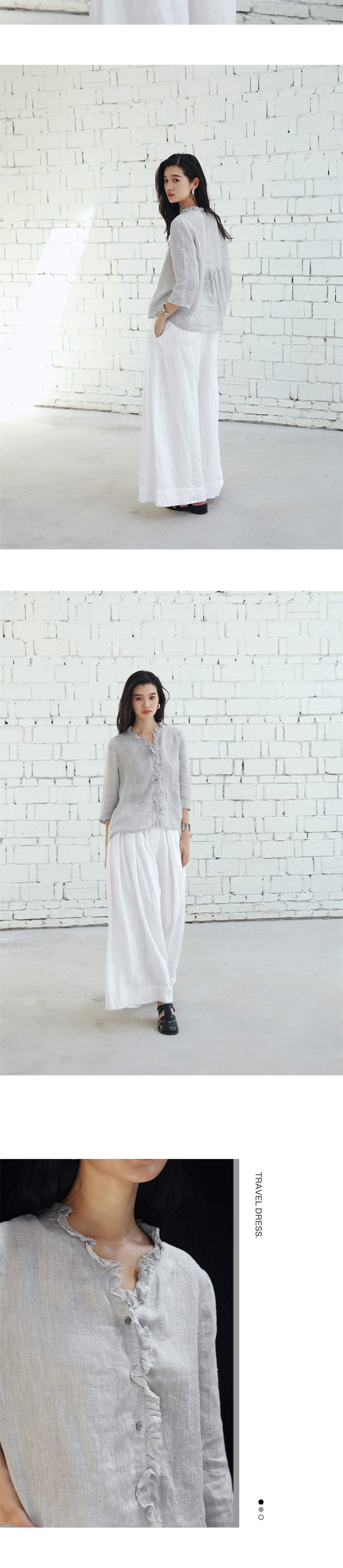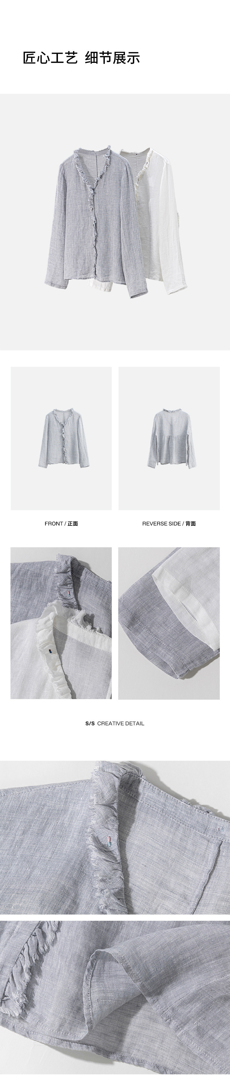 绽放437朵/【黑白灰系列·浪花衬衣】新款亚麻九分袖女荷叶边衬衫