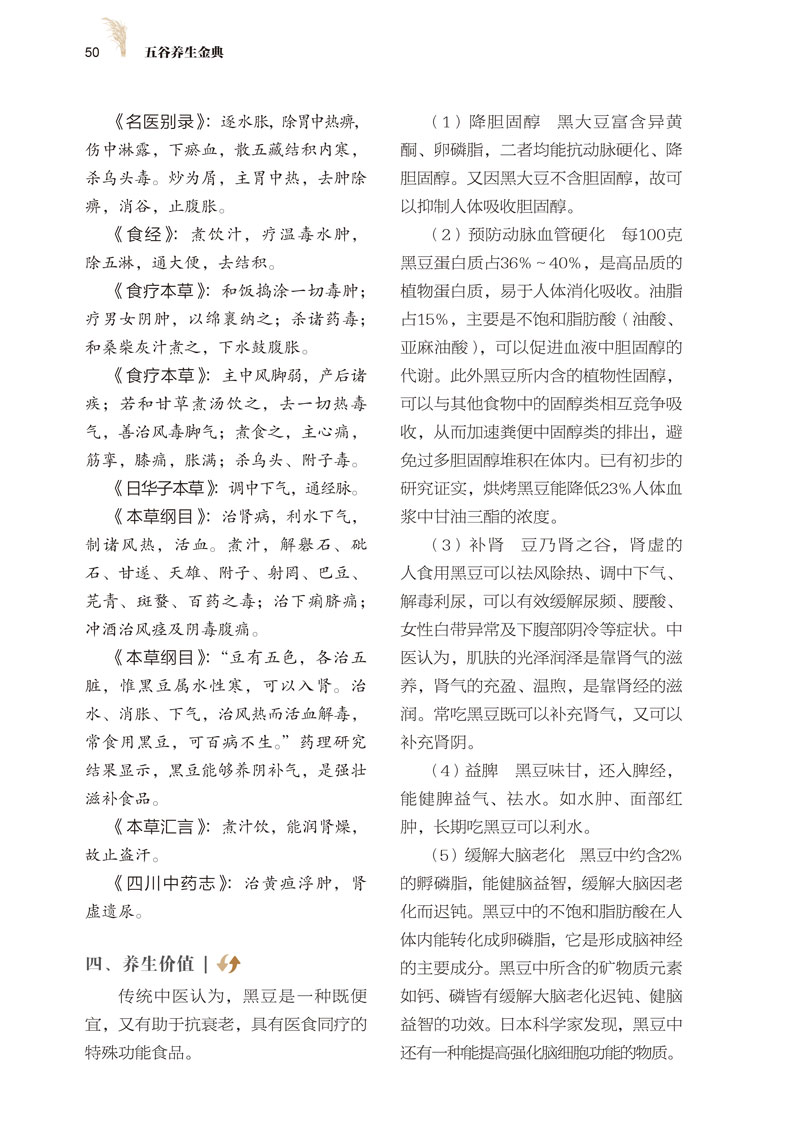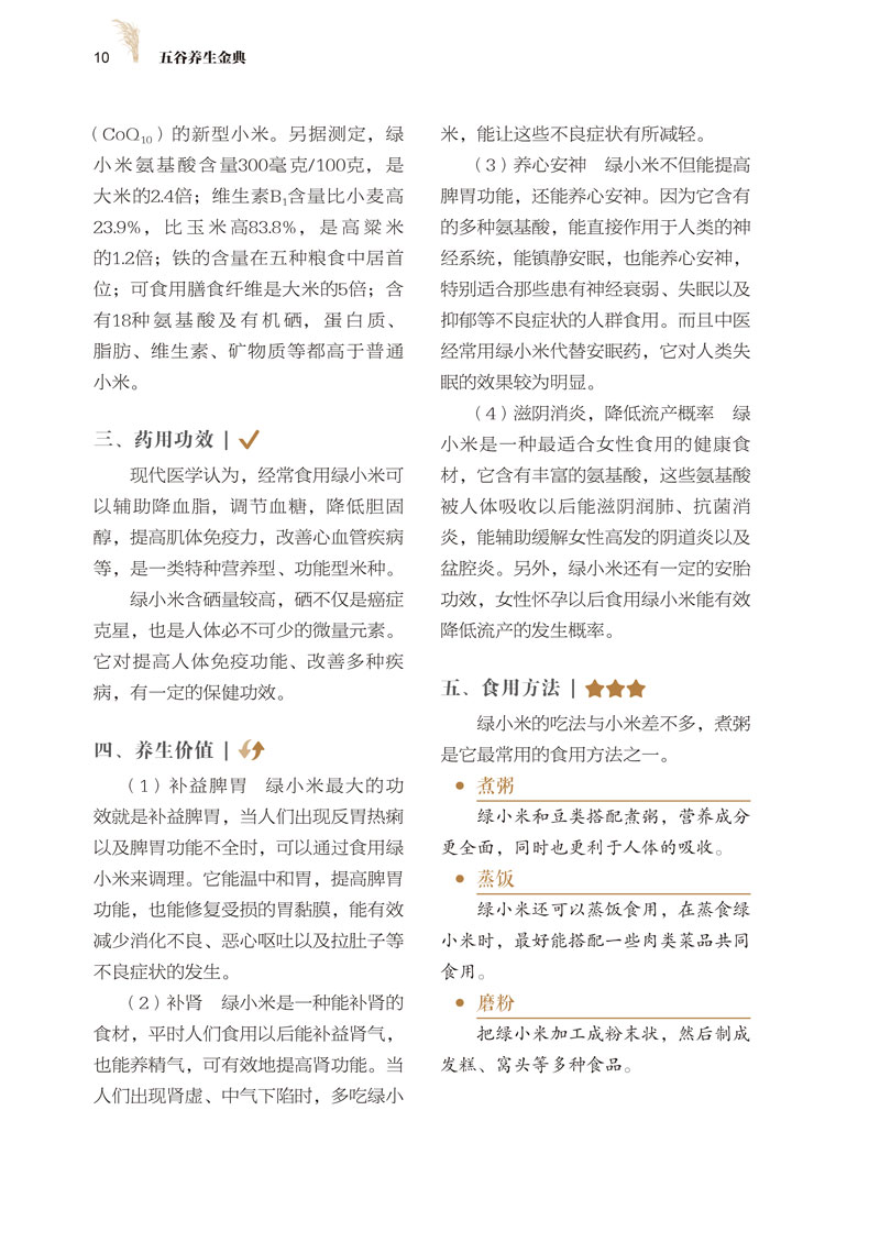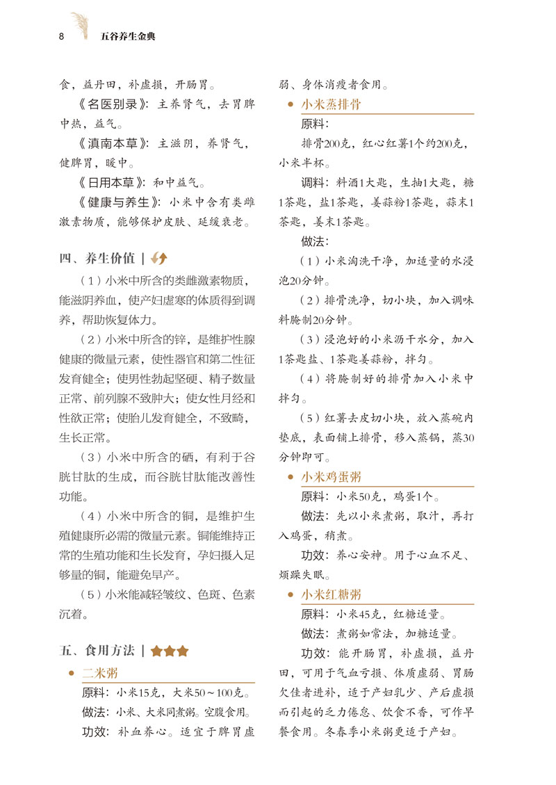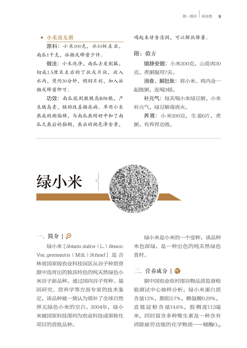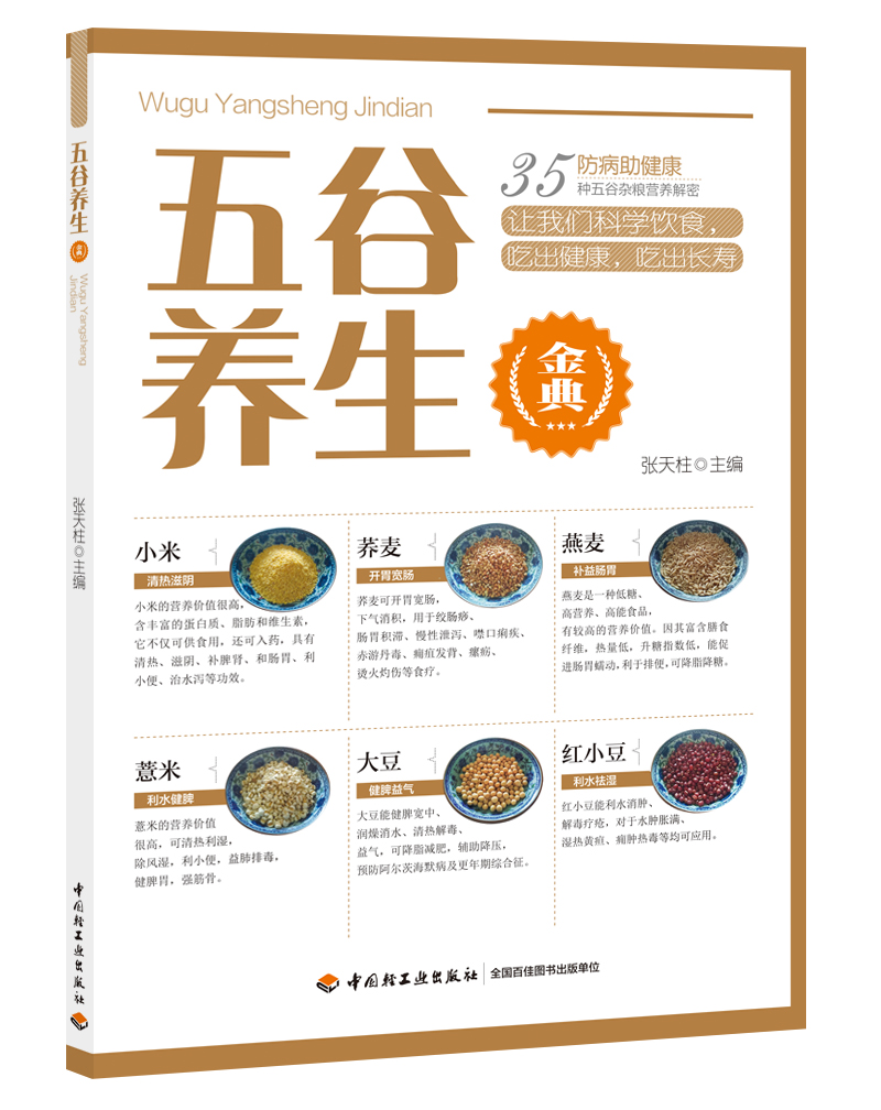 “五谷”是指水稻、小麦、玉米、谷子、高粱、大豆等主要粮食作物,谷物通过加工为主食,为人类提供了50%~80%的热量、40%~70%的蛋白质以及60%以上的维生素。《五谷养生金典》从五谷养生的角度出发,参考了《本草纲目》《日用本草》《名医别录》等我国历代古医书和五谷营养、五谷养生等文献资料,汇集了35种禾谷类、豆菽类、油料类作物,对每一种谷物的基本情况(拉丁名、俗称、植物学分类、种植分布等)、营养成分(蛋白质、脂肪、碳水化合物、膳食纤维、微量元素、维生素等)、药用功效(性味、归经、功效)、养生价值等进行了较为详细的论述,并推荐了一些食用方法。