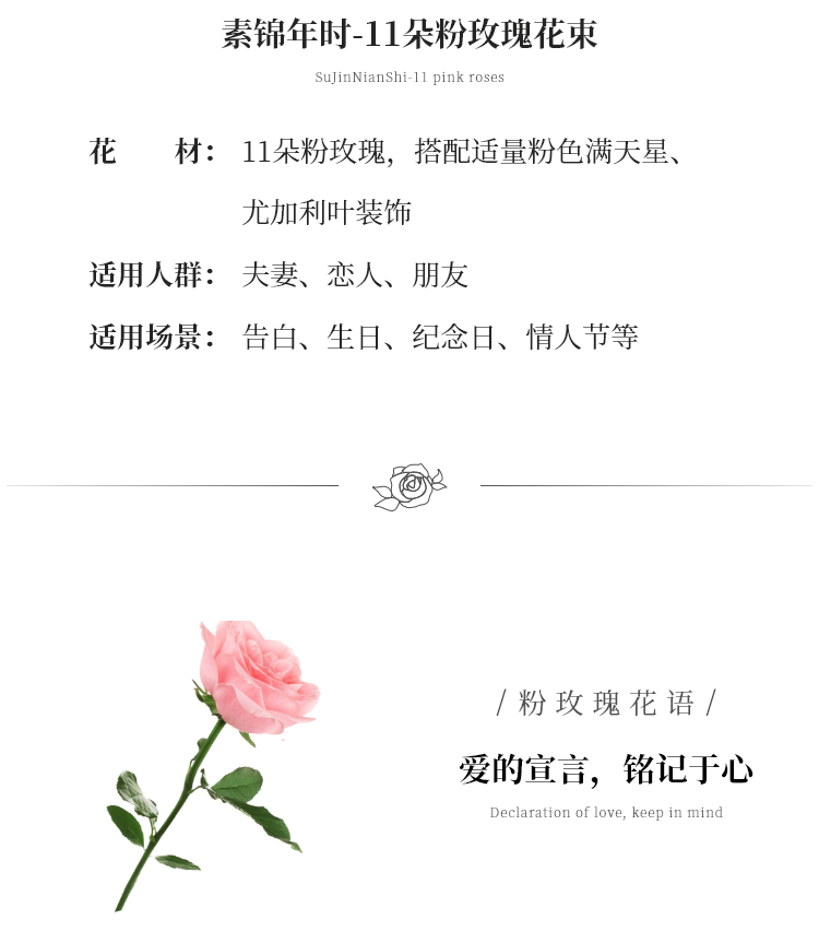 材料:11朵粉玫瑰,搭配适量粉色满天星、尤加利叶装饰包装粉色雾面纸