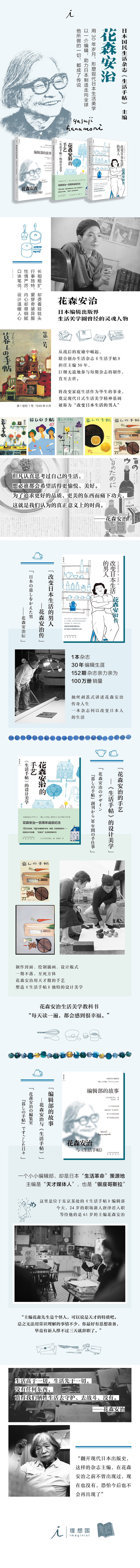 花森安治个性格鲜明,既被人称为“天才媒体人”,也有“银座哥斯拉”“奇男子”的绰号——语言犀利,冷酷无情,独断专行,似乎都能在他身上应验。但是对出版人的使命,对杂志、书籍,对日常生活,都有独到的见解。作为杂志主编,他以一丝不苟的匠人之心,事无巨细地参与到杂志的出版中,包括选人用人、商品测评、选题策划,乃至修改文字、绘制插画、书籍装帧、监督下印,甚至还有杂志社的一日三餐,等等。在他的推动下,《生活手帖》销量一度突破100万册,他因此被称为“改变日本生活的男人”。