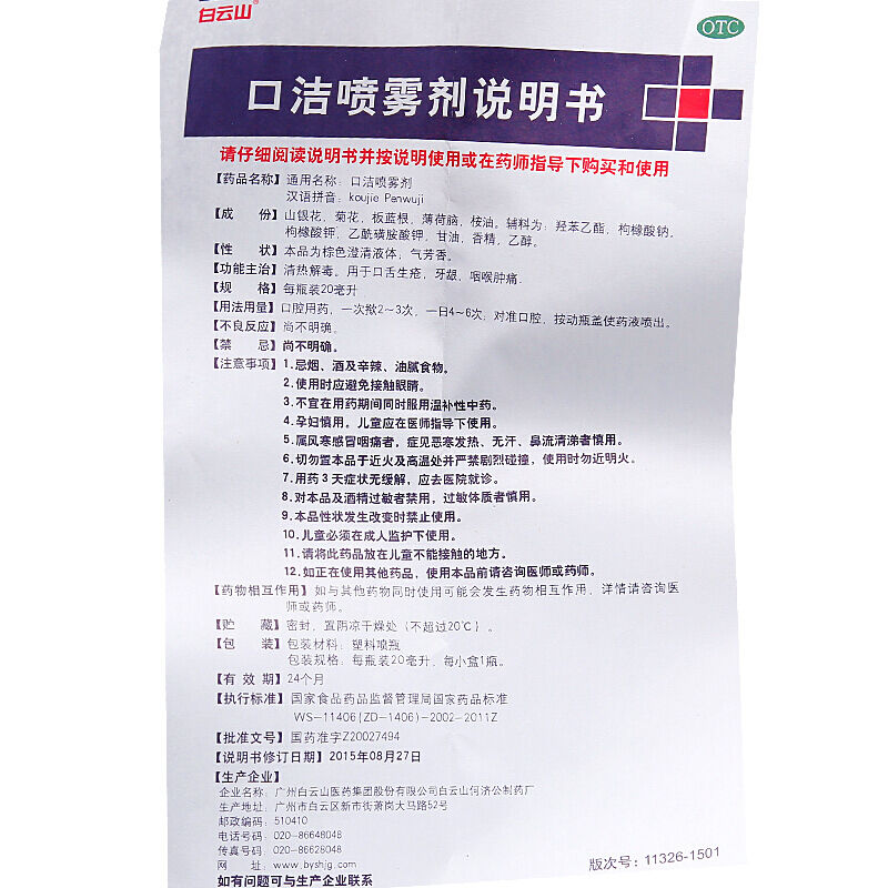 白云山口洁喷雾剂 20ml*1瓶/盒清热解毒口舌生疮 牙龈 咽喉肿痛
