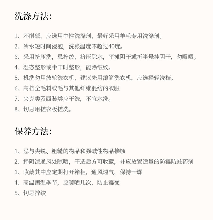 洗涤建议:建议干洗,或用中性洗涤剂低温手洗。