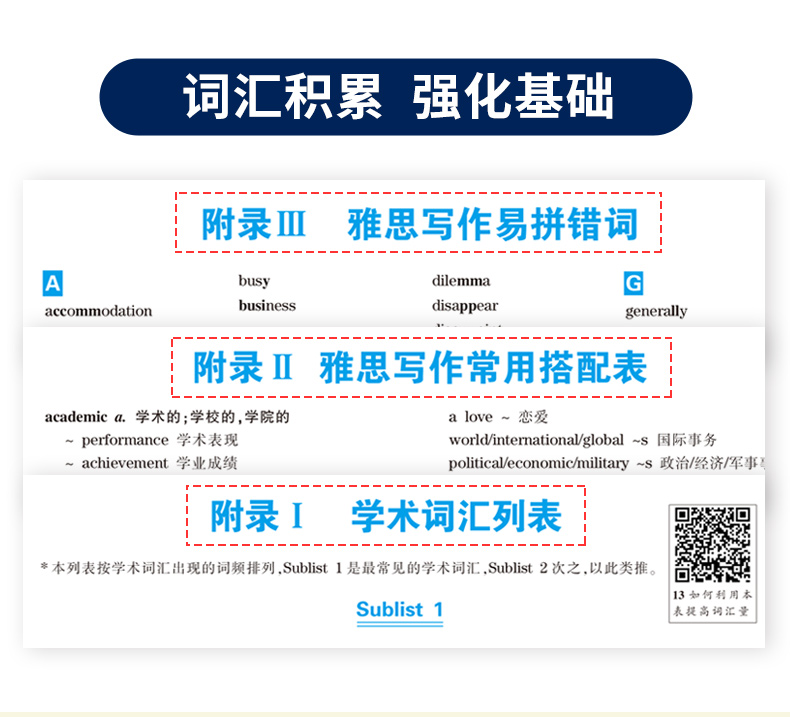 本册附录内容丰富,收录各类雅思话题写作的素材,内容包括17类常考话题的观点和主题词汇、学术词汇表、雅思写作常用搭配表以及雅思写作易拼错词等。免除考生因不熟悉话题,无从下笔或因缺少观点论据无话可写的烦恼。