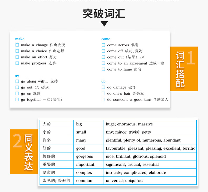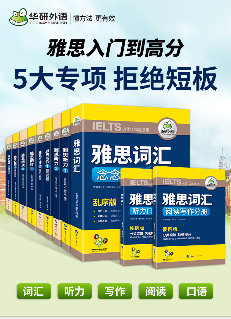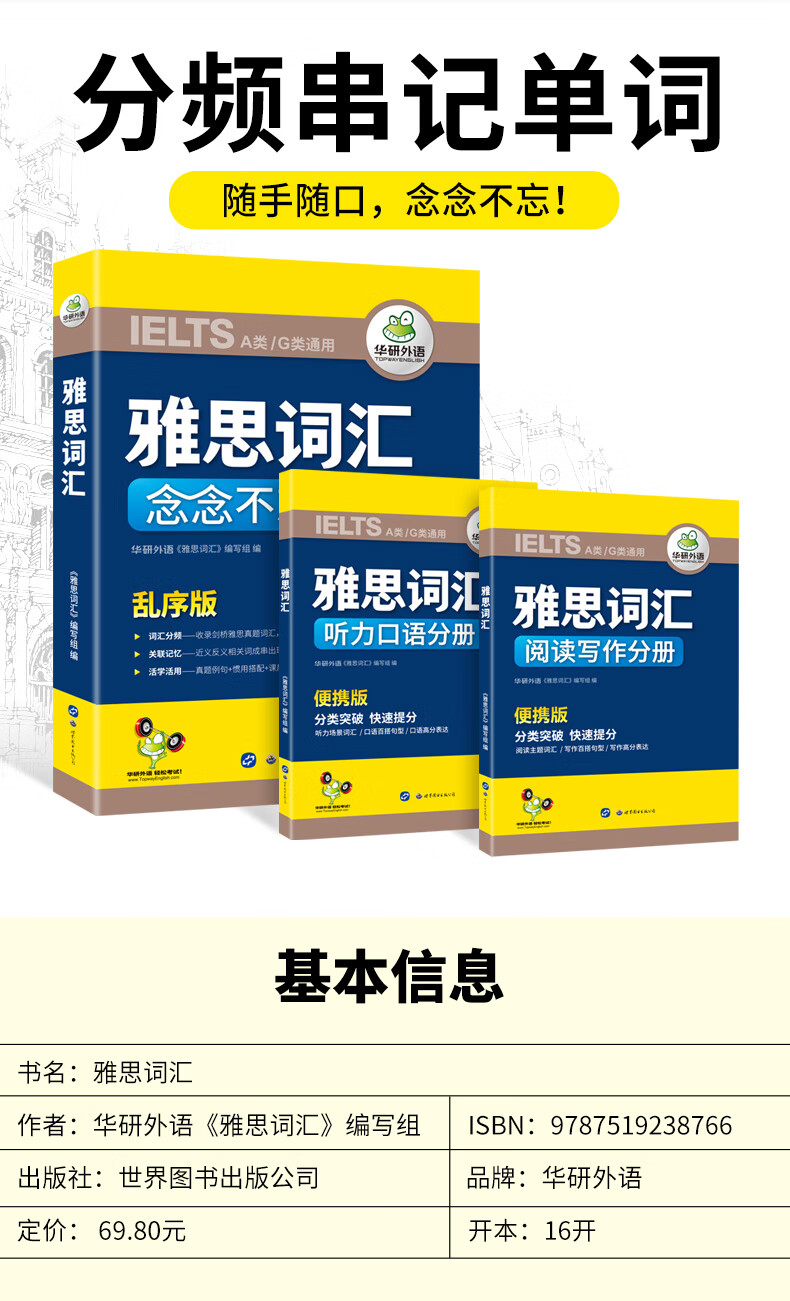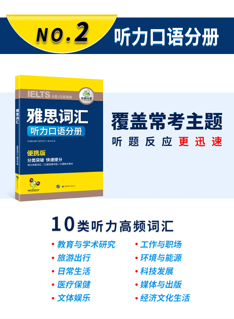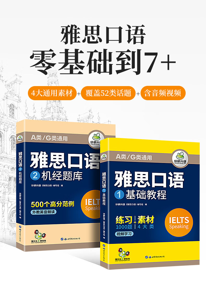 1.两册装,上册为雅思口语基础教程,从发音、词汇、语法入门,提高口语发音准确性和流畅度,积累口语主题词汇及观点,有1000道练习题和4大类素材库。下册为机经题库,配500个高分回答范例及外教英音朗读音频;