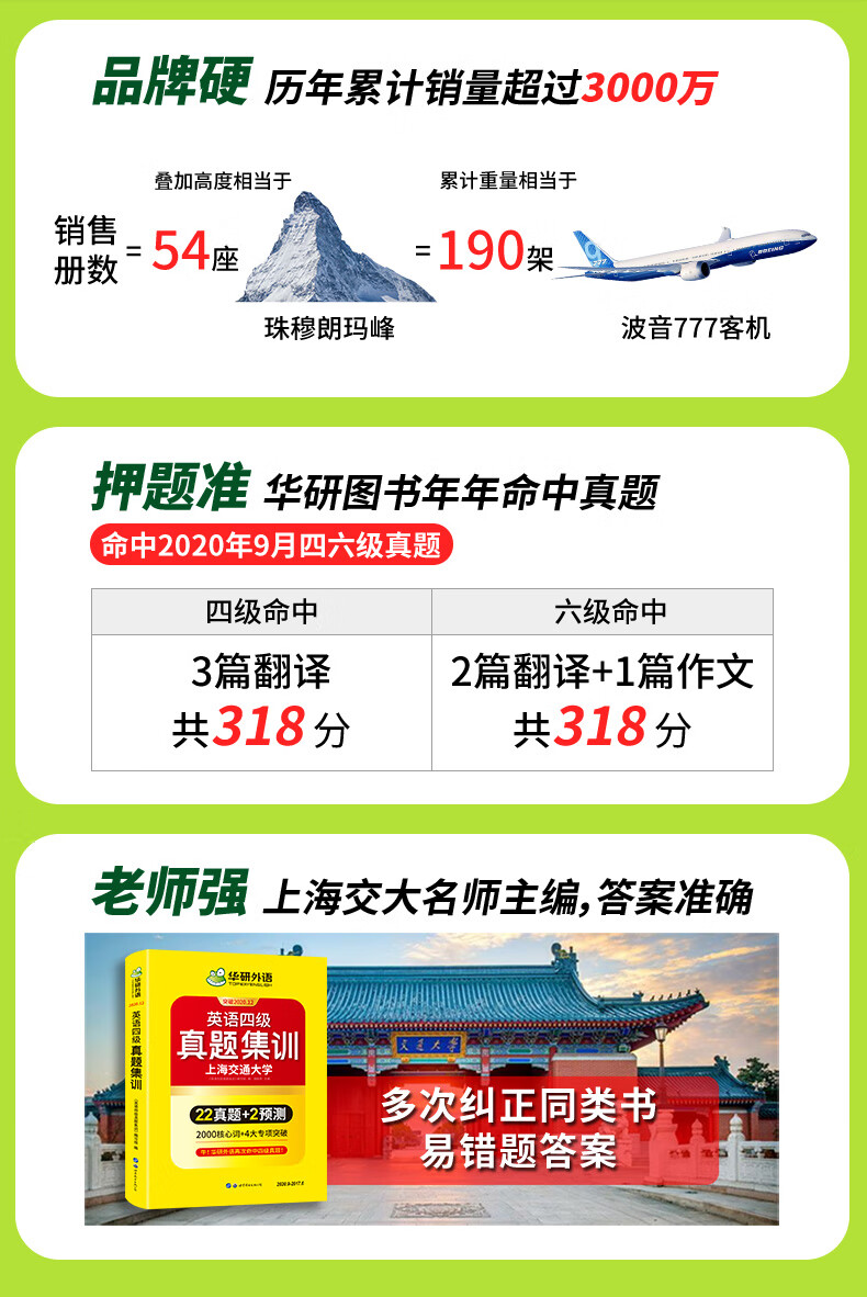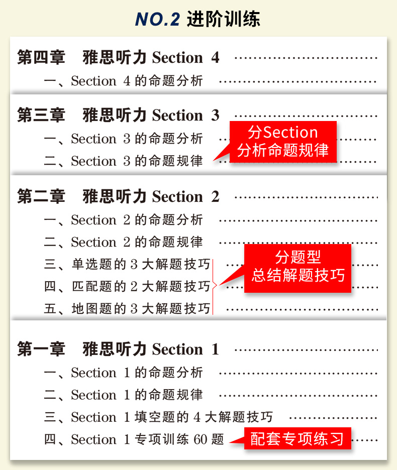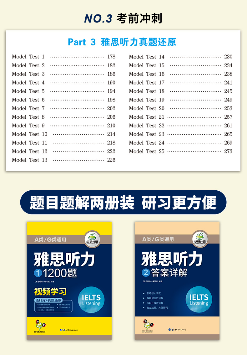 3. 海量训练,包括200题听力基础技能训练、6套专项训练和25套真题还原训练,在海量训练中总结做题技巧和提高分数。