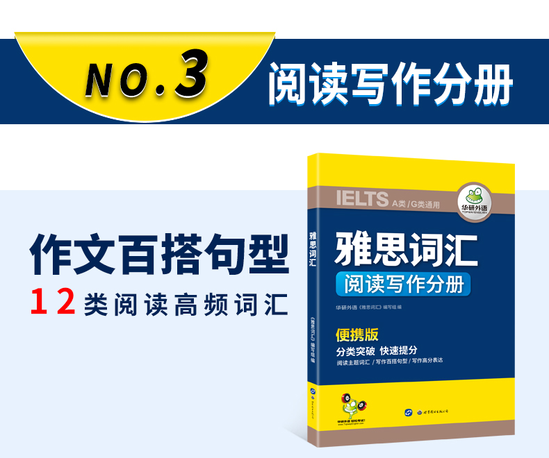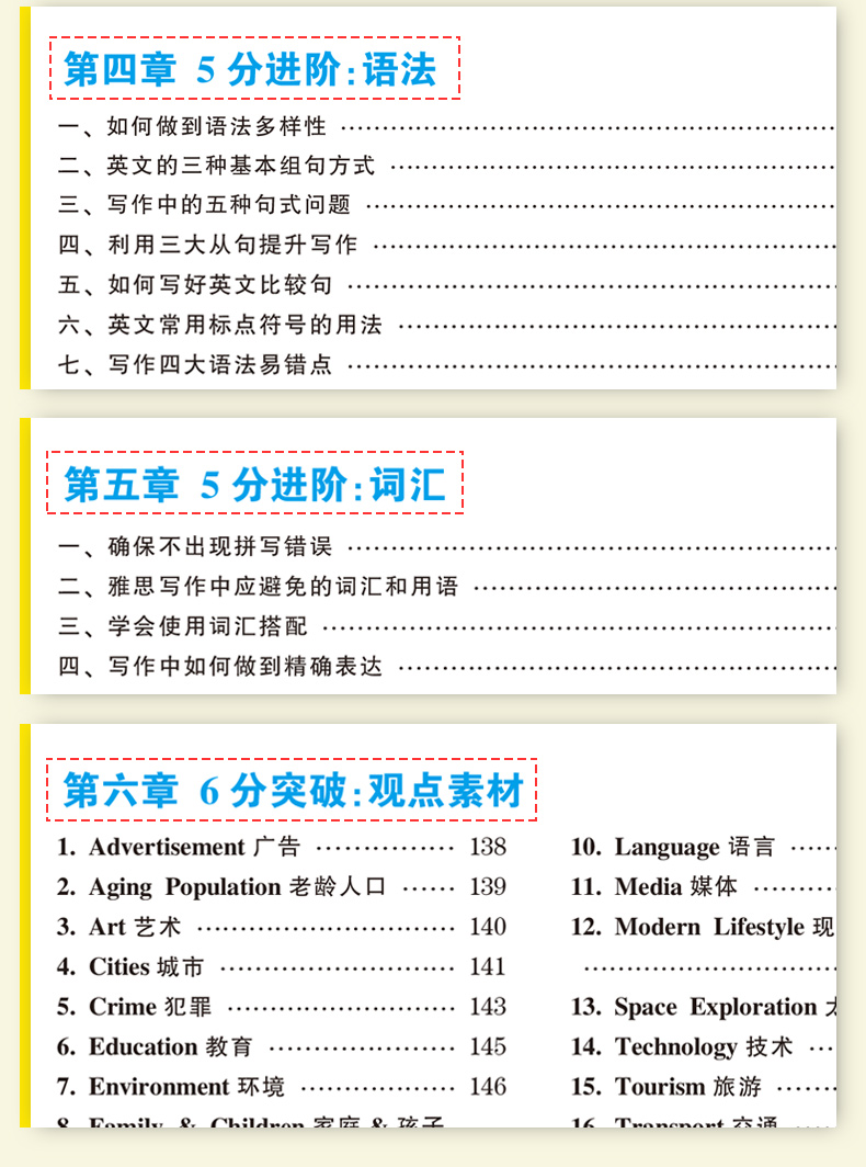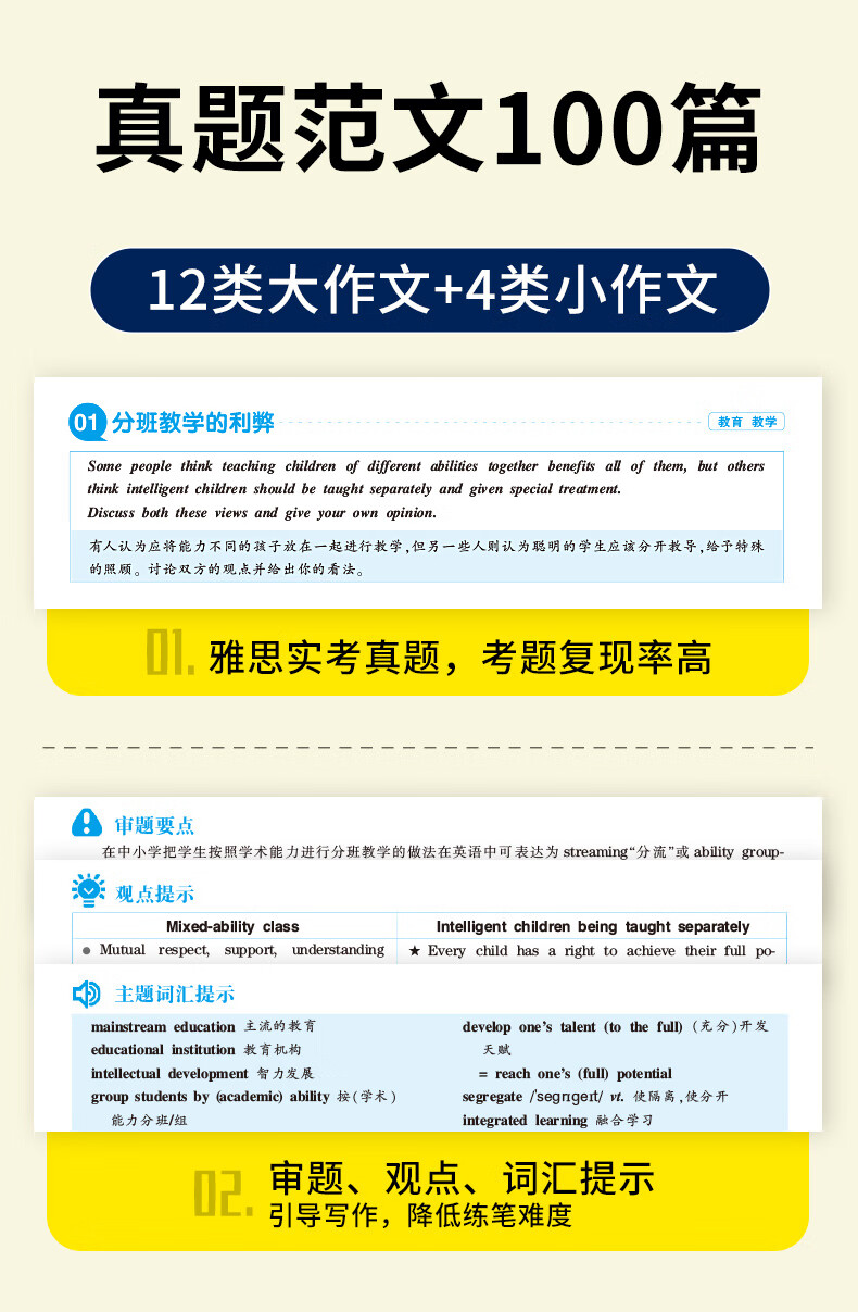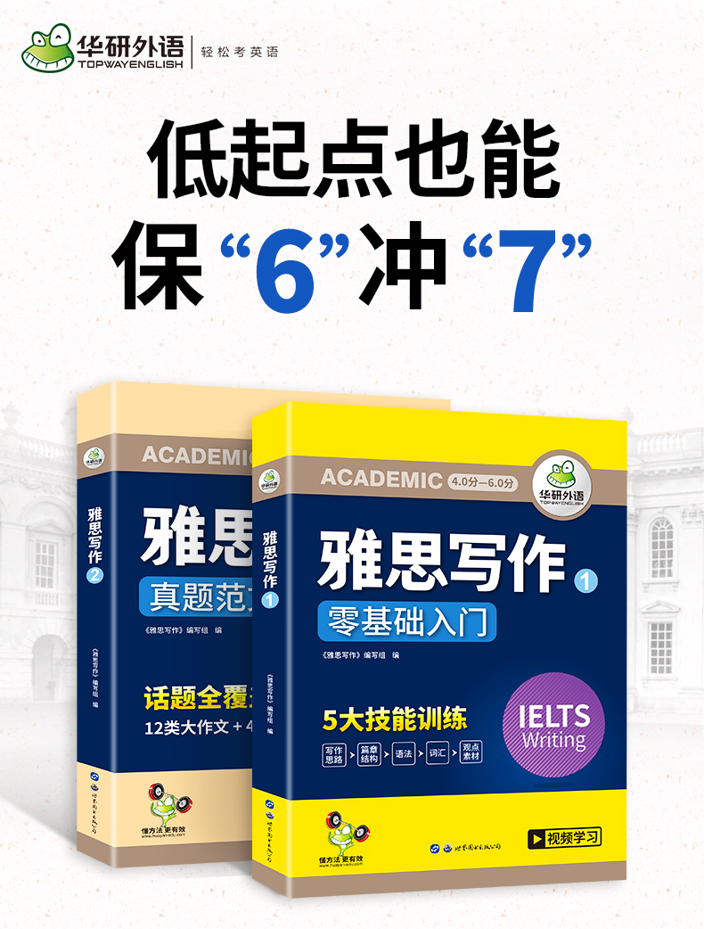 1. 两册装,上册为写作基础教程,掌握雅思写作要领,学习英文写作原则,学会英文造句及炼词。下册为题库范文,100篇雅思真题范文,以练带学。