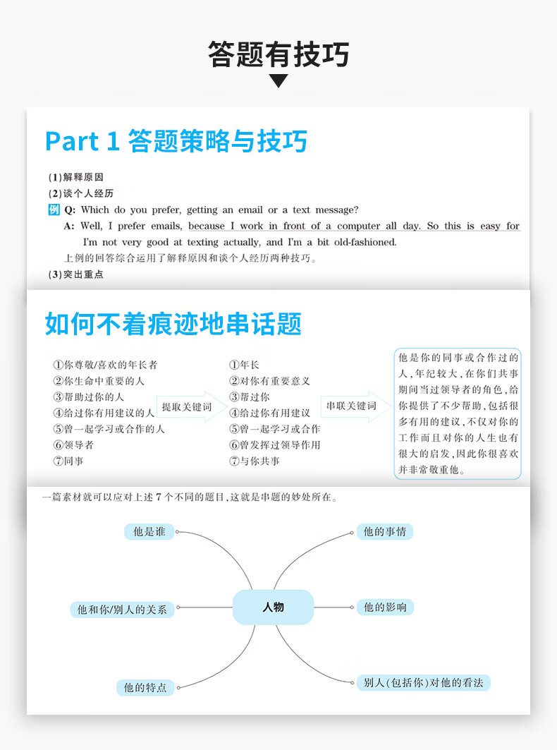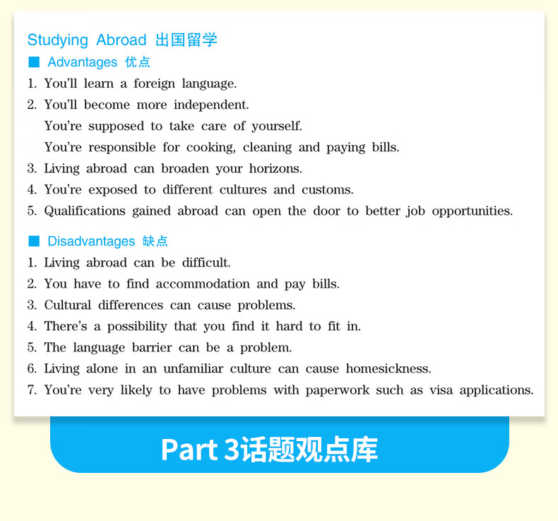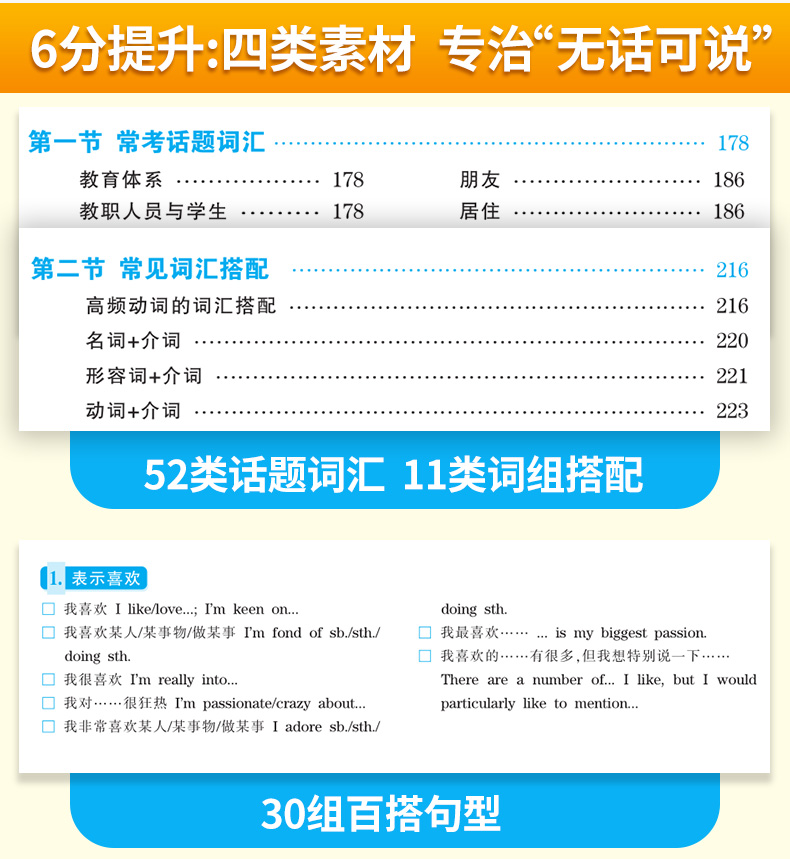 3.提供大量口语素材,包括话题词汇、搭配和句型,以及观点素材,专治“无话可说”和“有话不知怎么说”;