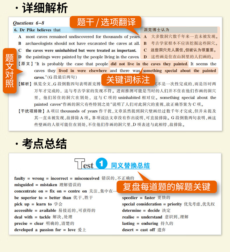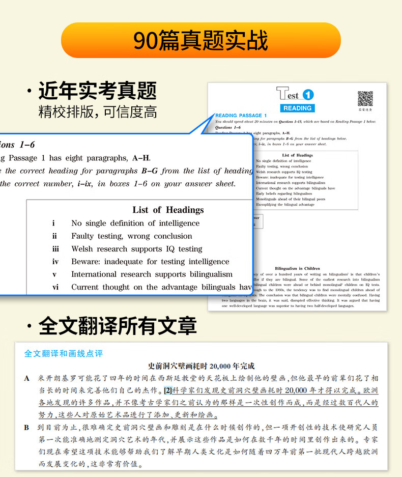 6.收集了90篇近年来的实考雅思阅读机经真题,进行精心校对,还原程度几乎与真题一样,配有全文翻译和详细解析,拆解至少1200个考点、精读了1200个解题句;