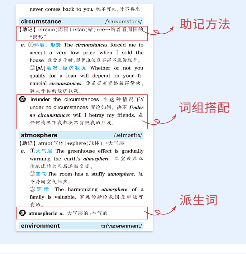 3. 提供同/反义词、真题例句、惯用搭配、固定用法、派生词、近义词辨析和相关词归类等知识点讲解,满足对单词学习的不同需求;