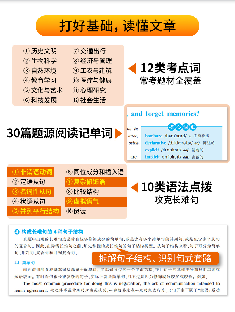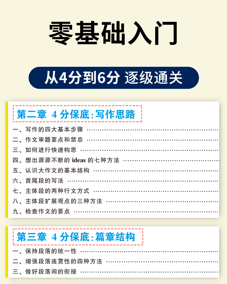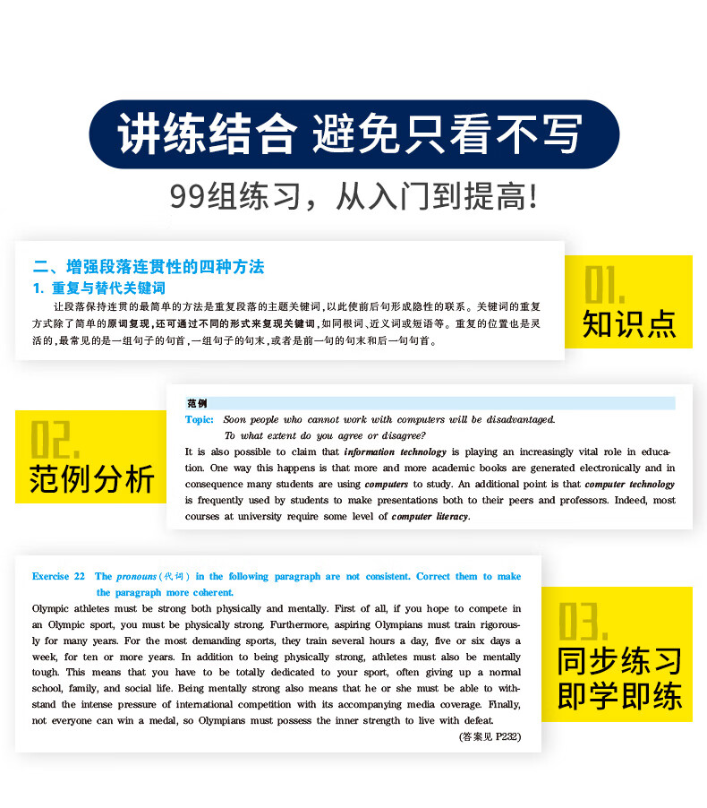 2. 理论结合实际,从写作四大评分原则入手,以“知识点+范例分析+强化训练”的讲解模式,切实有效地提高写作能力,避免只看不写的误区。