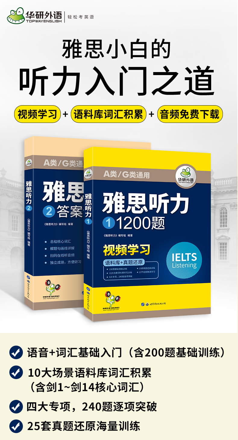 1. 两册装,上册为听力1200题,提供雅思听力考试的理论指导,从语音和词汇入门,积累雅思听力场景词汇,分析命题规律和各题型的解题技巧。有的放矢,有助于考生快速备考。下册为答案详解,答案独立成册,避免来回翻页。